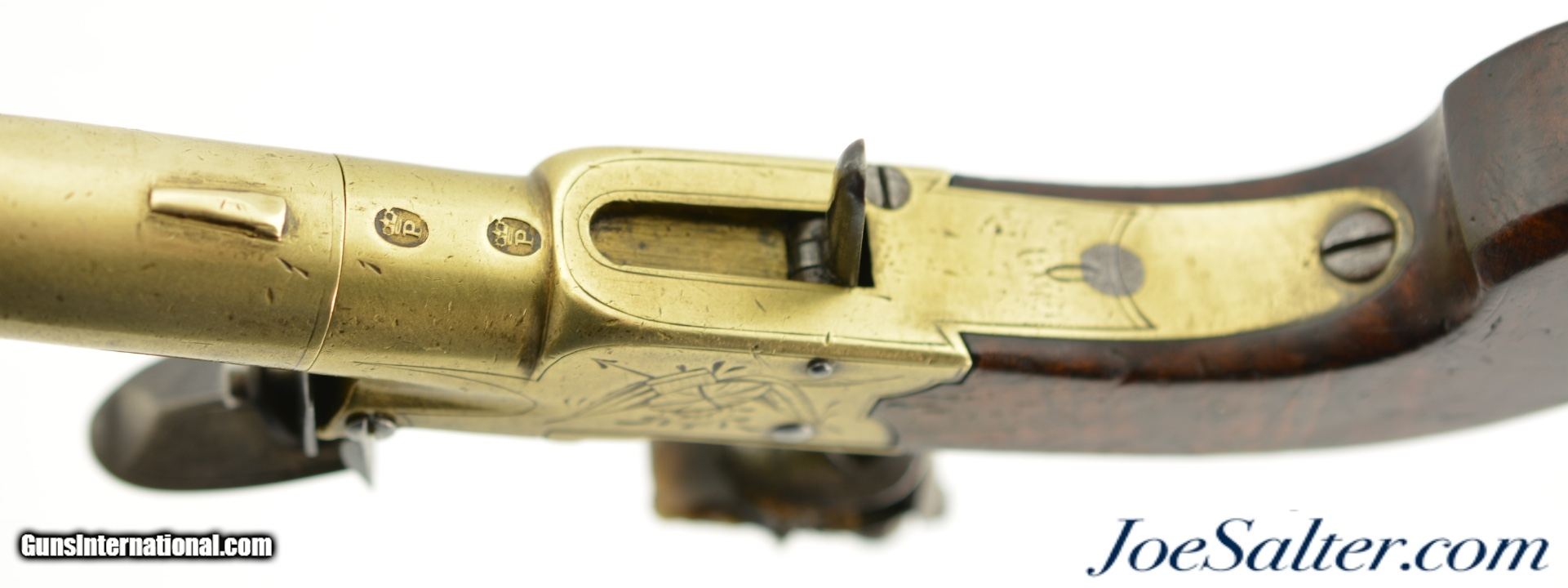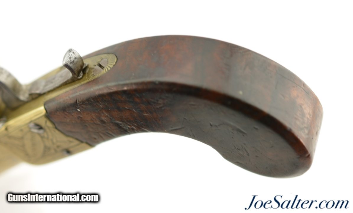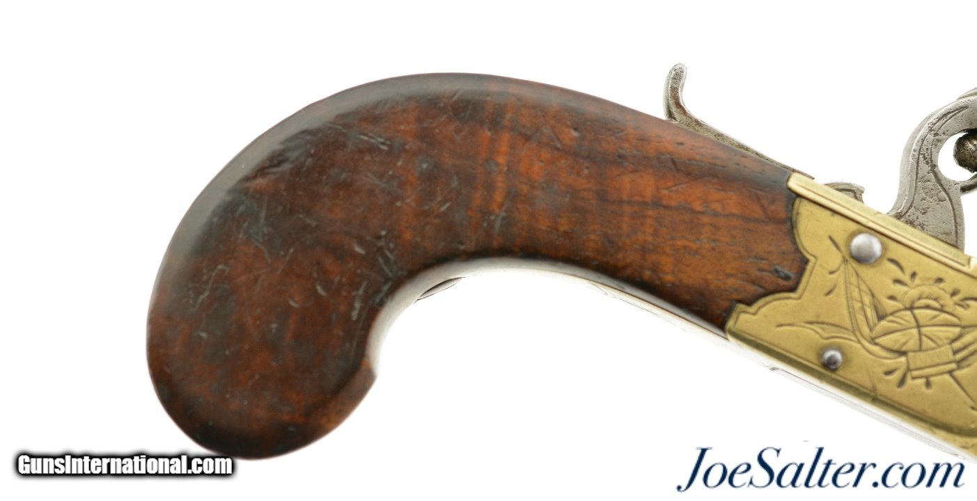 Description: NSN, .45 Caliber, 2 9/16" barrel with an excellent, bright bore. This is an attractive pistol that has an overall pale yellow and ochre patina throughout, with some scattered dark spots throughout. The box frame has a British shield and panoply motif on the right side, and "SIMMONS" on the left. There were two gunmakers in Birmingham in the early 1800s named Simmons: Joseph and John. The bag-shaped, walnut grip has some minor handling marks and blemishes scattered about the original oil finish. The lock and sliding safety are both fully functional. This is a very attractive little pistol, and is in very good-near fine condition overall. Antique SOLD Antique: Yes |