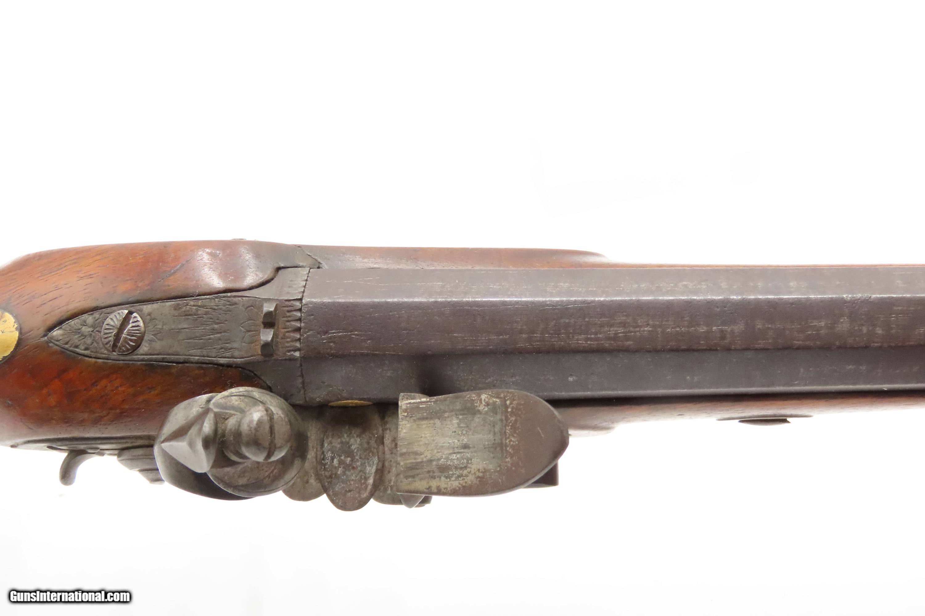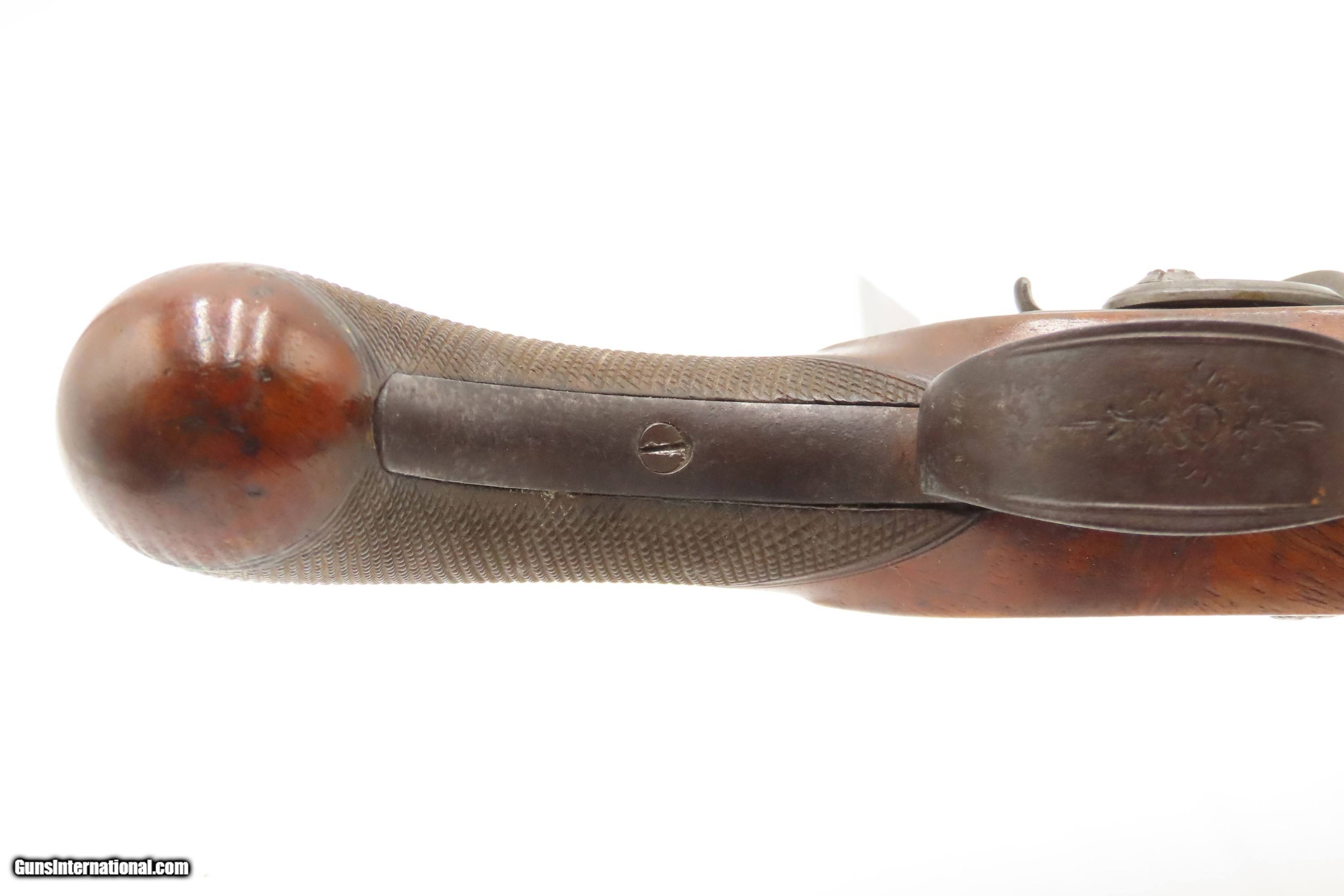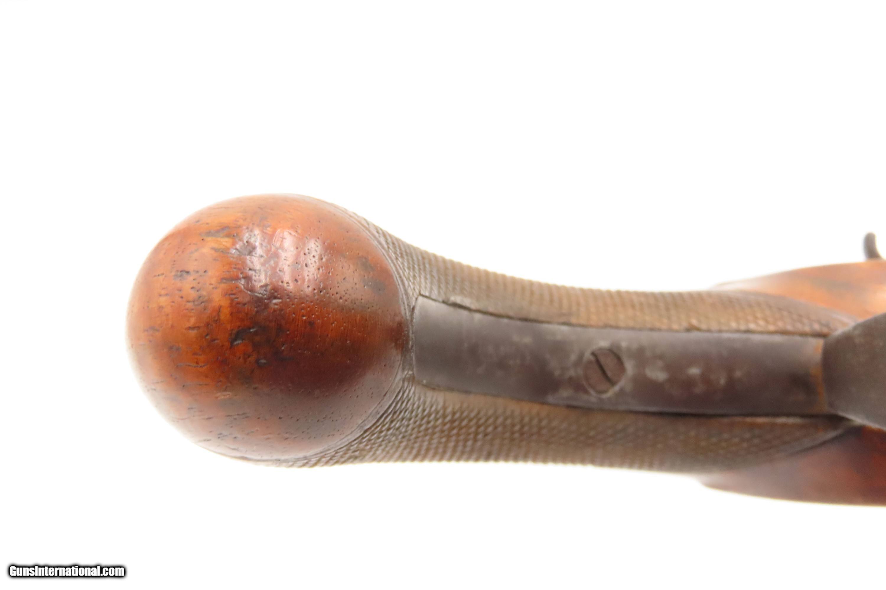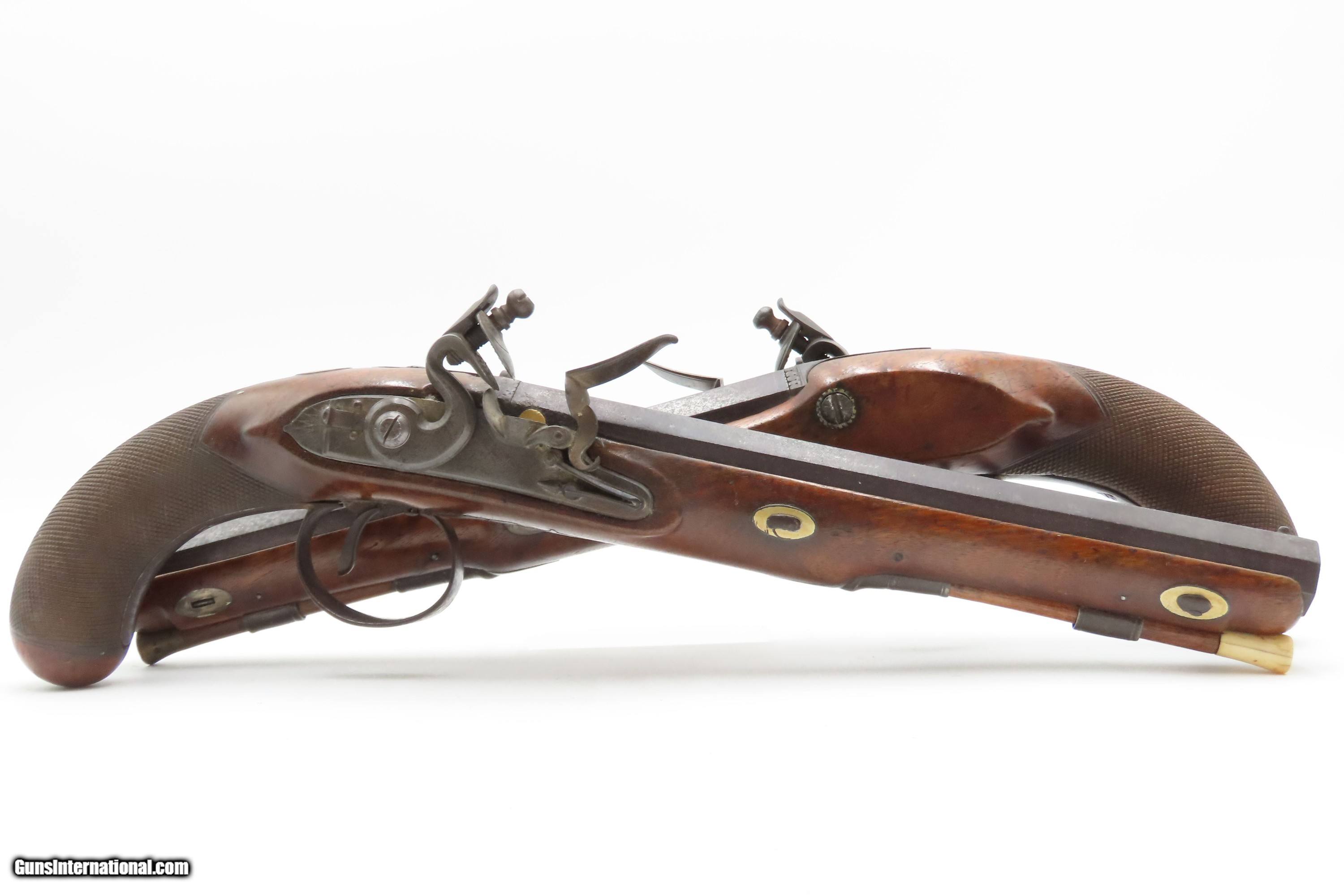 Description: Antique ENGRAVED PAIR British WHEELER Flintlock DUELING/OFFICER’S Pistols HISTORICAL Attractive Late-1700s/Early-1800s BRACE w/ Set Triggers! Here Ancestry Guns presents an antique Pair of Wheeler Flintlock Dueling Pistols, made circa the late 1700s to the early 1800s likely in London, England. Between 1767 and 1813, Robert Wheeler has a shop in London and was known for making box-lock flintlock pocket pistols with under spring bayonets and flintlock dueling pistols. Under Royal Government contract, he was also known for making brass barrel flintlock blunderbusses, flintlock holster pistols, and musketoons. He had a contract with the Hudson's Bay Company for flintlock trade muskets. Wheeler was also one of the sixteen contractors hired by the British Board of Ordnance during the War of 1812 to produce trade guns for Native American allies and delivered a total of 1,491 Northwest Trade Guns between 1813 and 1816. Dueling pistols have a long history, symbolizing a time when honor was what people based their lives on. These pistols were designed for one purpose, which was deciding disputes when words failed. Throughout Europe and early America, dueling was a deadly tradition that truly shaped history. The pistols themselves became legendary, often linked to dramatic confrontations where skill, nerve, and fate collided. Each of these played a role in moments where lives and reputations hung in the balance, leaving a lasting mark on history. For a great example, look how United States history was impacted by Alexander Hamilton. Purpose-built dueling pistols have various improvements to make them more reliable and accurate, such as longer and heavier barrels, spurs on the trigger guards, saw handles, platinum-lined touch-holes on the flintlock, and hair triggers. All component parts were manufactured, hand-finished and then adjusted with great care and precision, which made dueling pistols much more costly than standard firearms of the period. Special care was taken when molding the lead bullets to ensure that there were no voids which would affect accuracy. Pistols were carefully and identically loaded, and each duelist was offered his choice of the indistinguishable loaded pistols. As duels were generally fought at short distances which were paced out, typically 35 to 45 feet between stationary opponents, extreme accuracy was not required. Here are two nice examples of European craftsmanship. Both of these pistols are matching, feature engravings and checkered grips. The overall condition of this set of pistols is very good. Both actions are strong. Fully functioning set triggers. Both bores are in good shape for their ages and remain smooth. Original dark brown patinas. One pistols has a stable repaired crack at the rear barrel pin. Both stocks are very good with light handling evidence and a checkered grip. Markings are legible. Own the original! This is a legitimate antique and not a reproduction. Barrels are 9 inches. Caliber: .63 Flintlock Overall condition as seen in photos. Very Fast. Very Safe. FREE SHIPPING WORLDWIDE. Delivered directly to your door by express mail! Guaranteed AUTHENTIC & Includes CERTIFICATE OF AUTHENTICITY. $5350 #259665 Curio/Relic: Yes Antique: Yes Price: $5,350.00 Buy Now Pay with