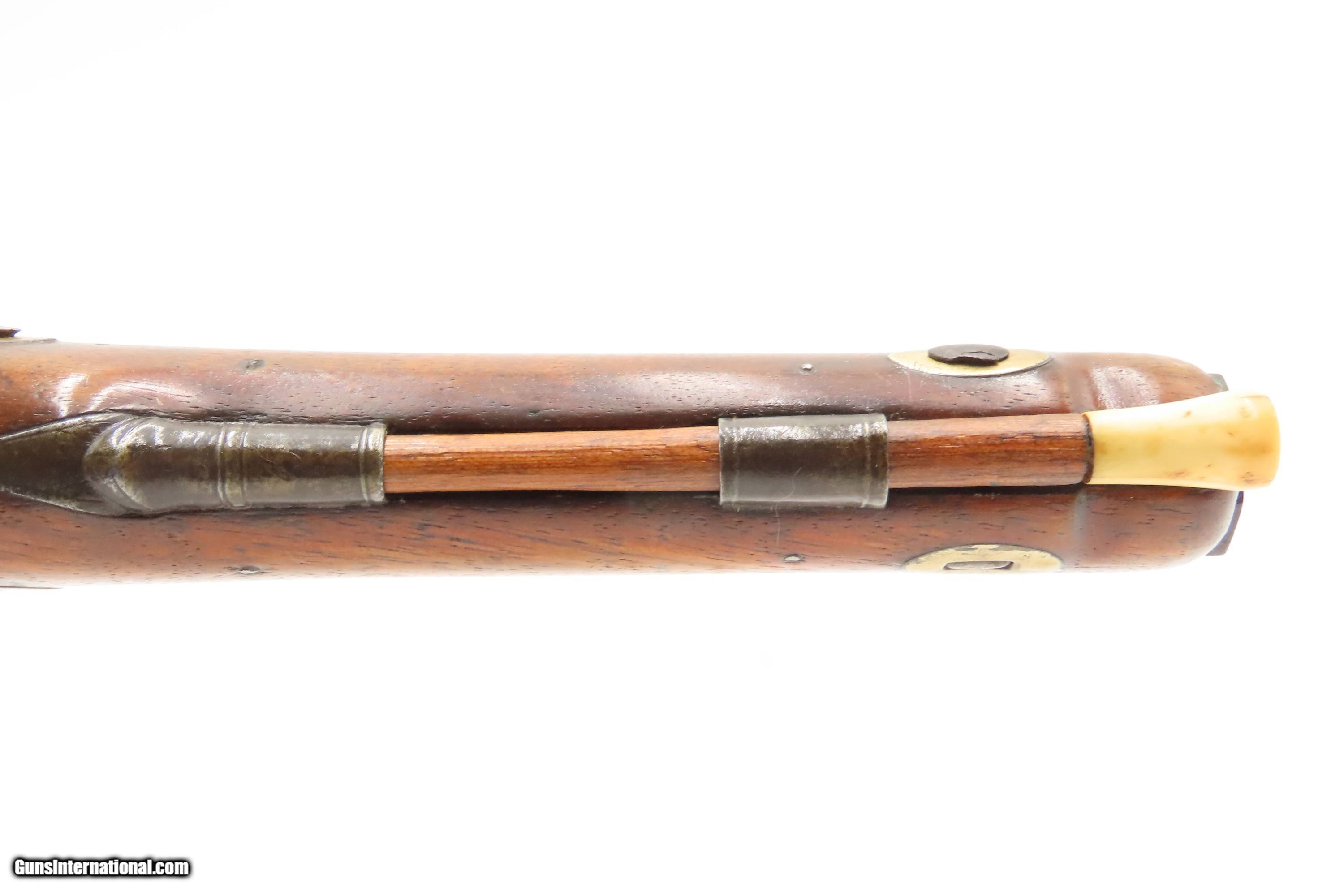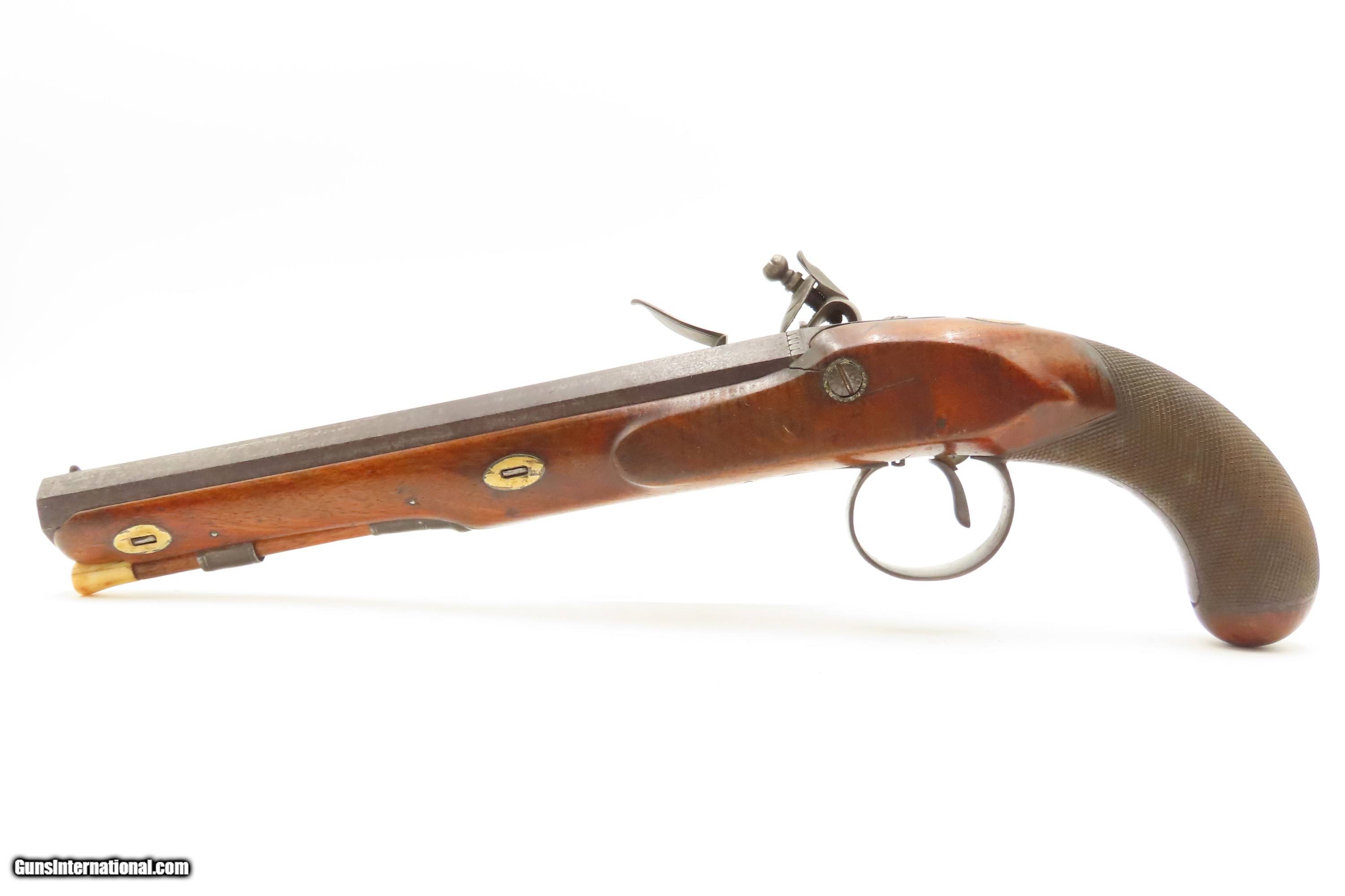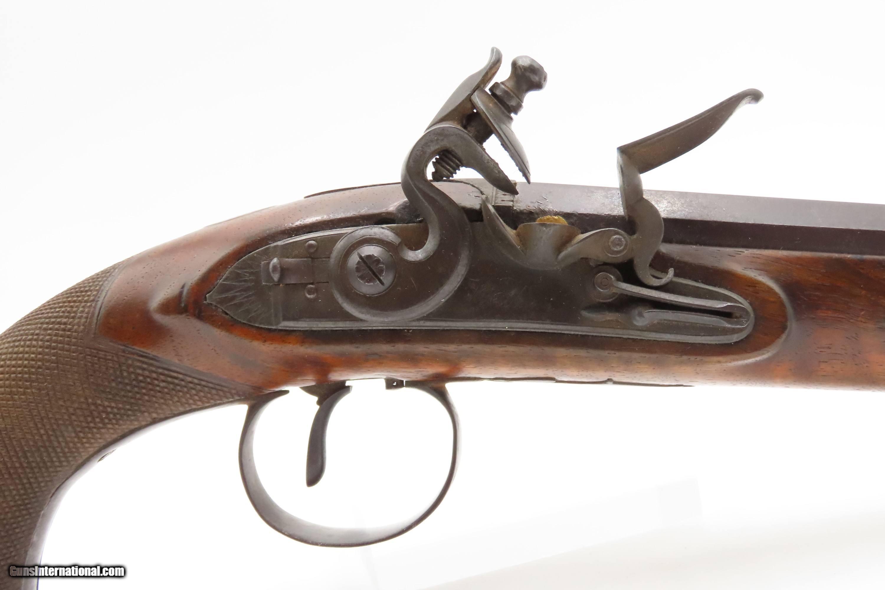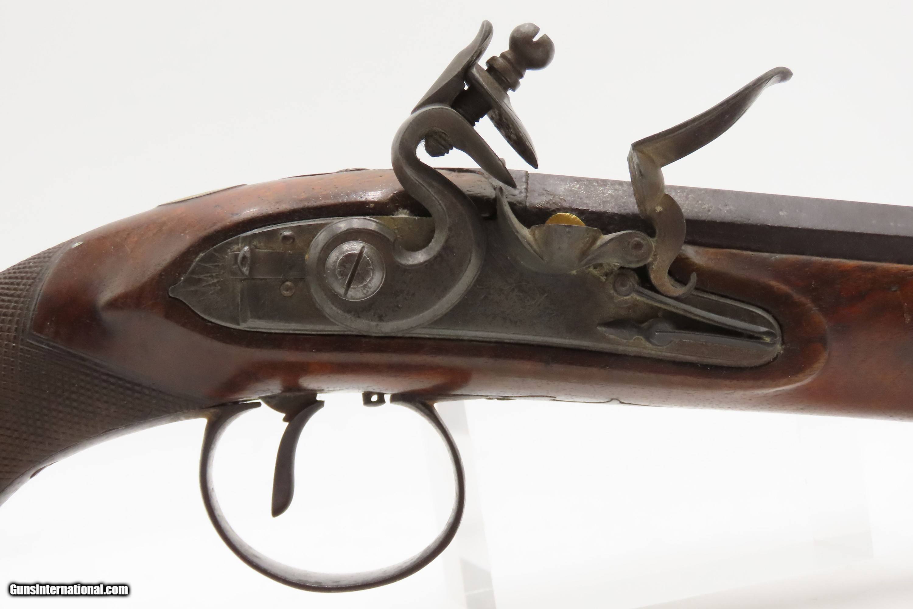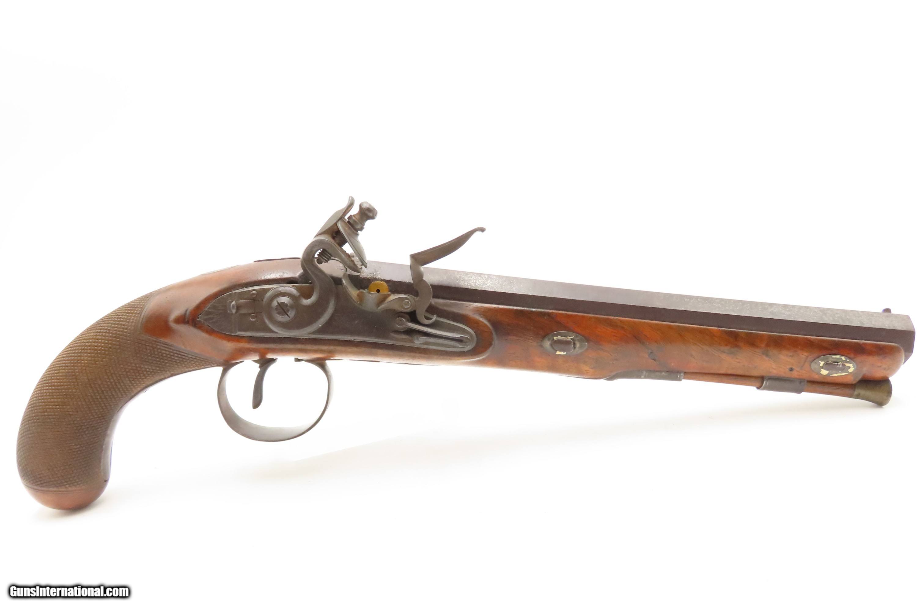 Description: Antique ENGRAVED PAIR British WHEELER Flintlock DUELING/OFFICER’S Pistols HISTORICAL Attractive Late-1700s/Early-1800s BRACE w/ Set Triggers! Here Ancestry Guns presents an antique Pair of Wheeler Flintlock Dueling Pistols, made circa the late 1700s to the early 1800s likely in London, England. Between 1767 and 1813, Robert Wheeler has a shop in London and was known for making box-lock flintlock pocket pistols with under spring bayonets and flintlock dueling pistols. Under Royal Government contract, he was also known for making brass barrel flintlock blunderbusses, flintlock holster pistols, and musketoons. He had a contract with the Hudson's Bay Company for flintlock trade muskets. Wheeler was also one of the sixteen contractors hired by the British Board of Ordnance during the War of 1812 to produce trade guns for Native American allies and delivered a total of 1,491 Northwest Trade Guns between 1813 and 1816. Dueling pistols have a long history, symbolizing a time when honor was what people based their lives on. These pistols were designed for one purpose, which was deciding disputes when words failed. Throughout Europe and early America, dueling was a deadly tradition that truly shaped history. The pistols themselves became legendary, often linked to dramatic confrontations where skill, nerve, and fate collided. Each of these played a role in moments where lives and reputations hung in the balance, leaving a lasting mark on history. For a great example, look how United States history was impacted by Alexander Hamilton. Purpose-built dueling pistols have various improvements to make them more reliable and accurate, such as longer and heavier barrels, spurs on the trigger guards, saw handles, platinum-lined touch-holes on the flintlock, and hair triggers. All component parts were manufactured, hand-finished and then adjusted with great care and precision, which made dueling pistols much more costly than standard firearms of the period. Special care was taken when molding the lead bullets to ensure that there were no voids which would affect accuracy. Pistols were carefully and identically loaded, and each duelist was offered his choice of the indistinguishable loaded pistols. As duels were generally fought at short distances which were paced out, typically 35 to 45 feet between stationary opponents, extreme accuracy was not required. Here are two nice examples of European craftsmanship. Both of these pistols are matching, feature engravings and checkered grips. The overall condition of this set of pistols is very good. Both actions are strong. Fully functioning set triggers. Both bores are in good shape for their ages and remain smooth. Original dark brown patinas. One pistols has a stable repaired crack at the rear barrel pin. Both stocks are very good with light handling evidence and a checkered grip. Markings are legible. Own the original! This is a legitimate antique and not a reproduction. Barrels are 9 inches. Caliber: .63 Flintlock Overall condition as seen in photos. Very Fast. Very Safe. FREE SHIPPING WORLDWIDE. Delivered directly to your door by express mail! Guaranteed AUTHENTIC & Includes CERTIFICATE OF AUTHENTICITY. $5350 #259665 Curio/Relic: Yes Antique: Yes Price: $5,350.00 Buy Now Pay with