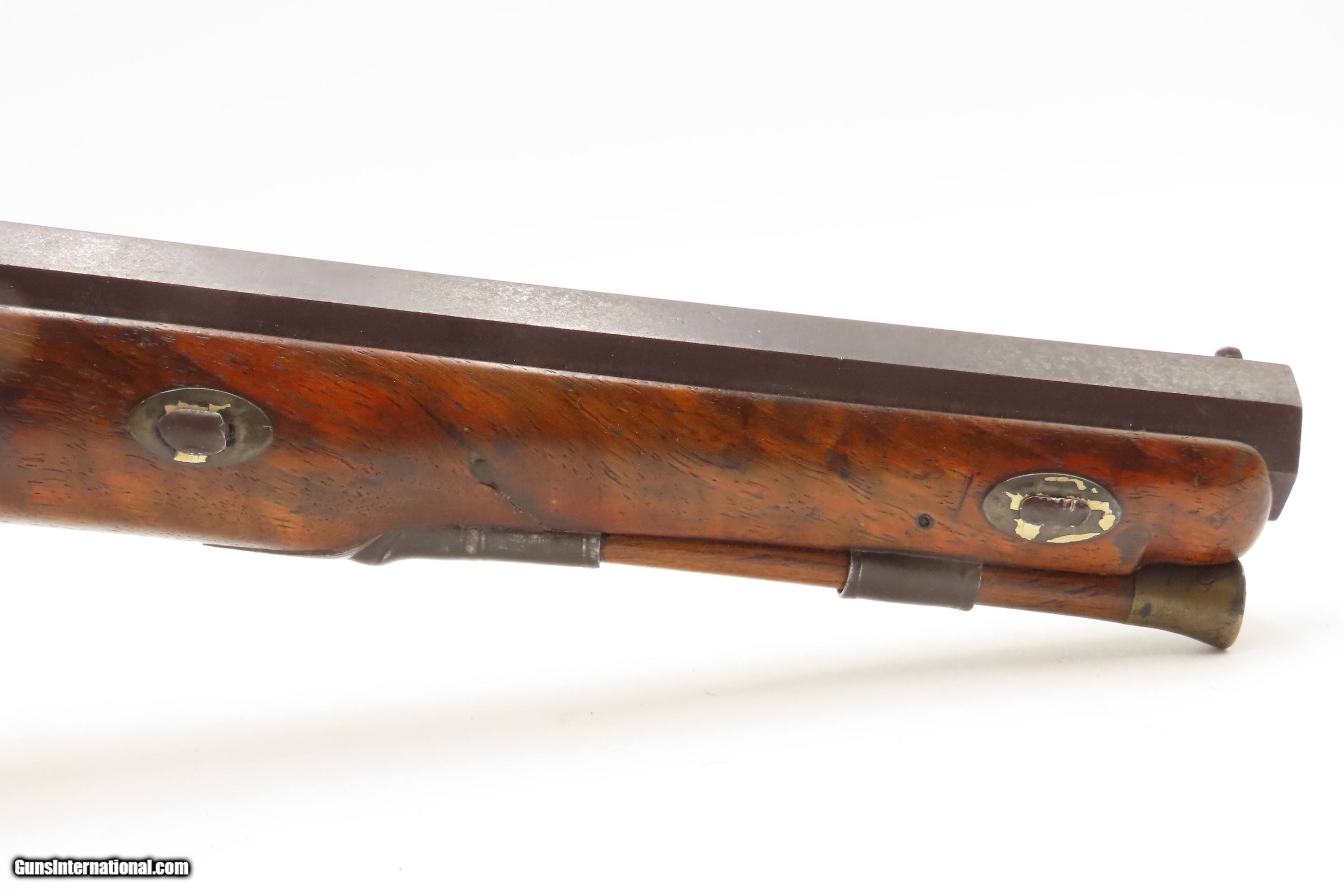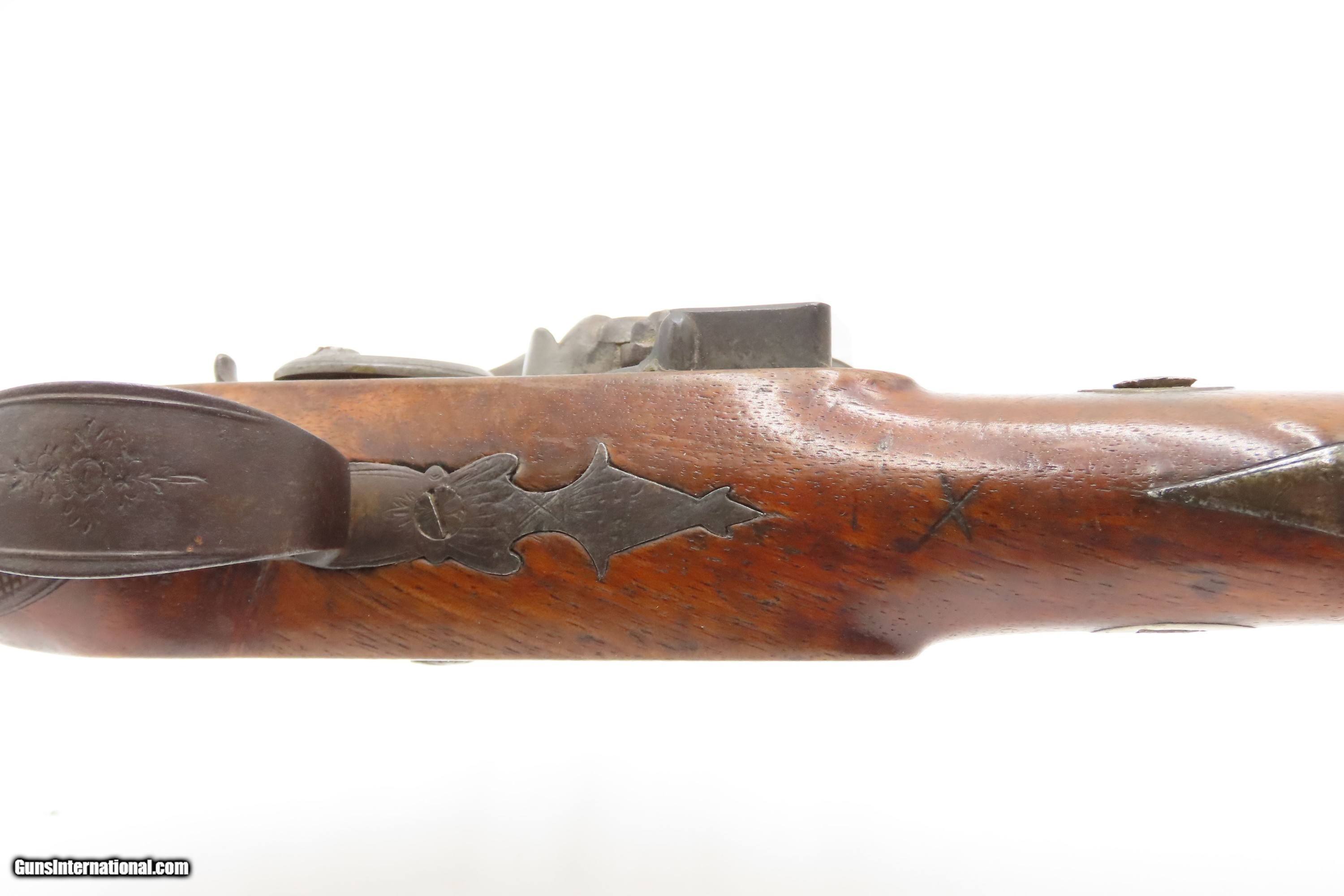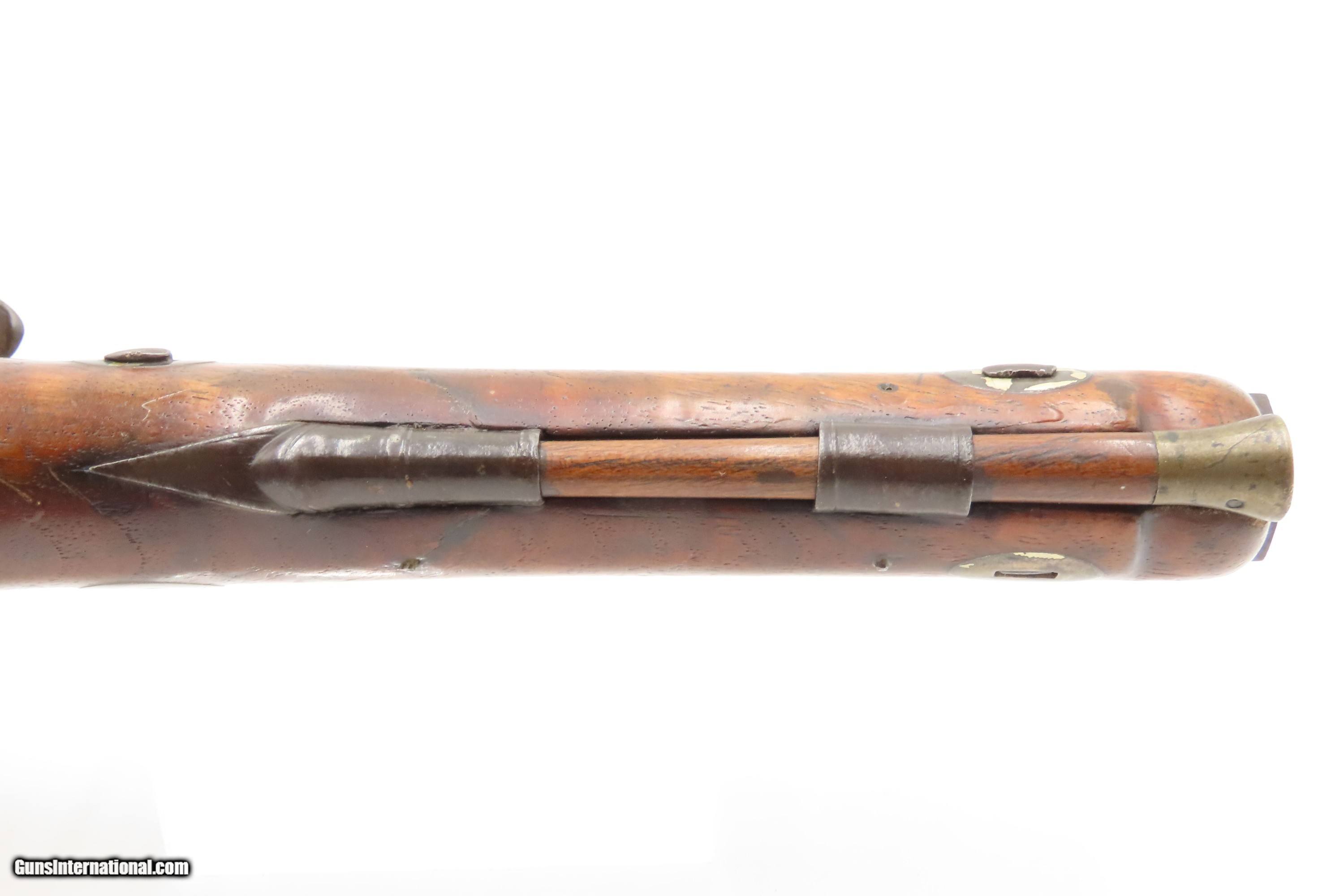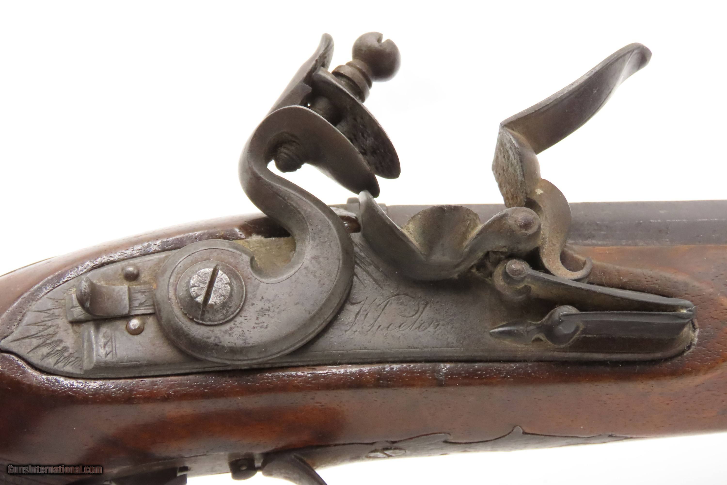 Description: Antique ENGRAVED PAIR British WHEELER Flintlock DUELING/OFFICER’S Pistols HISTORICAL Attractive Late-1700s/Early-1800s BRACE w/ Set Triggers! Here Ancestry Guns presents an antique Pair of Wheeler Flintlock Dueling Pistols, made circa the late 1700s to the early 1800s likely in London, England. Between 1767 and 1813, Robert Wheeler has a shop in London and was known for making box-lock flintlock pocket pistols with under spring bayonets and flintlock dueling pistols. Under Royal Government contract, he was also known for making brass barrel flintlock blunderbusses, flintlock holster pistols, and musketoons. He had a contract with the Hudson's Bay Company for flintlock trade muskets. Wheeler was also one of the sixteen contractors hired by the British Board of Ordnance during the War of 1812 to produce trade guns for Native American allies and delivered a total of 1,491 Northwest Trade Guns between 1813 and 1816. Dueling pistols have a long history, symbolizing a time when honor was what people based their lives on. These pistols were designed for one purpose, which was deciding disputes when words failed. Throughout Europe and early America, dueling was a deadly tradition that truly shaped history. The pistols themselves became legendary, often linked to dramatic confrontations where skill, nerve, and fate collided. Each of these played a role in moments where lives and reputations hung in the balance, leaving a lasting mark on history. For a great example, look how United States history was impacted by Alexander Hamilton. Purpose-built dueling pistols have various improvements to make them more reliable and accurate, such as longer and heavier barrels, spurs on the trigger guards, saw handles, platinum-lined touch-holes on the flintlock, and hair triggers. All component parts were manufactured, hand-finished and then adjusted with great care and precision, which made dueling pistols much more costly than standard firearms of the period. Special care was taken when molding the lead bullets to ensure that there were no voids which would affect accuracy. Pistols were carefully and identically loaded, and each duelist was offered his choice of the indistinguishable loaded pistols. As duels were generally fought at short distances which were paced out, typically 35 to 45 feet between stationary opponents, extreme accuracy was not required. Here are two nice examples of European craftsmanship. Both of these pistols are matching, feature engravings and checkered grips. The overall condition of this set of pistols is very good. Both actions are strong. Fully functioning set triggers. Both bores are in good shape for their ages and remain smooth. Original dark brown patinas. One pistols has a stable repaired crack at the rear barrel pin. Both stocks are very good with light handling evidence and a checkered grip. Markings are legible. Own the original! This is a legitimate antique and not a reproduction. Barrels are 9 inches. Caliber: .63 Flintlock Overall condition as seen in photos. Very Fast. Very Safe. FREE SHIPPING WORLDWIDE. Delivered directly to your door by express mail! Guaranteed AUTHENTIC & Includes CERTIFICATE OF AUTHENTICITY. $5350 #259665 Curio/Relic: Yes Antique: Yes Price: $5,350.00 Buy Now Pay with