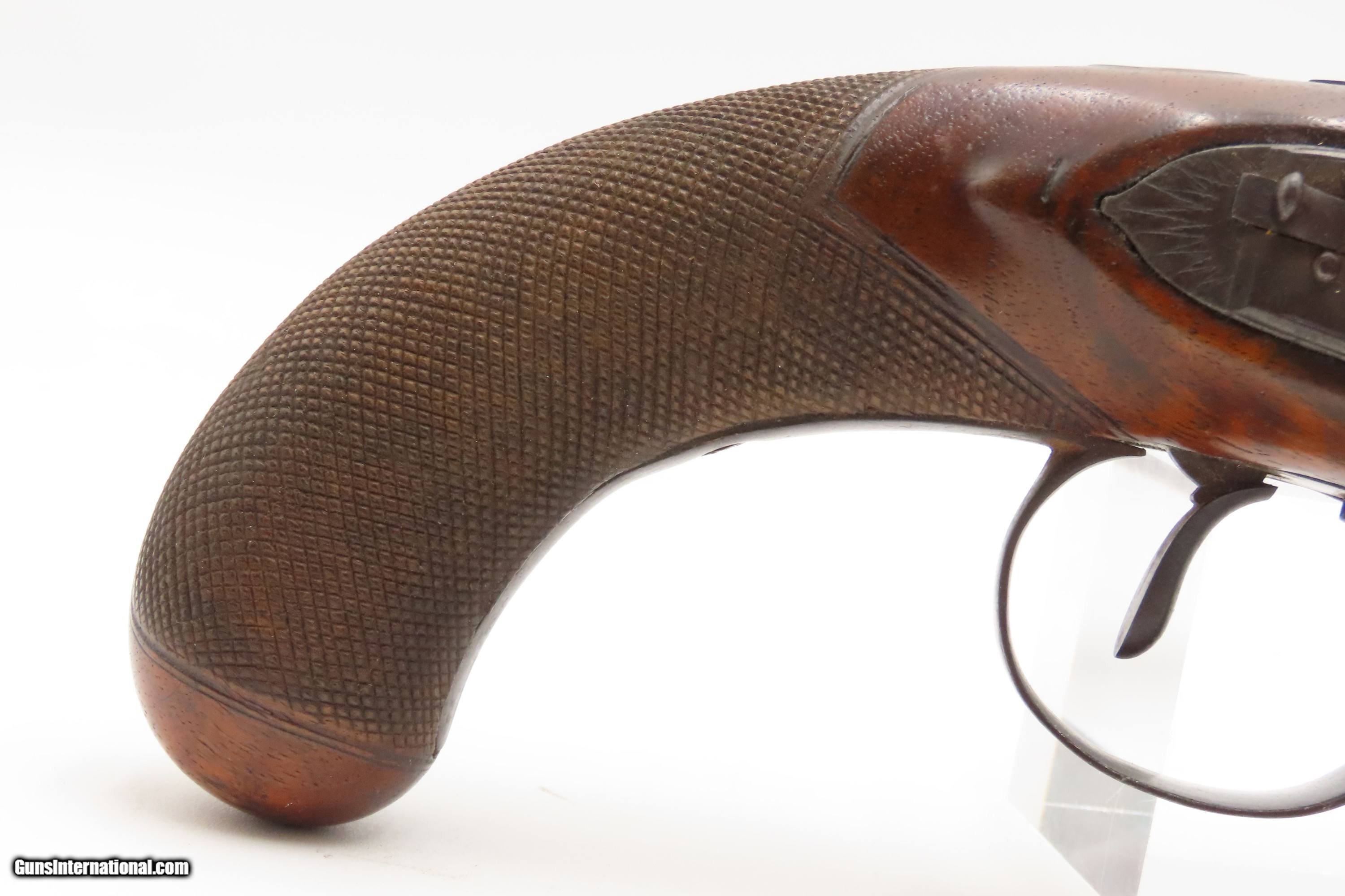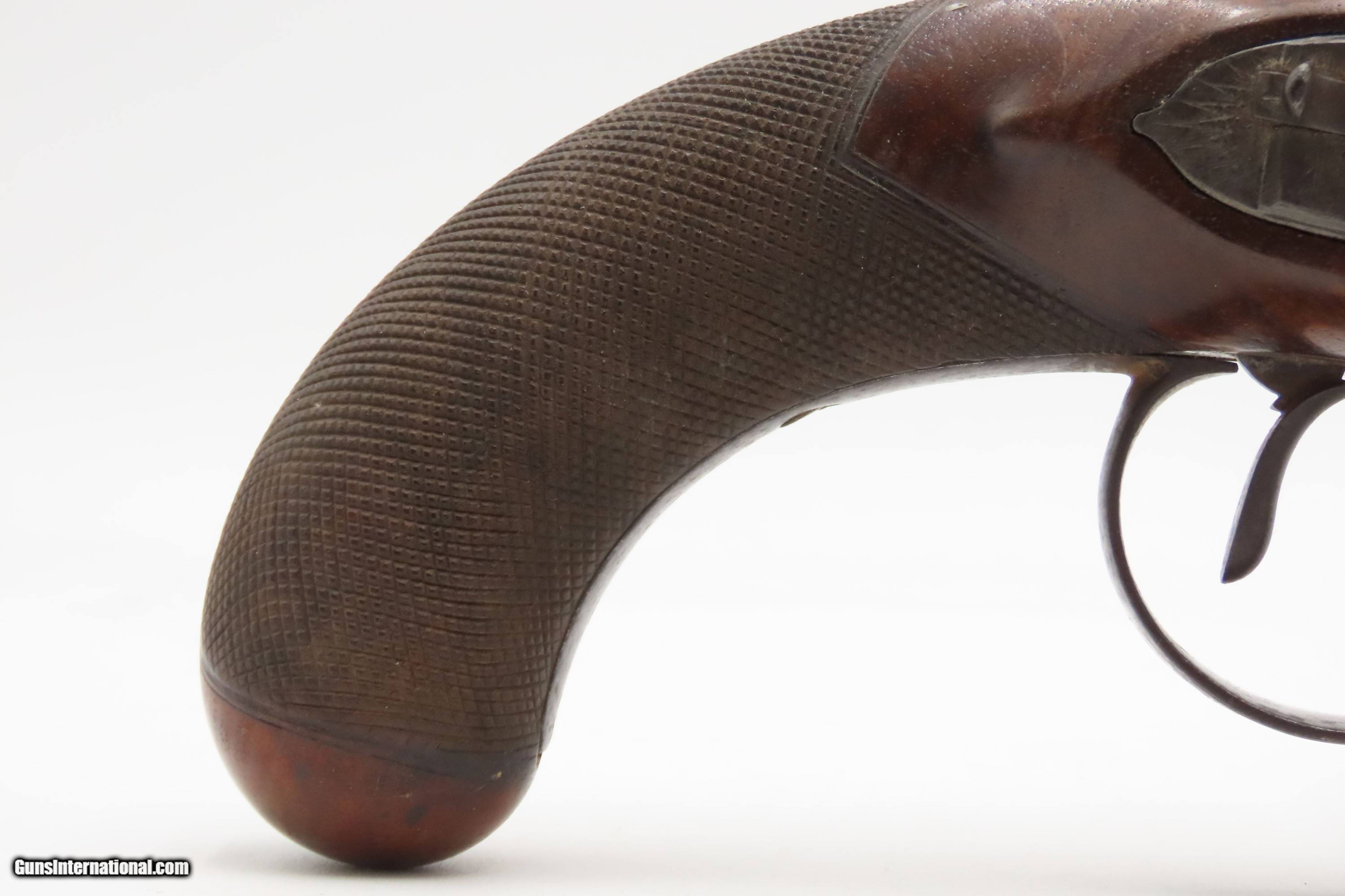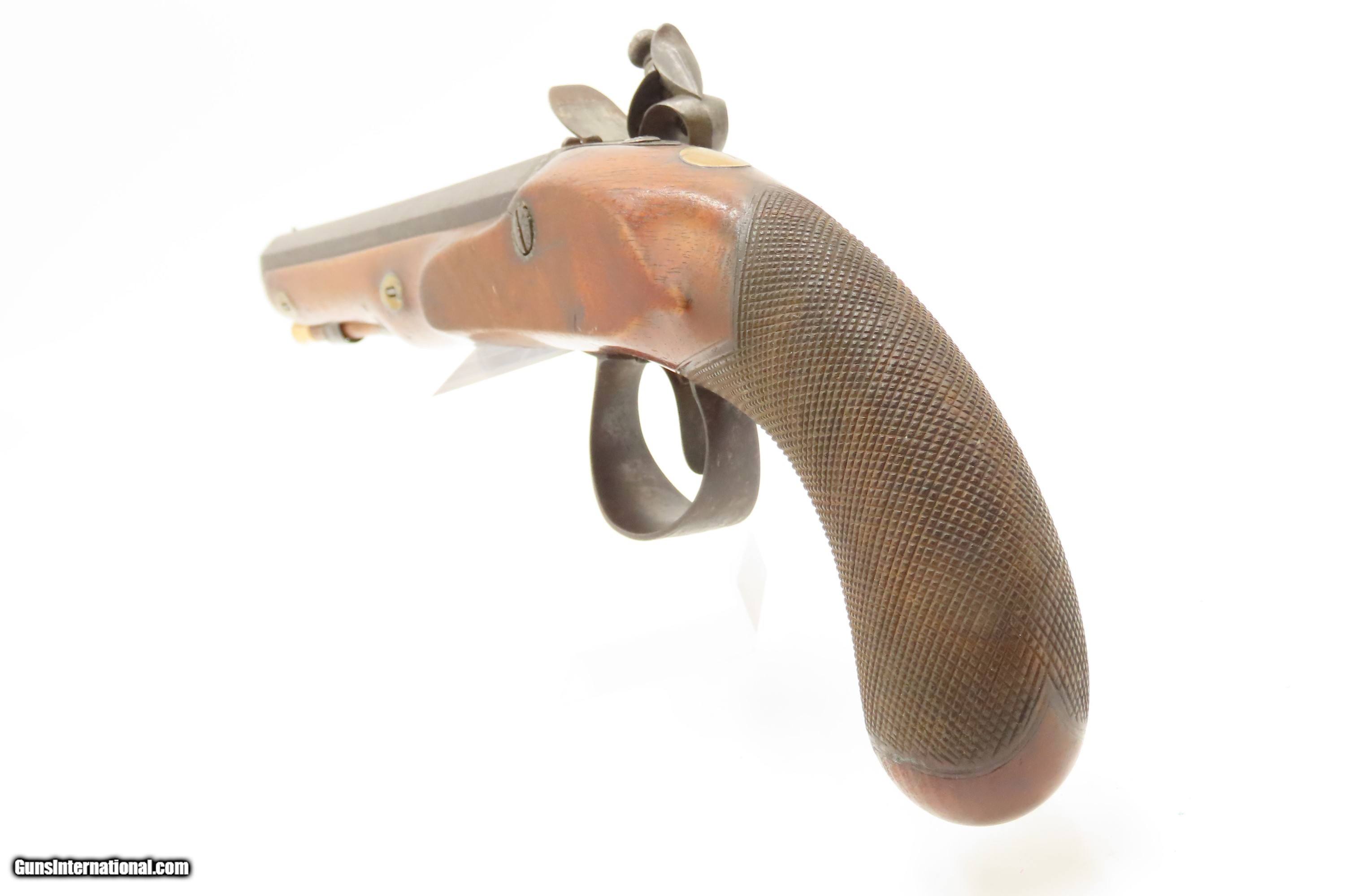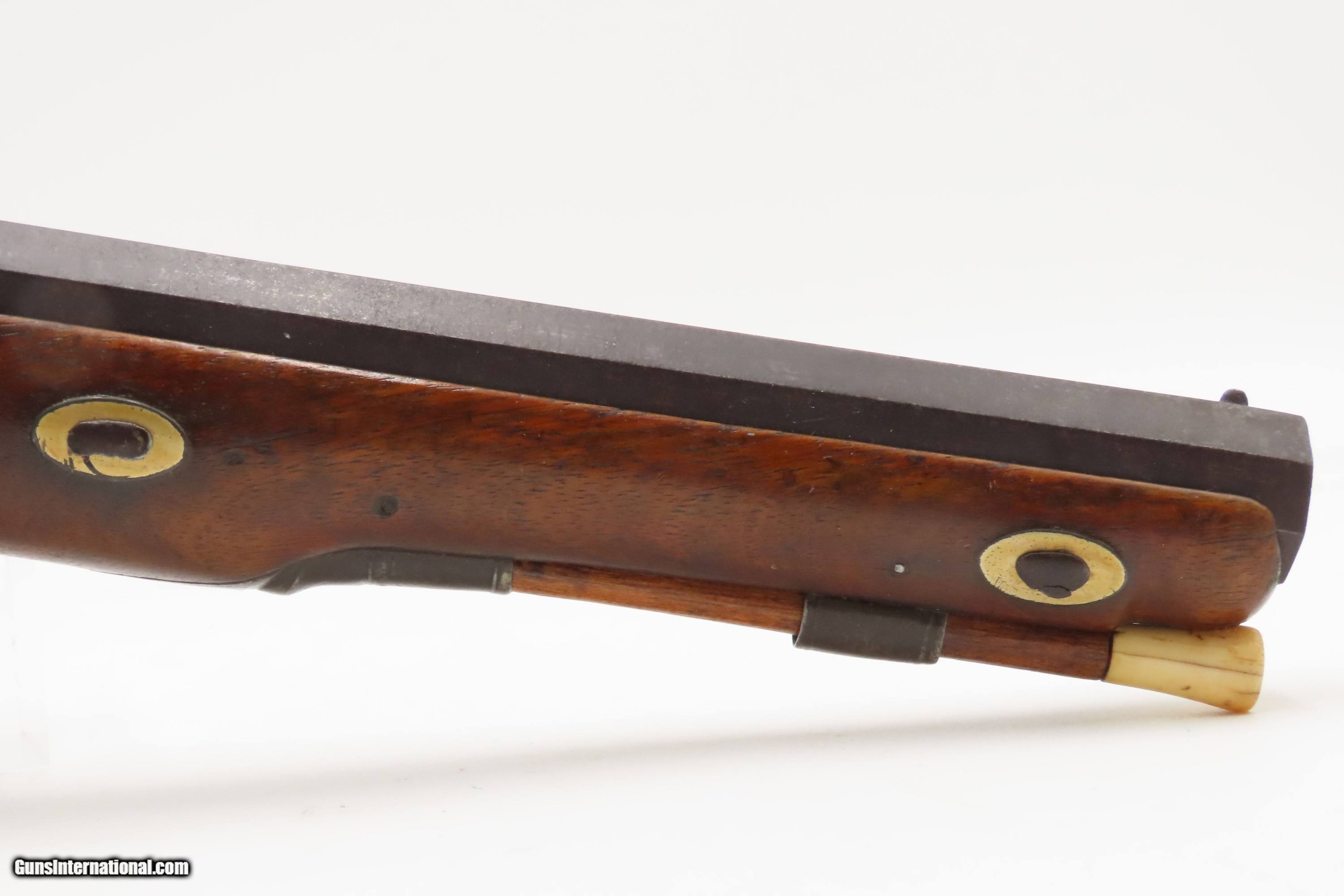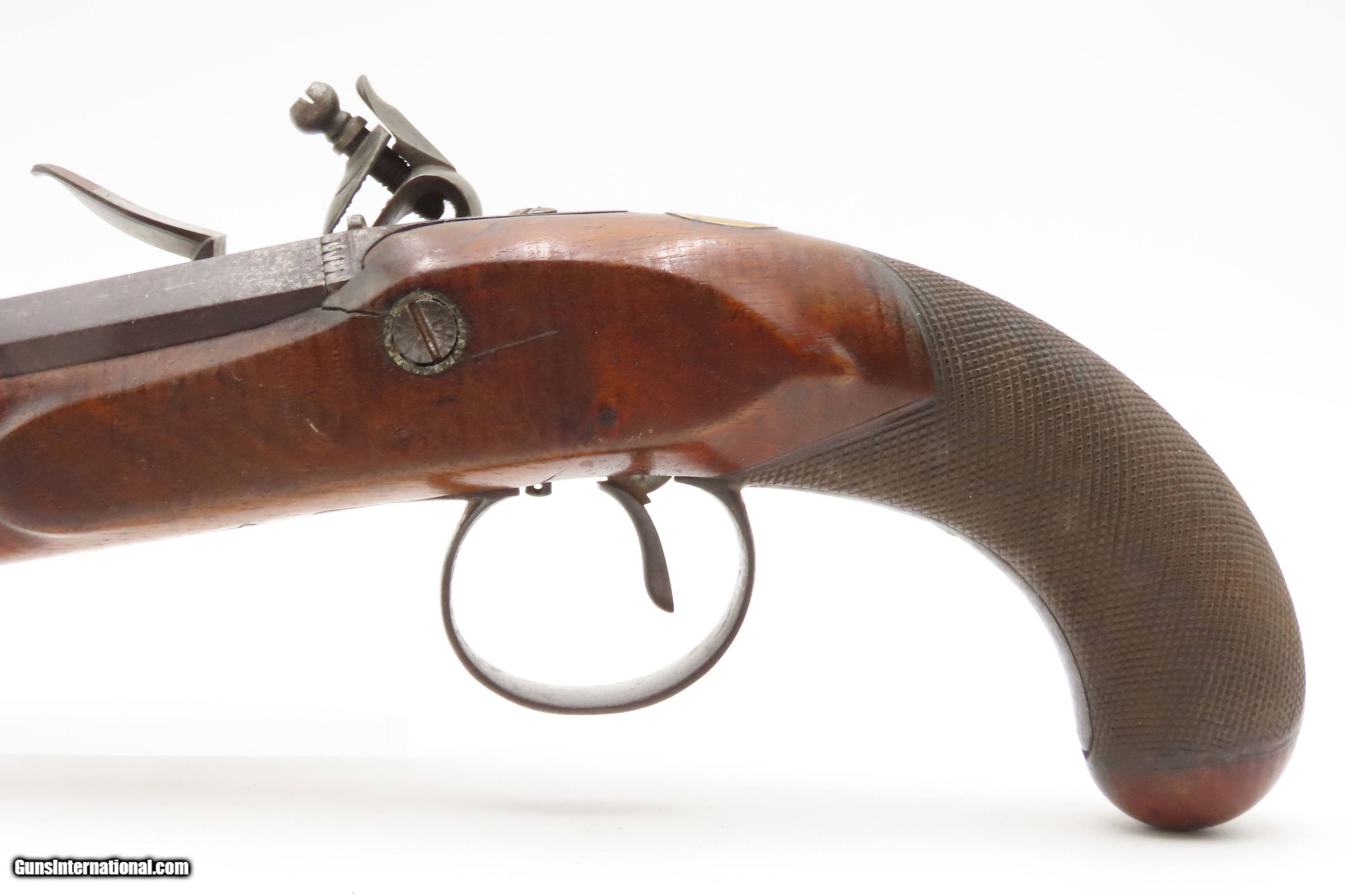 Description: Antique ENGRAVED PAIR British WHEELER Flintlock DUELING/OFFICER’S Pistols HISTORICAL Attractive Late-1700s/Early-1800s BRACE w/ Set Triggers! Here Ancestry Guns presents an antique Pair of Wheeler Flintlock Dueling Pistols, made circa the late 1700s to the early 1800s likely in London, England. Between 1767 and 1813, Robert Wheeler has a shop in London and was known for making box-lock flintlock pocket pistols with under spring bayonets and flintlock dueling pistols. Under Royal Government contract, he was also known for making brass barrel flintlock blunderbusses, flintlock holster pistols, and musketoons. He had a contract with the Hudson's Bay Company for flintlock trade muskets. Wheeler was also one of the sixteen contractors hired by the British Board of Ordnance during the War of 1812 to produce trade guns for Native American allies and delivered a total of 1,491 Northwest Trade Guns between 1813 and 1816. Dueling pistols have a long history, symbolizing a time when honor was what people based their lives on. These pistols were designed for one purpose, which was deciding disputes when words failed. Throughout Europe and early America, dueling was a deadly tradition that truly shaped history. The pistols themselves became legendary, often linked to dramatic confrontations where skill, nerve, and fate collided. Each of these played a role in moments where lives and reputations hung in the balance, leaving a lasting mark on history. For a great example, look how United States history was impacted by Alexander Hamilton. Purpose-built dueling pistols have various improvements to make them more reliable and accurate, such as longer and heavier barrels, spurs on the trigger guards, saw handles, platinum-lined touch-holes on the flintlock, and hair triggers. All component parts were manufactured, hand-finished and then adjusted with great care and precision, which made dueling pistols much more costly than standard firearms of the period. Special care was taken when molding the lead bullets to ensure that there were no voids which would affect accuracy. Pistols were carefully and identically loaded, and each duelist was offered his choice of the indistinguishable loaded pistols. As duels were generally fought at short distances which were paced out, typically 35 to 45 feet between stationary opponents, extreme accuracy was not required. Here are two nice examples of European craftsmanship. Both of these pistols are matching, feature engravings and checkered grips. The overall condition of this set of pistols is very good. Both actions are strong. Fully functioning set triggers. Both bores are in good shape for their ages and remain smooth. Original dark brown patinas. One pistols has a stable repaired crack at the rear barrel pin. Both stocks are very good with light handling evidence and a checkered grip. Markings are legible. Own the original! This is a legitimate antique and not a reproduction. Barrels are 9 inches. Caliber: .63 Flintlock Overall condition as seen in photos. Very Fast. Very Safe. FREE SHIPPING WORLDWIDE. Delivered directly to your door by express mail! Guaranteed AUTHENTIC & Includes CERTIFICATE OF AUTHENTICITY. $5350 #259665 Curio/Relic: Yes Antique: Yes Price: $5,350.00 Buy Now Pay with