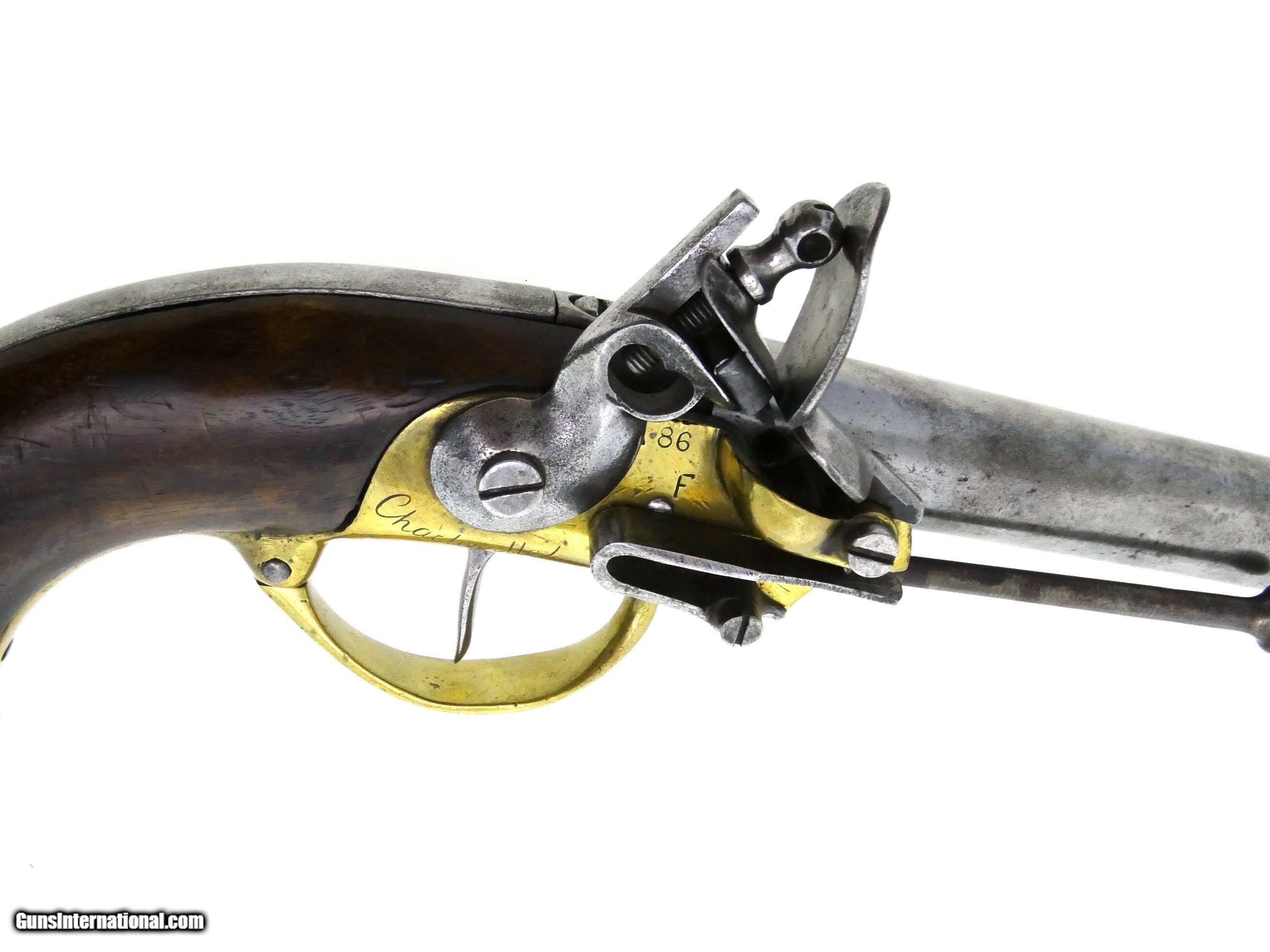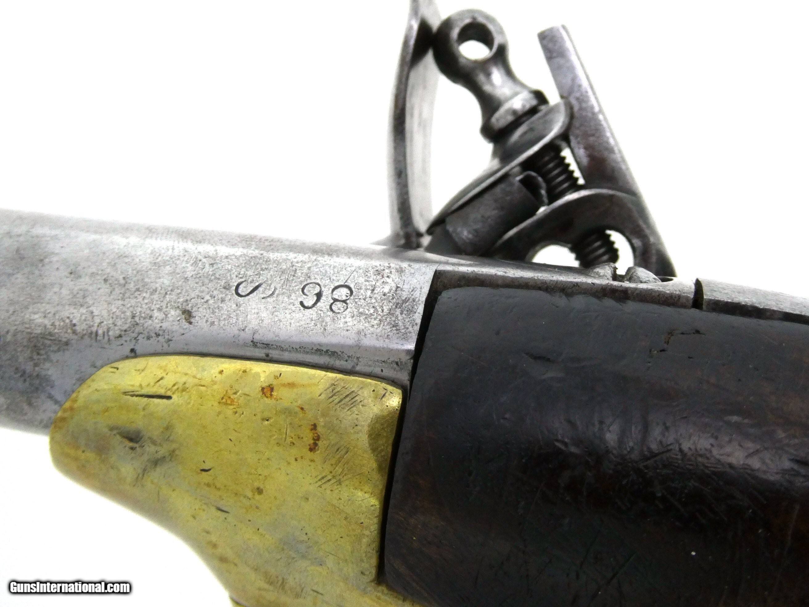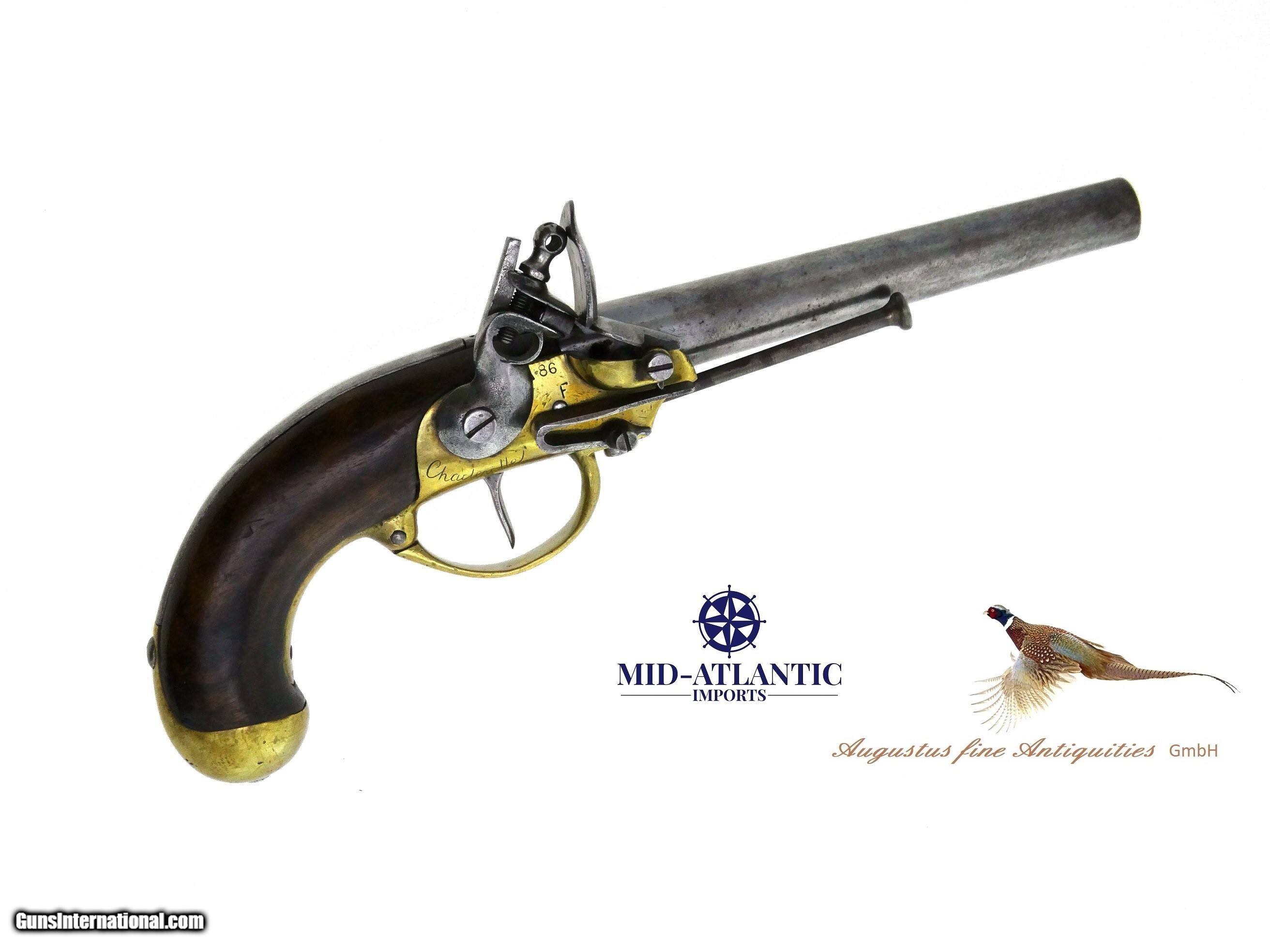 Description: Original French model 1777 cavalry flintlock pistol in good condition. Classic revolutionary war pistol in not over-cleaned condition, attractive for collectors. Ram rod may be a reproduction or later period replacement. Good bore with some patina, lock in good working order, clear markings, cal. 18mm. Add this historic firearm to your collection. Offers considered. Antique: Yes Price: $1,243.00 Shipping: $45.00 Contact Seller |