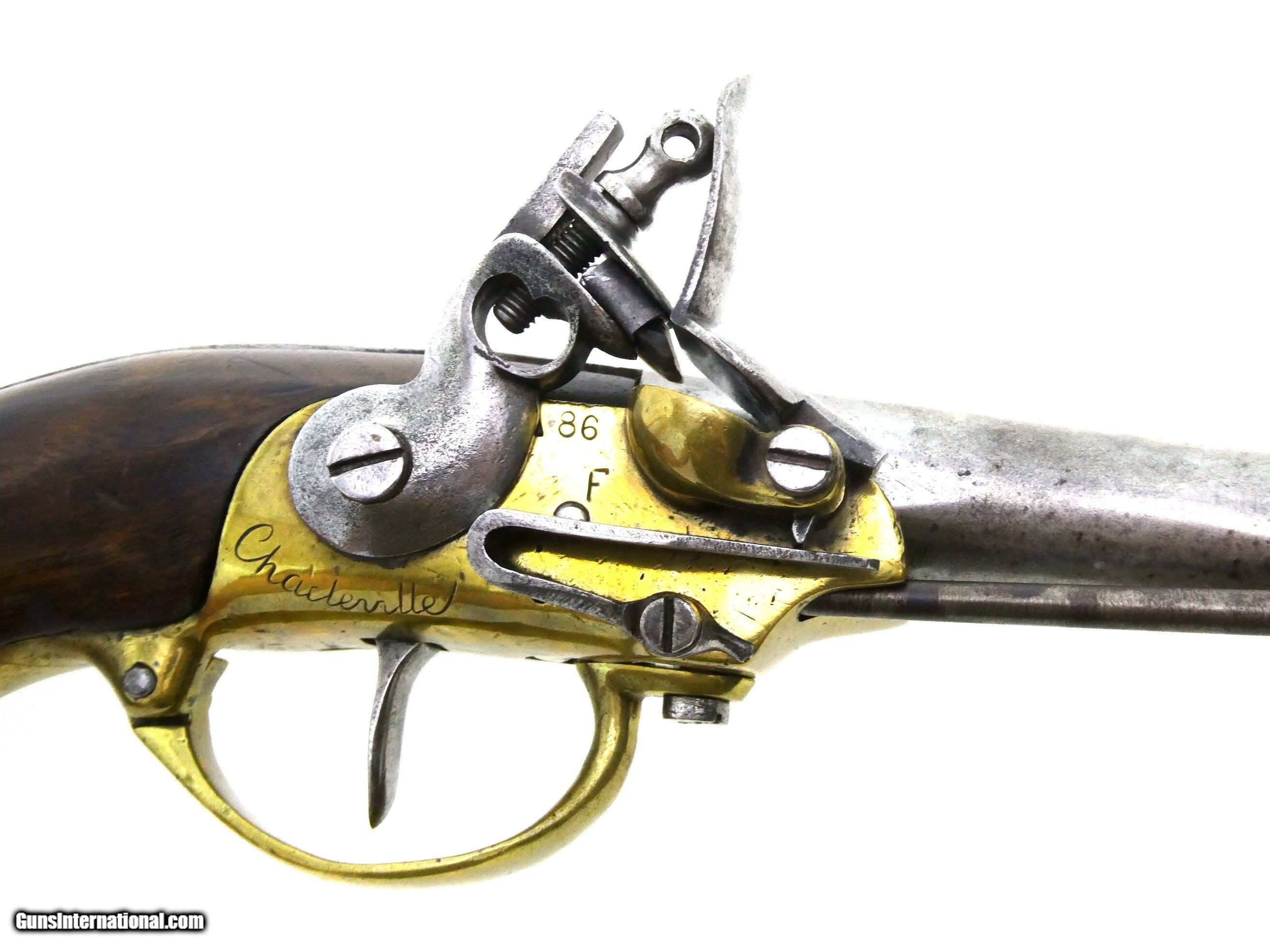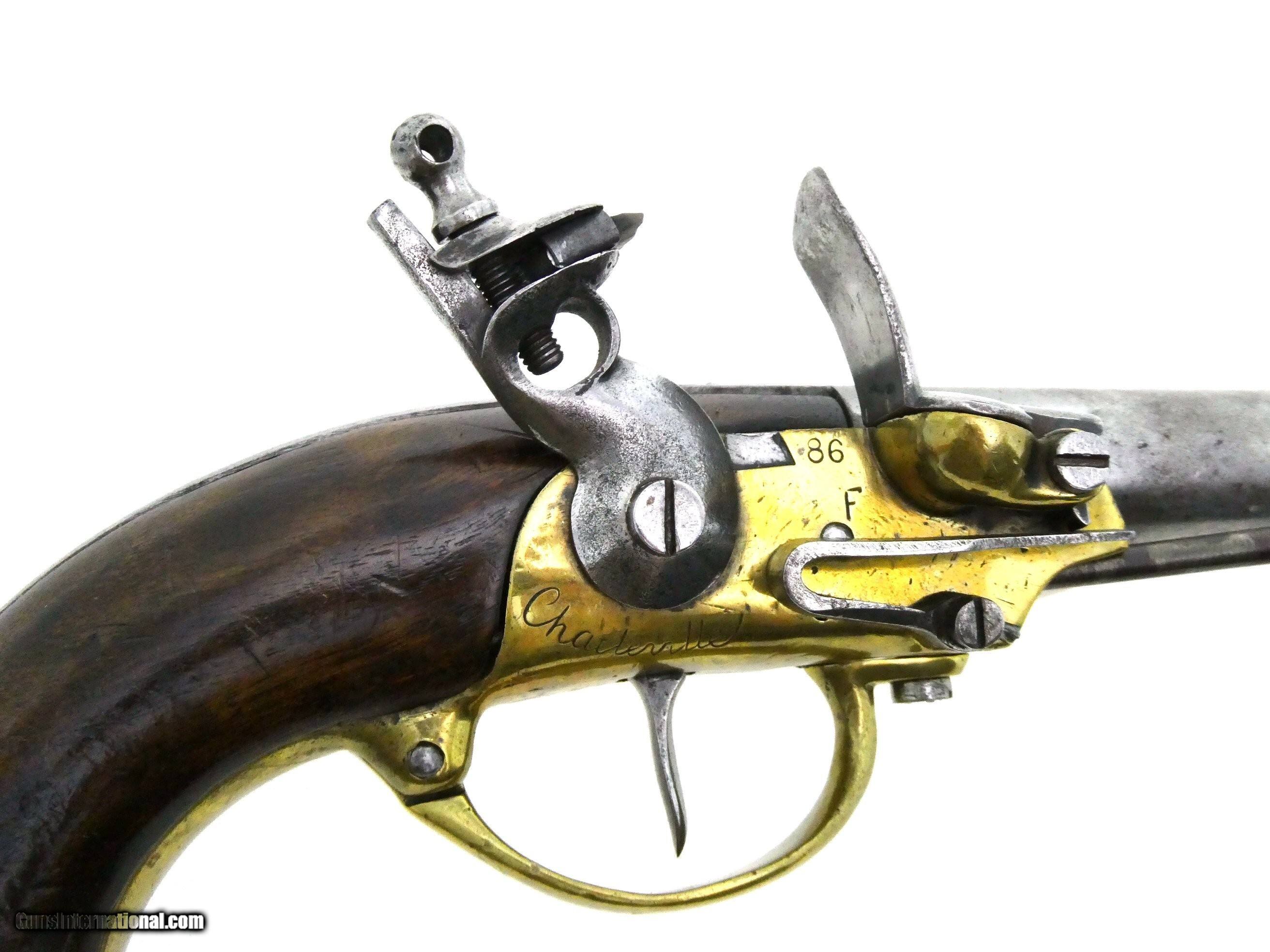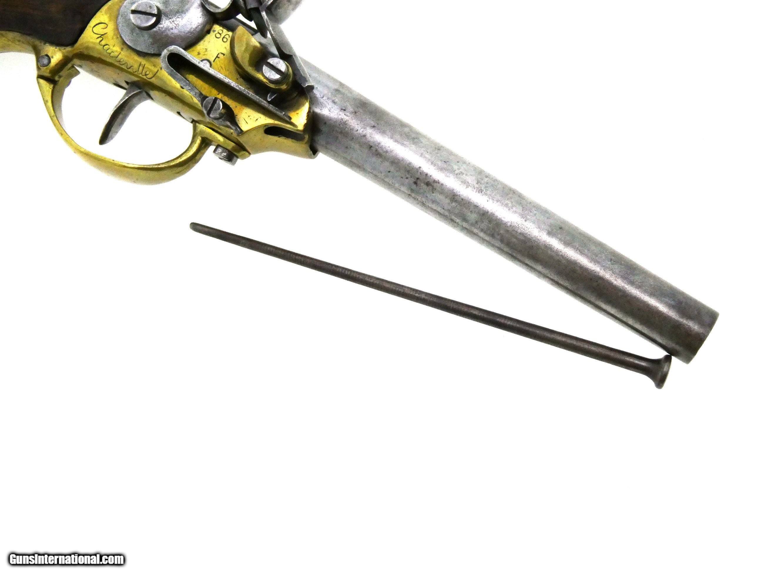 Description: Original French model 1777 cavalry flintlock pistol in good condition. Classic revolutionary war pistol in not over-cleaned condition, attractive for collectors. Ram rod may be a reproduction or later period replacement. Good bore with some patina, lock in good working order, clear markings, cal. 18mm. Add this historic firearm to your collection. Offers considered. Antique: Yes Price: $1,243.00 Shipping: $45.00 Contact Seller |