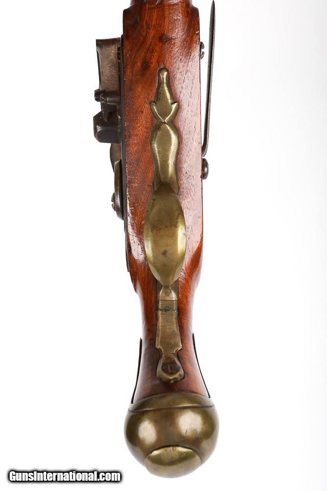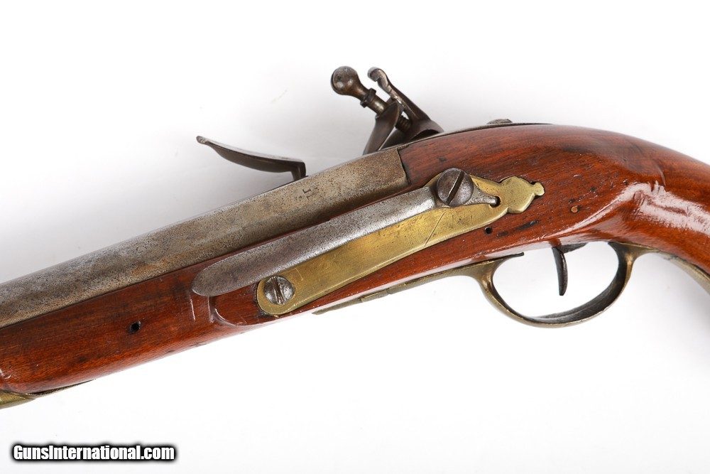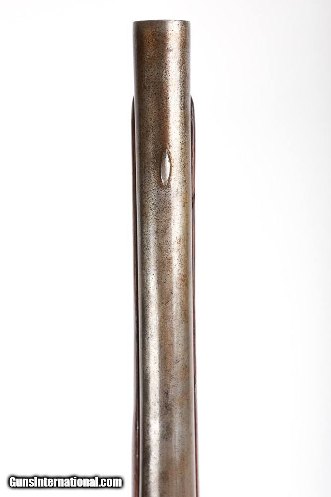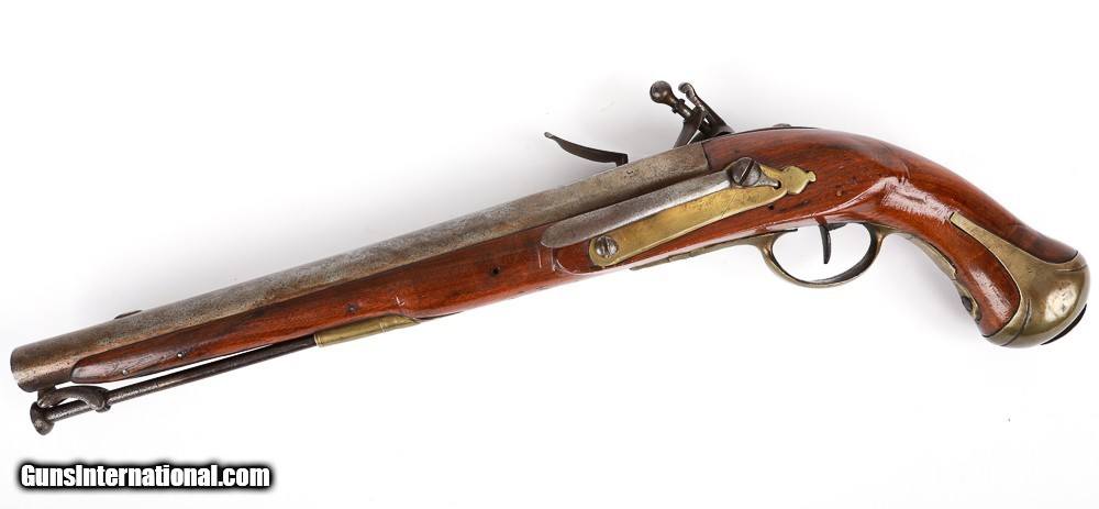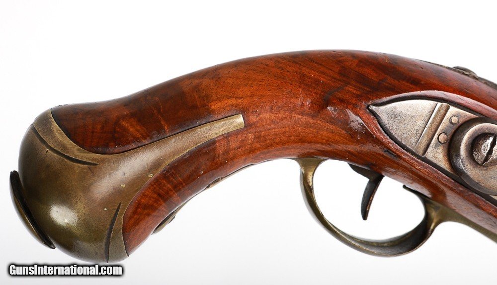 Description: Antique French Dragoon Martial Flintlock Pistol by Jourjon, with Belt Hook, approx. .72 cal., 12-5/16” round-to-octagonal pinned barrel, 18-3/4" overall length; barrel with a small blade front (and no rear) sight, has a faint proof mark to left barrel flat, original ramrod has been replaced with a captive, stirrup-type iron ramrod at muzzle; flat iron lockplate is marked “(St. Etienne proofmark) / Jourjon” below the graceful flint cock and iron pan; brass furniture includes left sideplate with iron belt hook attached, trigger guard with fancy upper and lower tangs, large oval buttcap with extended side tangs, and a single fluted ferrule retaining the ramrod; varnished European walnut fullstock with raised aprons on either side of lock. Condition is very good. Iron surfaces retain no original finish, but are overall gunmetal gray with some very mild surfacing etching and light patina; brass with moderate toning from age, impressions at left butt; lower trigger guard tang has been repaired in two places. Stock is sound and smooth with a secure repair at tip, pleasing grain and color, and an added coat of varnish. Action is strong and smooth. Please refer to photos for condition details. Please contact us with any questions Free Shipping within the United States The price includes a 3% discount for payment by cash/check. Credit cards add 3%. California residents pay 7.75% sales tax. SOLD Antique: Yes |