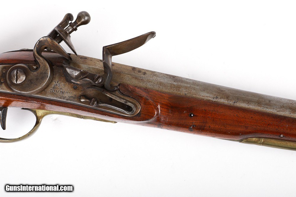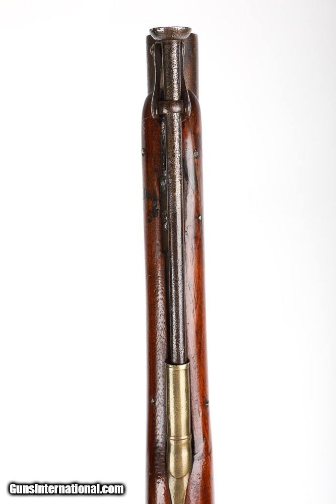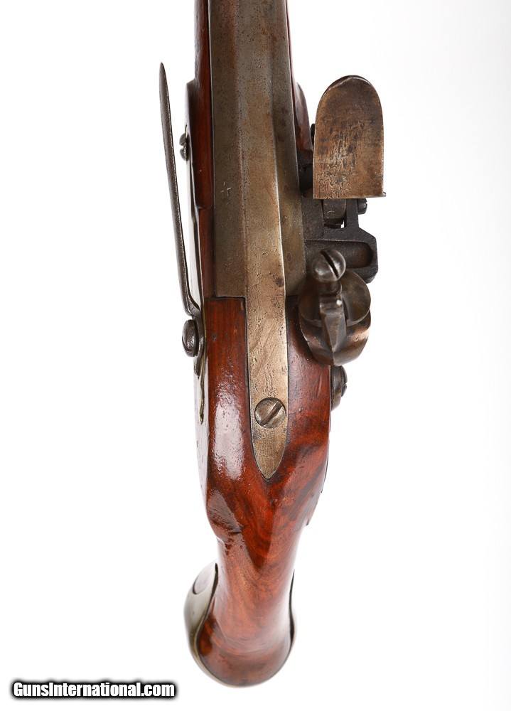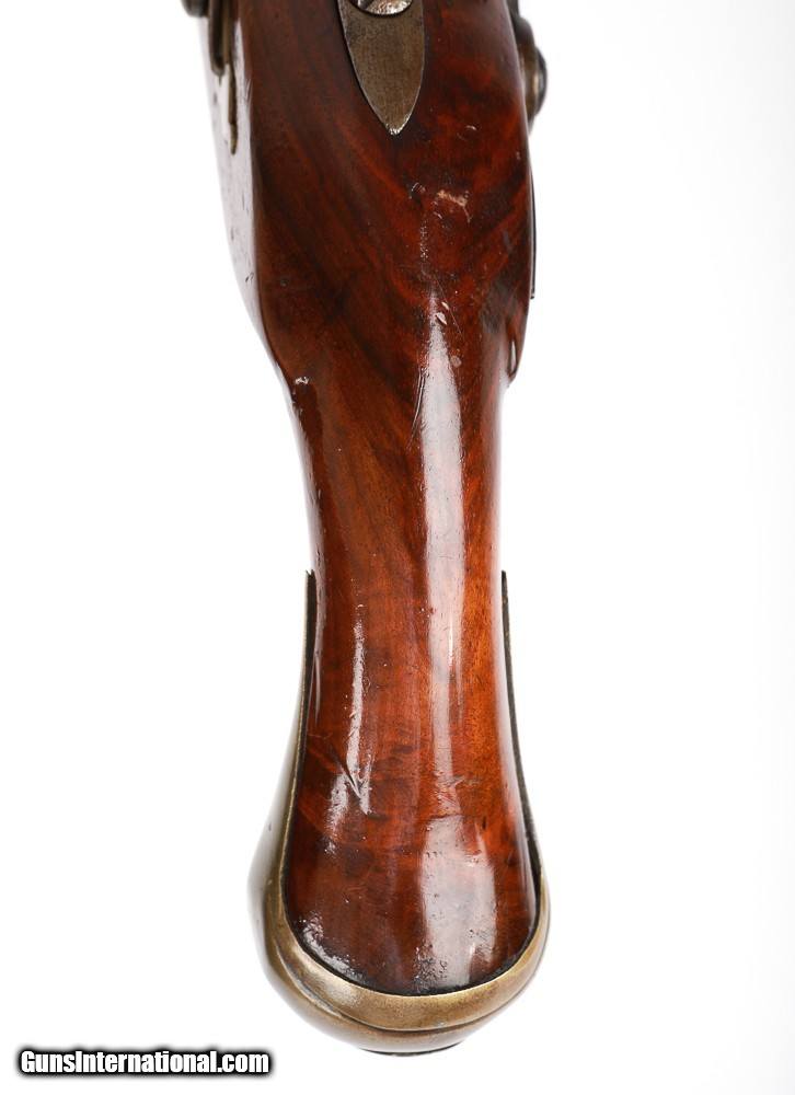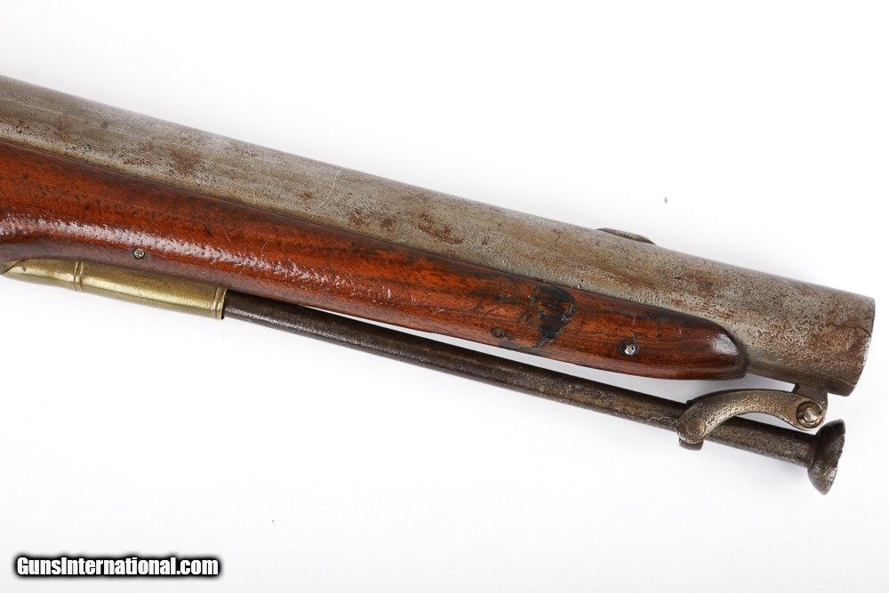 Description: Antique French Dragoon Martial Flintlock Pistol by Jourjon, with Belt Hook, approx. .72 cal., 12-5/16” round-to-octagonal pinned barrel, 18-3/4" overall length; barrel with a small blade front (and no rear) sight, has a faint proof mark to left barrel flat, original ramrod has been replaced with a captive, stirrup-type iron ramrod at muzzle; flat iron lockplate is marked “(St. Etienne proofmark) / Jourjon” below the graceful flint cock and iron pan; brass furniture includes left sideplate with iron belt hook attached, trigger guard with fancy upper and lower tangs, large oval buttcap with extended side tangs, and a single fluted ferrule retaining the ramrod; varnished European walnut fullstock with raised aprons on either side of lock. Condition is very good. Iron surfaces retain no original finish, but are overall gunmetal gray with some very mild surfacing etching and light patina; brass with moderate toning from age, impressions at left butt; lower trigger guard tang has been repaired in two places. Stock is sound and smooth with a secure repair at tip, pleasing grain and color, and an added coat of varnish. Action is strong and smooth. Please refer to photos for condition details. Please contact us with any questions Free Shipping within the United States The price includes a 3% discount for payment by cash/check. Credit cards add 3%. California residents pay 7.75% sales tax. SOLD Antique: Yes |