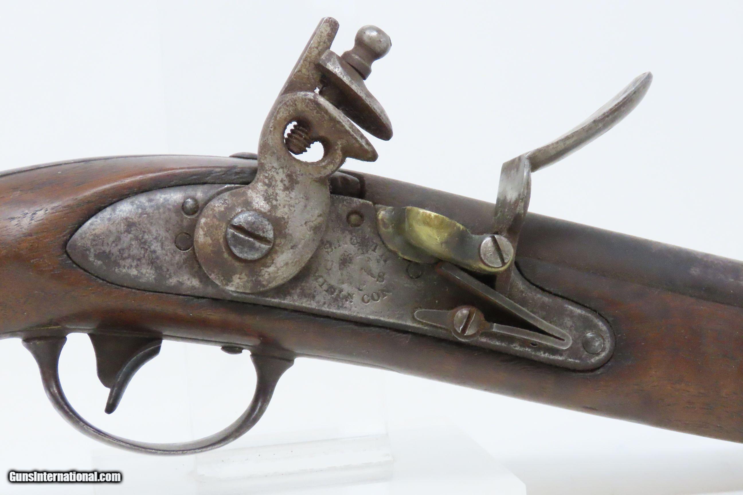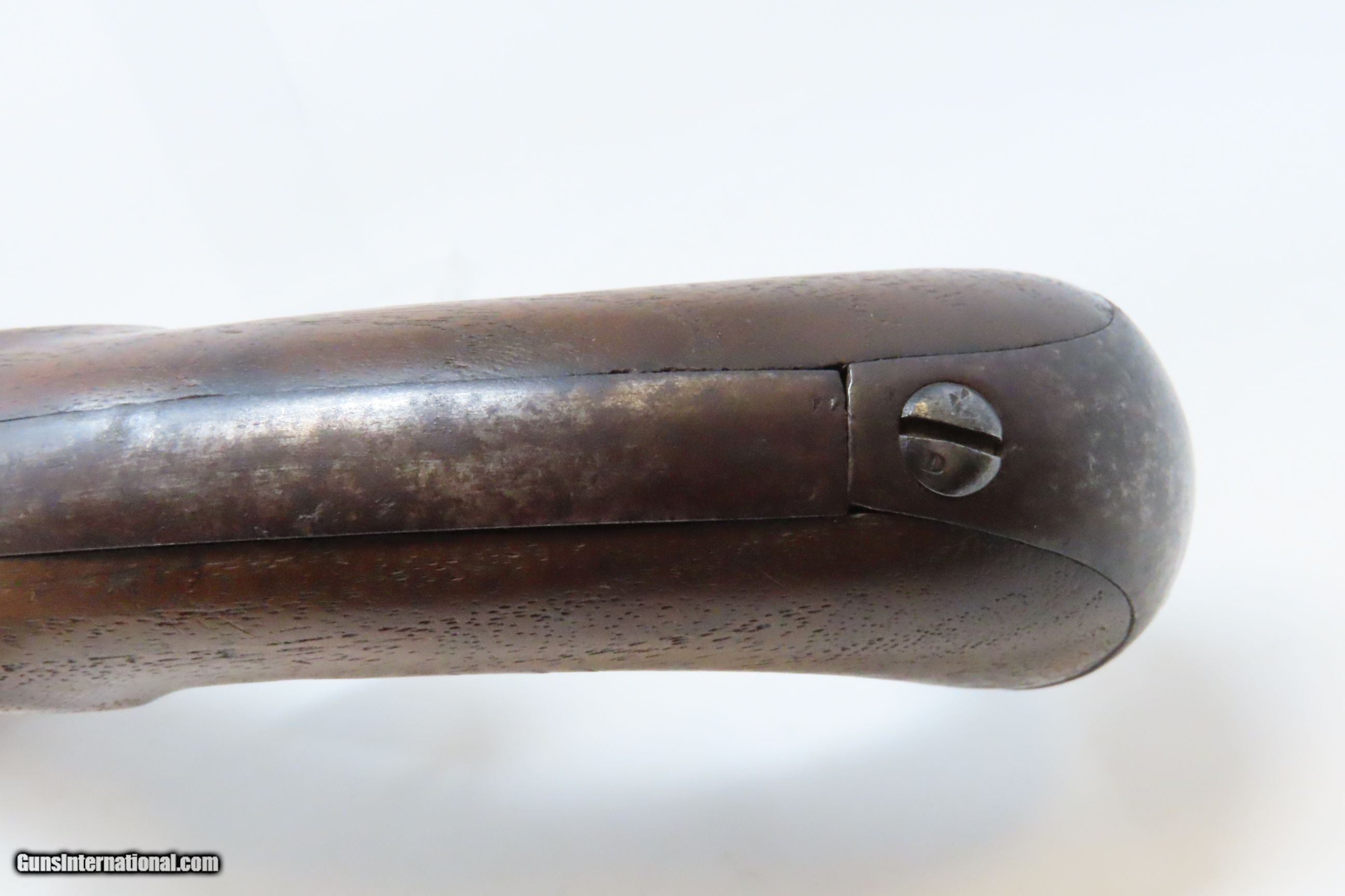Description: Antique SIMEON NORTH U.S. Model 1816 .54 Caliber Military FLINTLOCK Pistol U.S. CONTRACT Early American Army & Navy Sidearm Here we present an antique Simeon North U.S. Contract Model 1816 Flintlock Pistol, manufactured between 1817-20 in Middletown, Connecticut. 19,374 of these were made for the U.S. military. Many were updated to the much more reliable percussion system in the 1830s. The service life was quite long for this pistol. The famous scout and Indian fighter Kit Carson fought with one of these, still in its original flintlock form, during the Mexican-American War from 1846-48. Even though percussion arms, including pistols, had been adopted by the U.S. in the 30s, it was not unusual for flintlocks to still be in use. Primary conflicts that would have involved this piece during its service life were the Seminole Wars, the Pawnee Expedition, the Mexican-American War and even the American Civil War. The lock is marked “S. NORTH, US, MIDLN. CON.”. along with the Federal Eagle. The barrel is also marked “US” with military inspection marks. Though many of these pistols were converted to percussion, here is a true survivor in its original flintlock form. The overall condition is good. The action does not function, as the hammer does not hold in the cock position. Good bore for its age. Barrel band is missing. This example has maintained a solid stock/grip with a cartouche remnant on the left wrist. Own the original! This is a legitimate antique and not a reproduction. Barrel is 8-1/2 inches. Caliber: .54 Flintlock Overall condition as seen in photos. Very Fast. Very Safe. FREE SHIPPING WORLDWIDE. Delivered directly to your door by express mail! Guaranteed AUTHENTIC & Includes CERTIFICATE OF AUTHENTICITY. ancestryguns $1200 #228142 SOLD Antique: Yes |