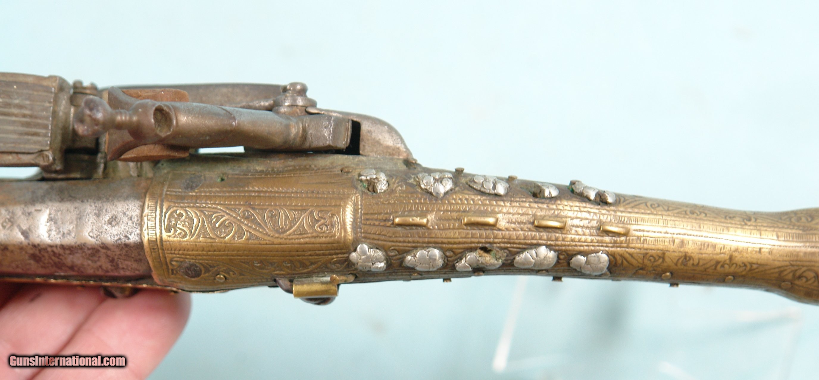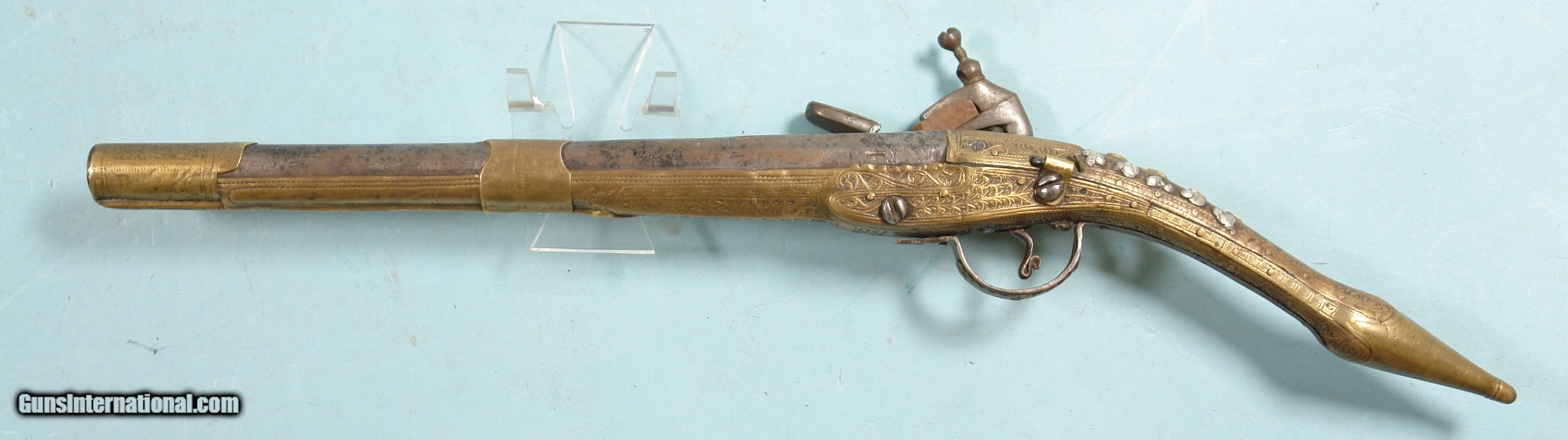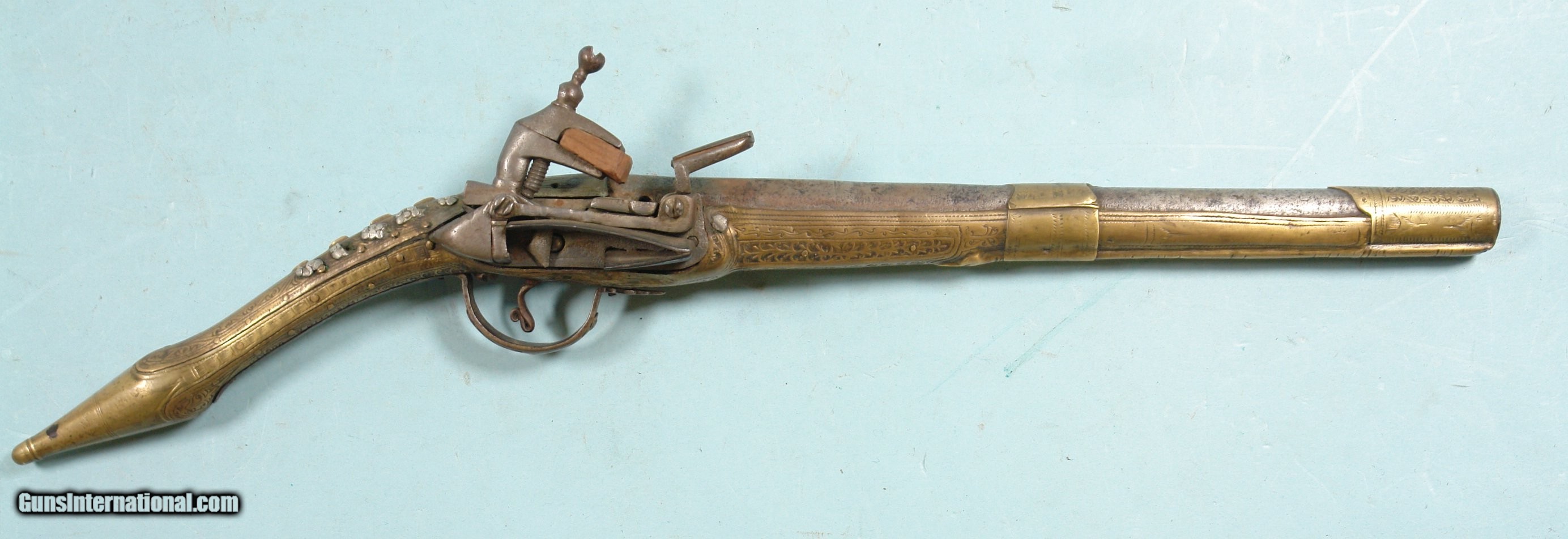 Description: 32286-BALKAN RAT-TAIL ALL METAL MIQUELET LOCK CHIEFTAN’S PISTOL CIRCA LATE 1700’S.19” o/a with 11” octagon/round .60 cal. smoothbore barrel. Profusely engraved brass stock with elongated “rat tail” pommel. Ten silver rosettes on wrist. Excellent plus with all the original parts and lock in working order. Hard to find in nice condition like this one. $1250. SOLD Antique: Yes |