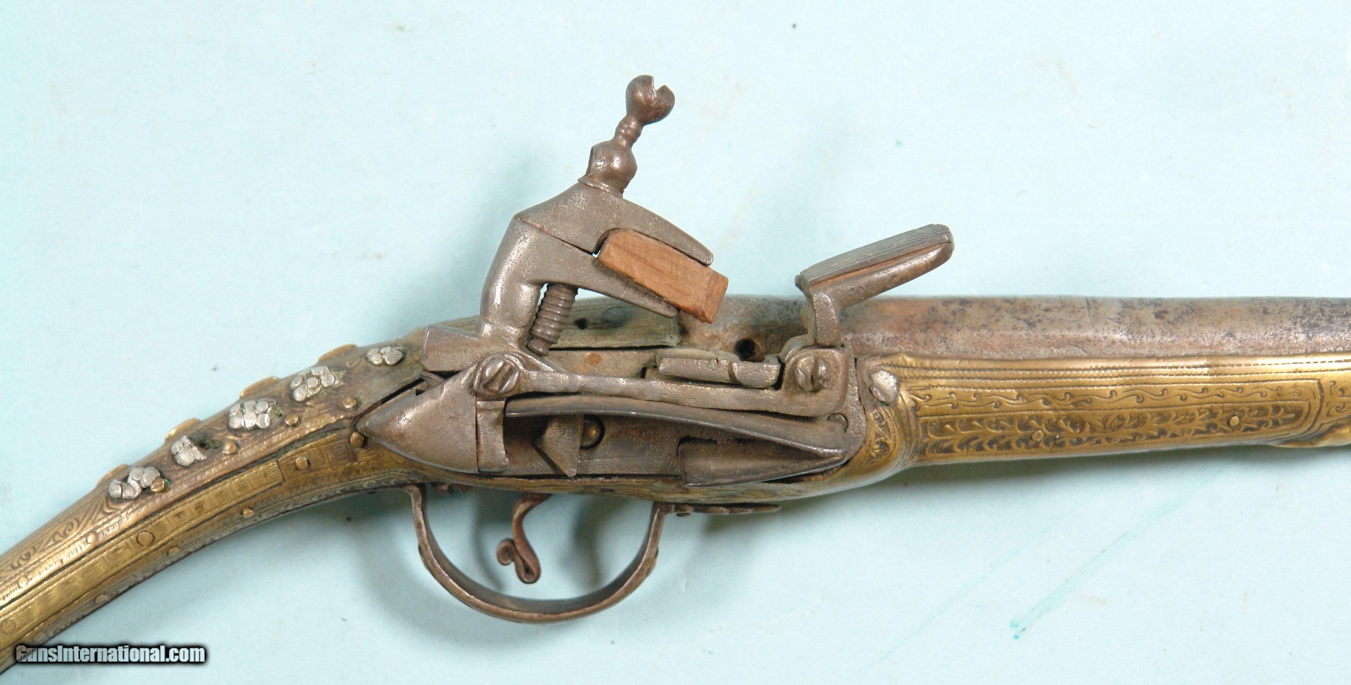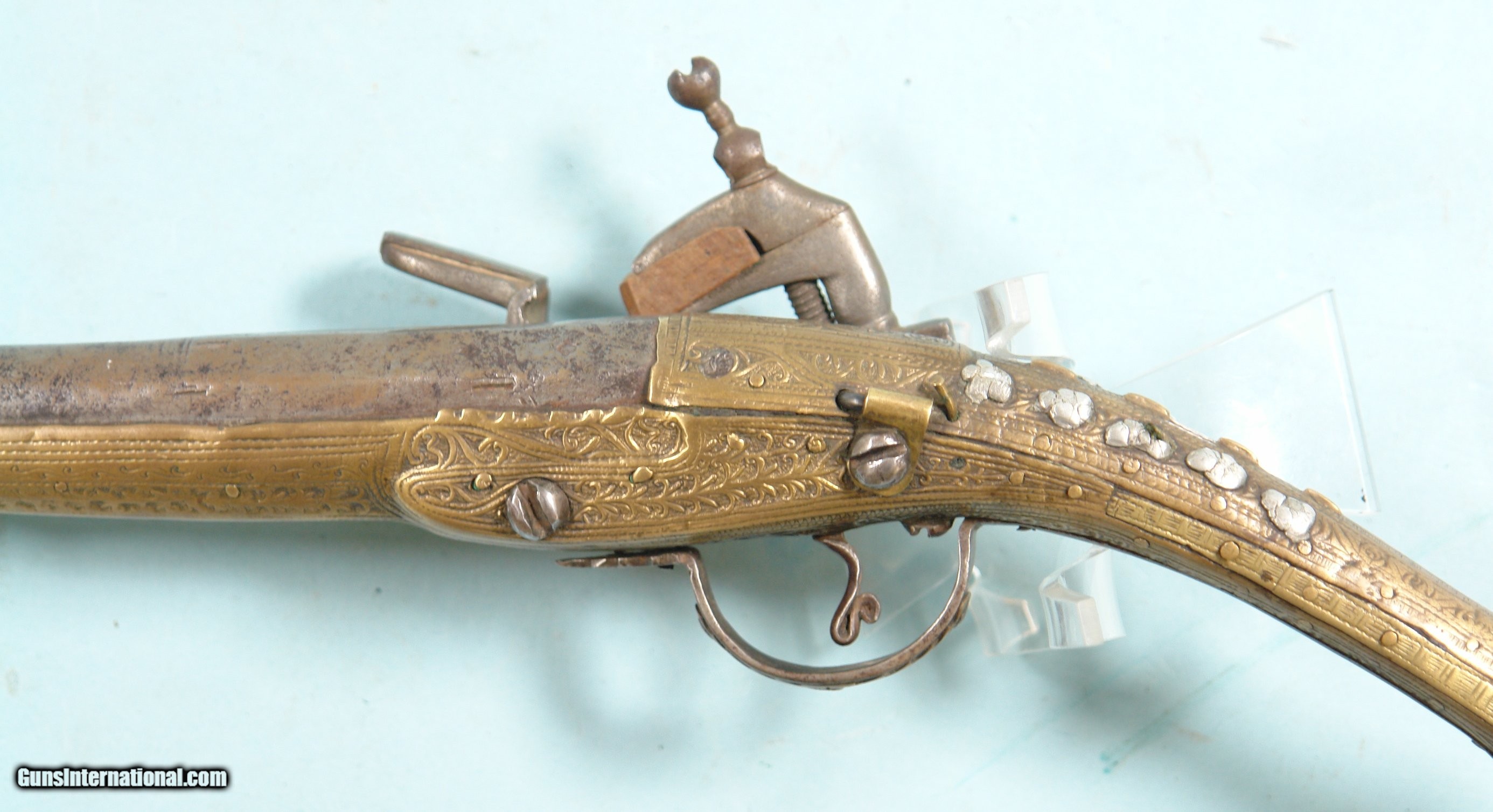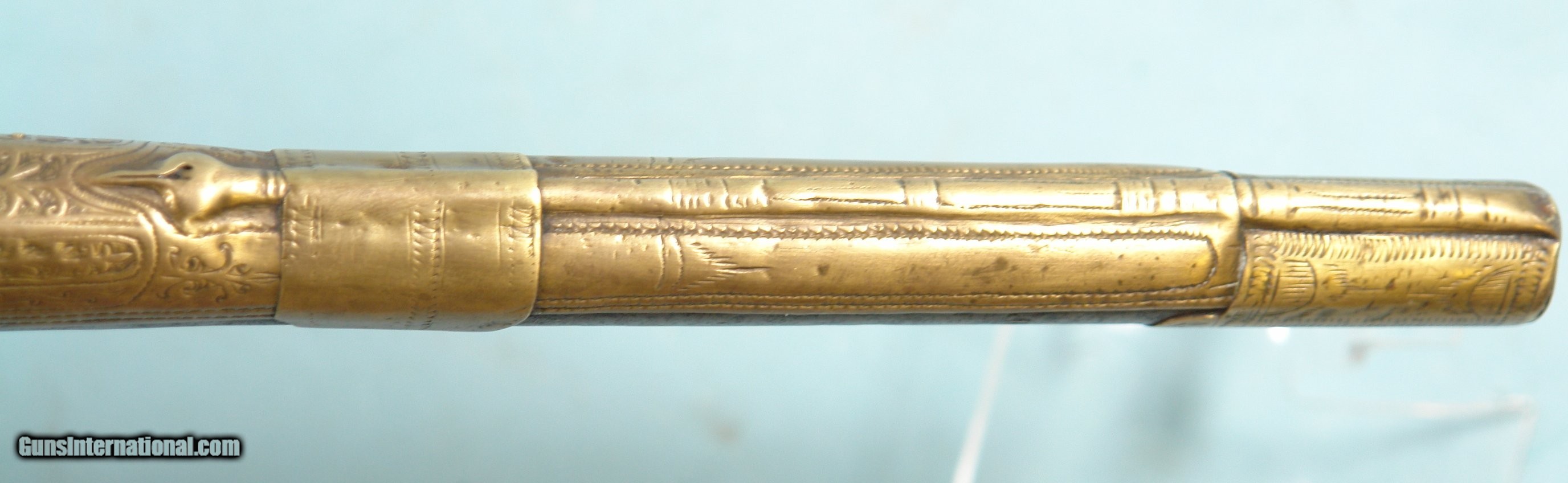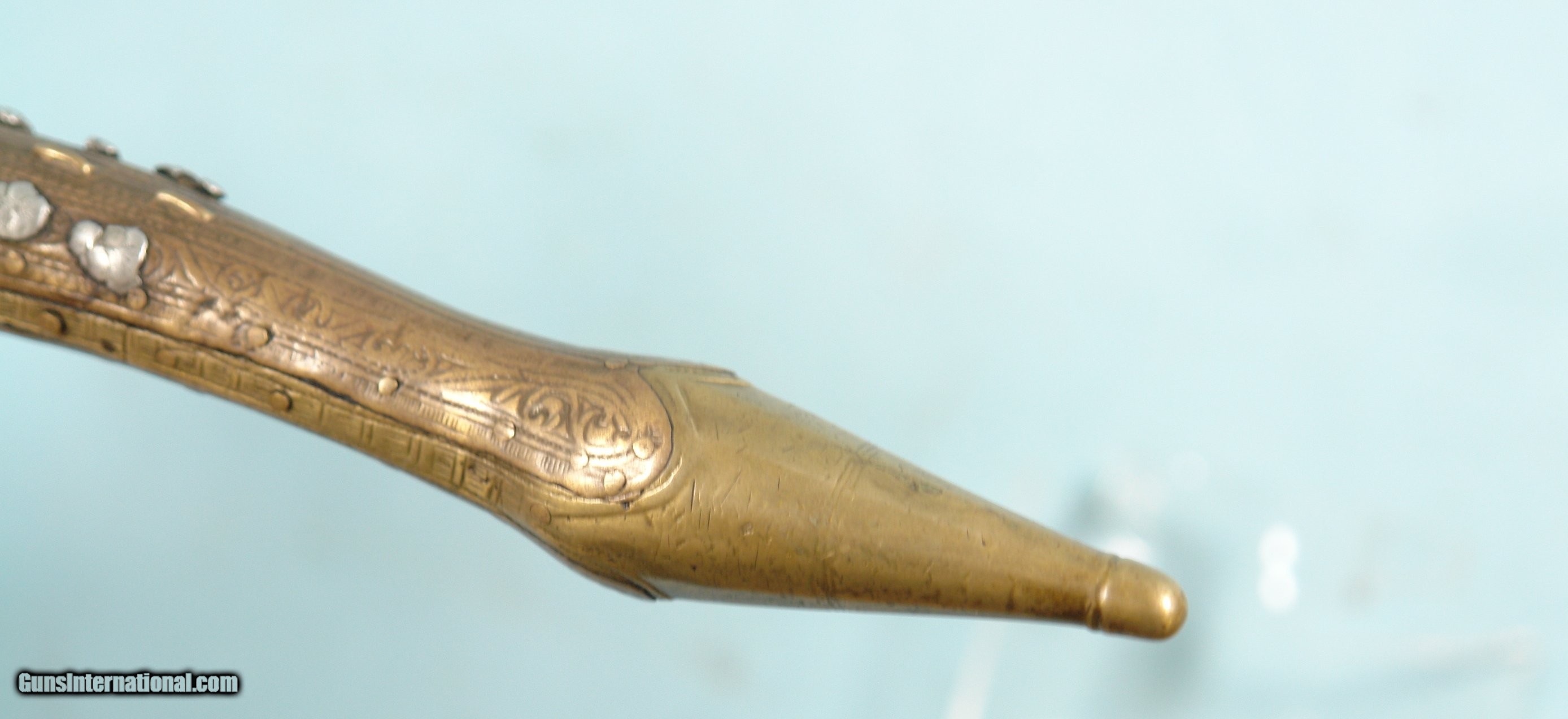 Description: 32286-BALKAN RAT-TAIL ALL METAL MIQUELET LOCK CHIEFTAN’S PISTOL CIRCA LATE 1700’S.19” o/a with 11” octagon/round .60 cal. smoothbore barrel. Profusely engraved brass stock with elongated “rat tail” pommel. Ten silver rosettes on wrist. Excellent plus with all the original parts and lock in working order. Hard to find in nice condition like this one. $1250. SOLD Antique: Yes |