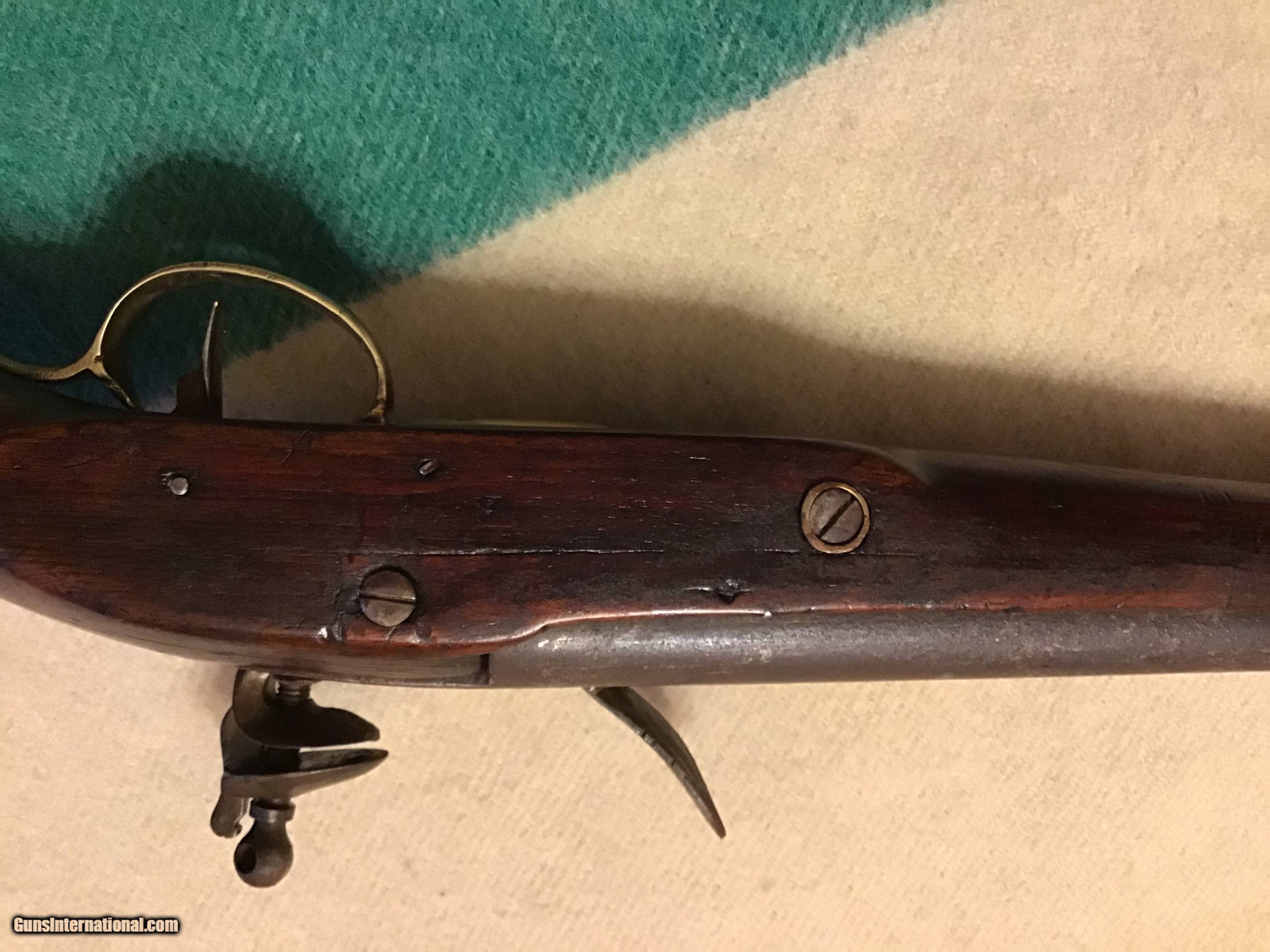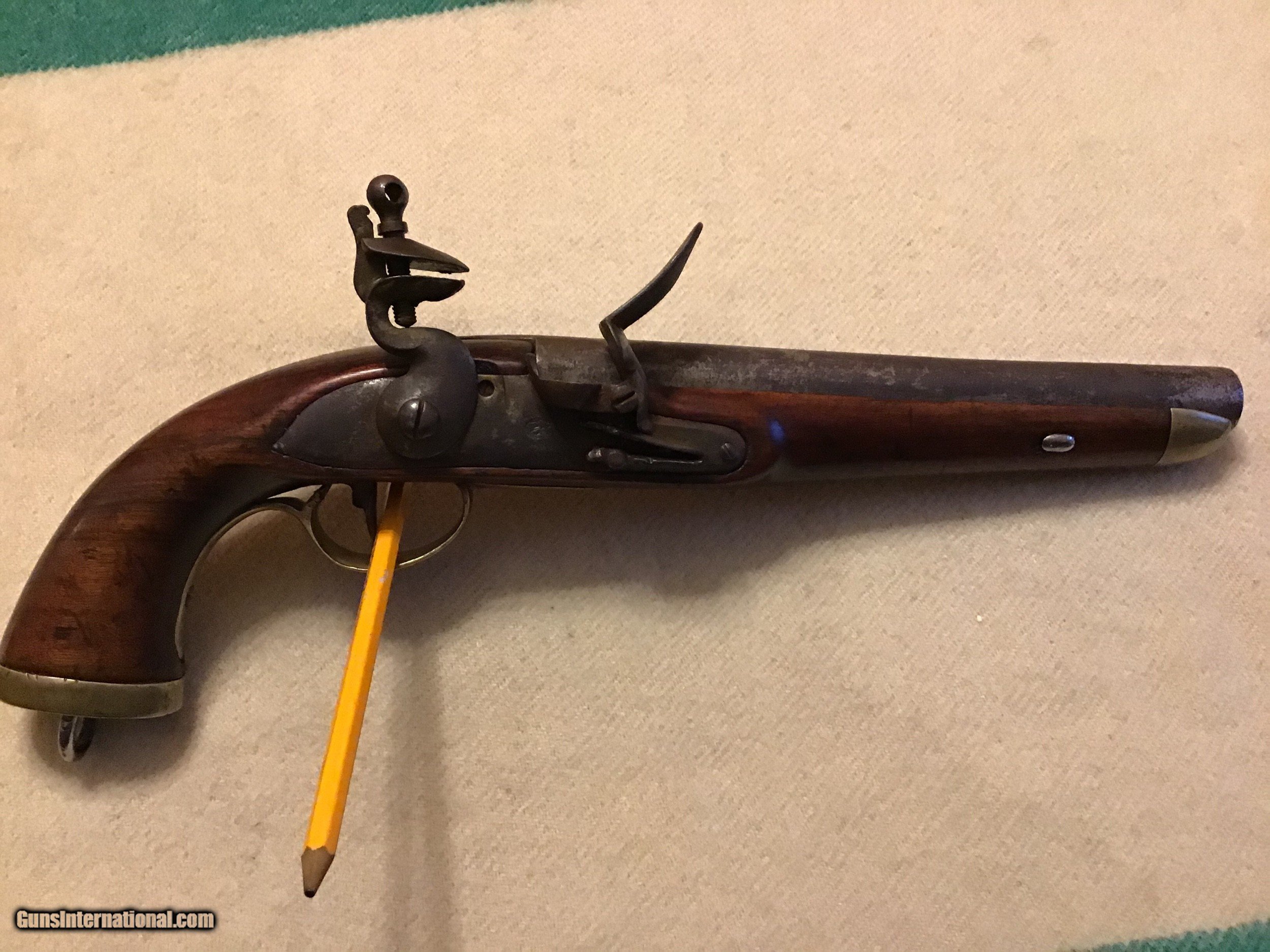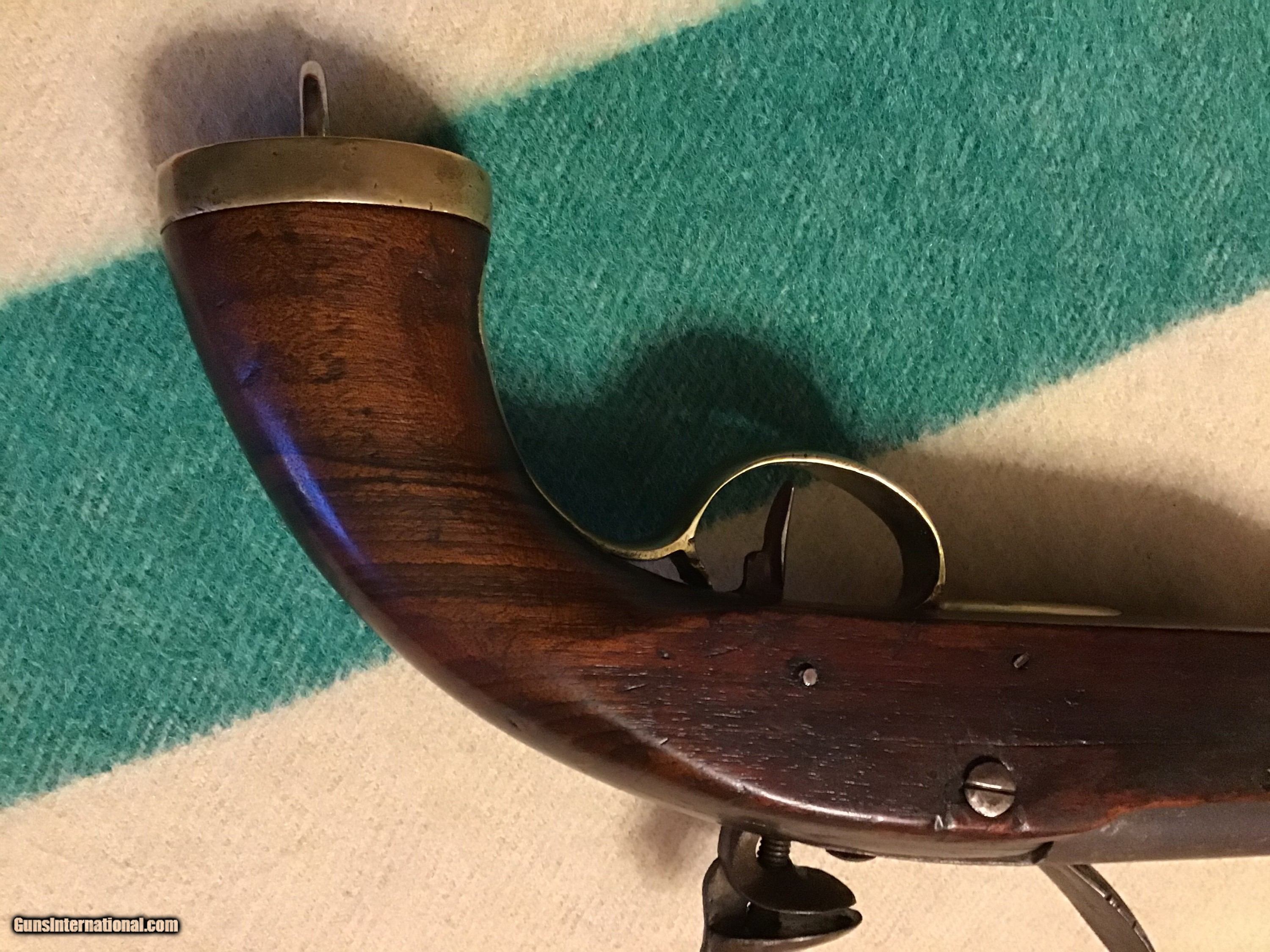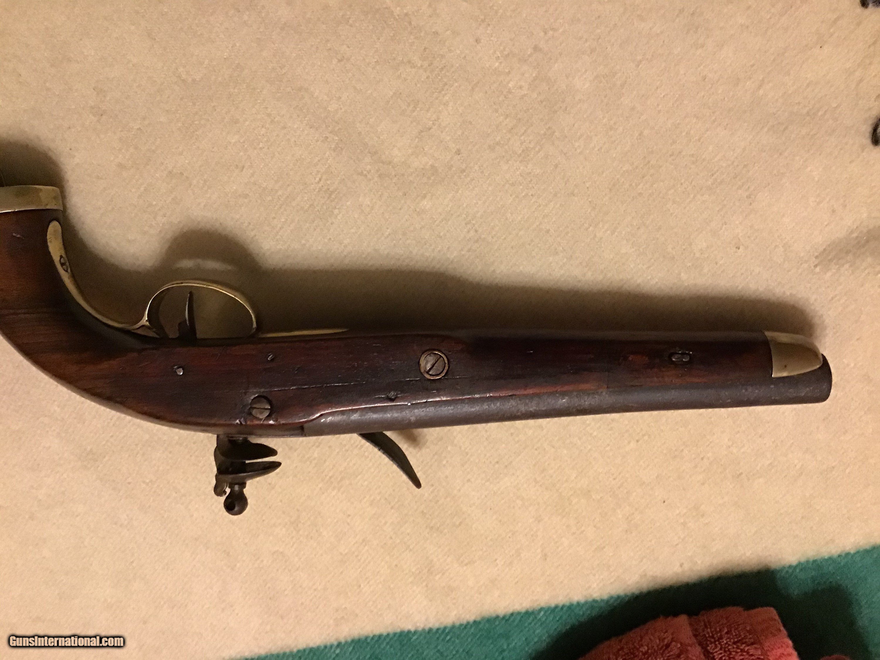 Description: On Hold Sale Pending. This is a good Belgian flintlock cavalry horse pistol circa 1790-1820. Total length 15.5", barrel length 9"s long with a bore of approximately 67-69 caliber and has a brown patina. Pistol has brass regulation period hardware and butt cap with the lanyard loop. Flintlock lock works fine and has a marking stamped into the middle of the llock which I believe is a Belgian mark. The stock is good but has a well done wood piece replaced on the back side (see photos). A great piece of military history. Feel free to contact me with any questions chriskobberdahl2gmail or 218-839-9272. SOLD Antique: Yes Manufacturer: Belgian Model: Horse pistol Condition: Good Metal Condition: Good Wood Condition: Good |