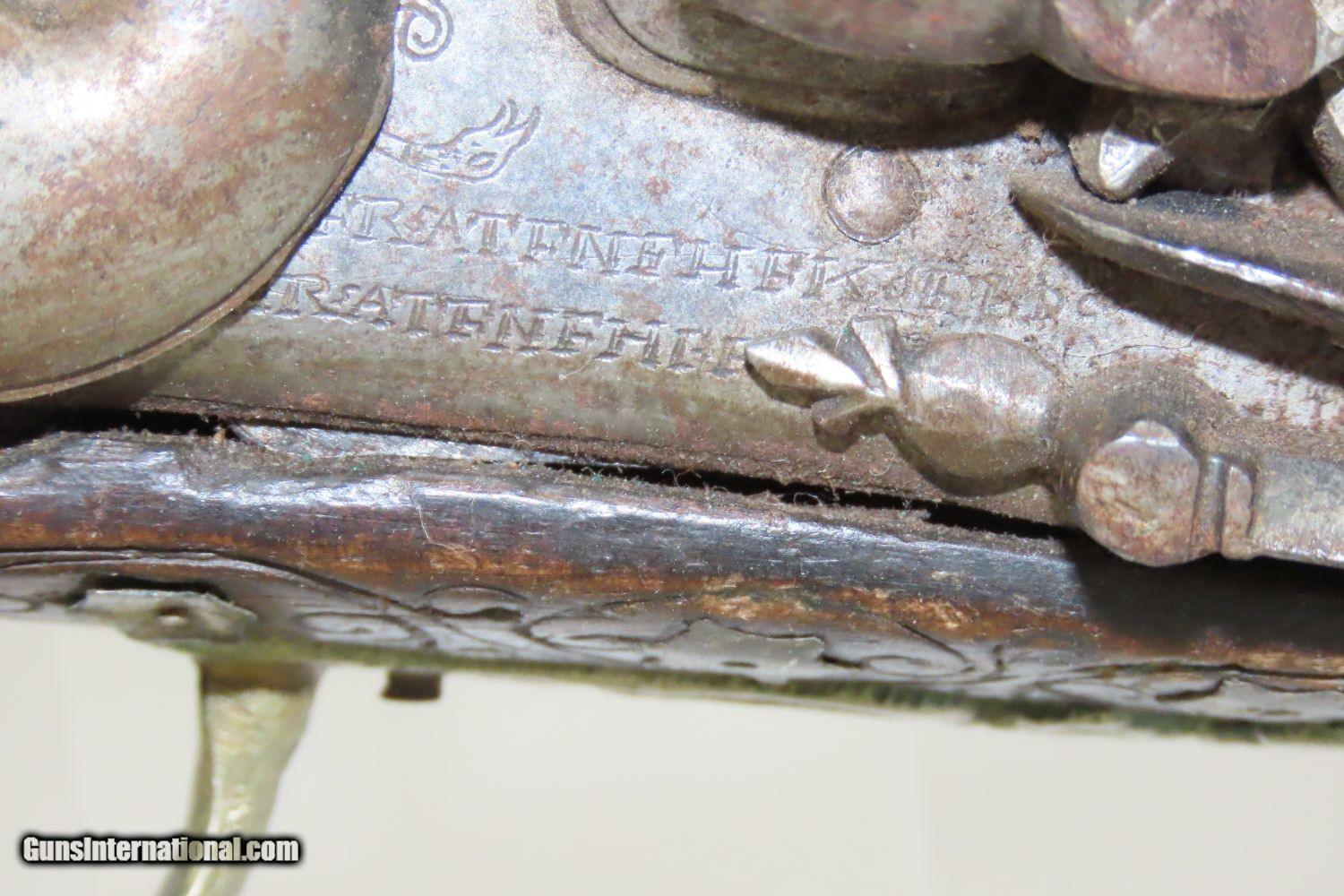 Description: BRACE of ORNATE Antique OTTOMAN Flintlock Pistols Pair PIRATE Mediterranean Late-18th / Early 19th Century Pistols Here we present a Brace of Ottoman Flintlock Pistols, made circa the end of the 18th century. Pistols like these were commonly used around the Mediterranean in the 18th and early 19th Centuries. This would have been like those weapons carried by Tripolitan pirates when the young United States sent the Marines to take care of them. These are large pistols used for fighting but it was also a status symbol with its elaborate stock designs. The overall condition is fair. The action functions in both pistols. The bores are smooth and dark. Some of the wire inlays have come loose, and in other areas are missing. One of the pistols has a crack around the grip. “ATRRATFNFHFKFIR WARSATFNFHRF” is inscribed on both locks. Own the original! This is a legitimate antique and not a reproduction. Barrels are 13-3/4 inches. Caliber: .67 Overall condition as seen in photos. Very Fast. Very Safe. FREE SHIPPING WORLDWIDE. Delivered directly to your door by express mail! Guaranteed AUTHENTIC & Includes CERTIFICATE OF AUTHENTICITY. ancestryguns $1785 #20734 SOLD Antique: Yes Handgun Caliber: .67 |