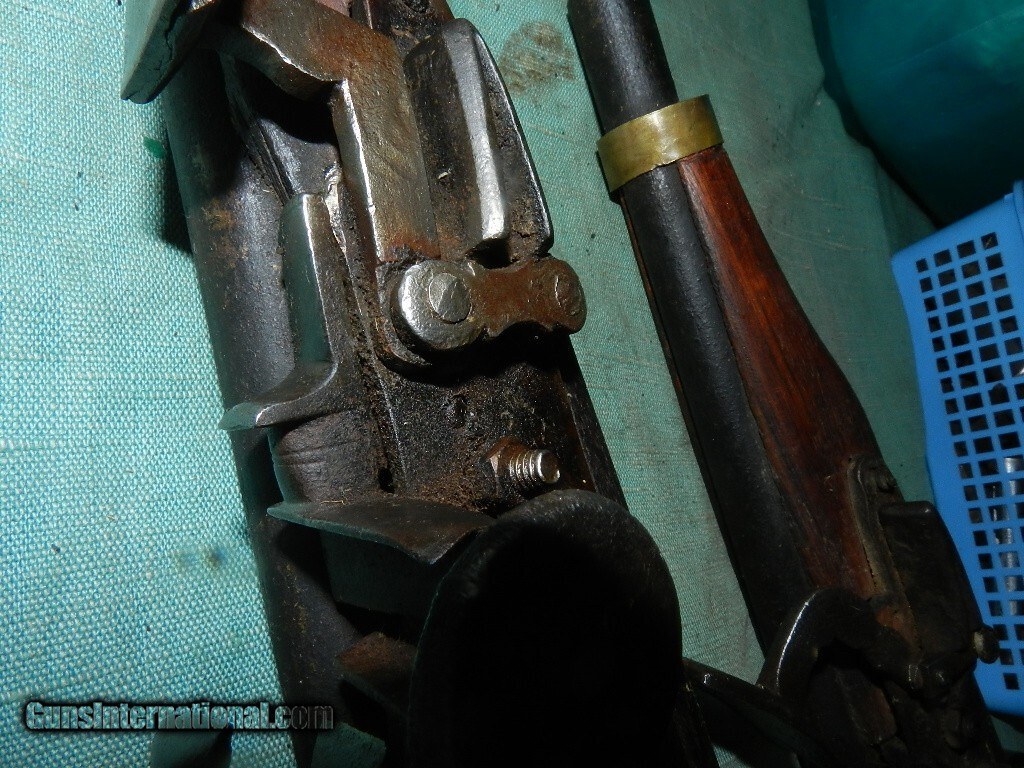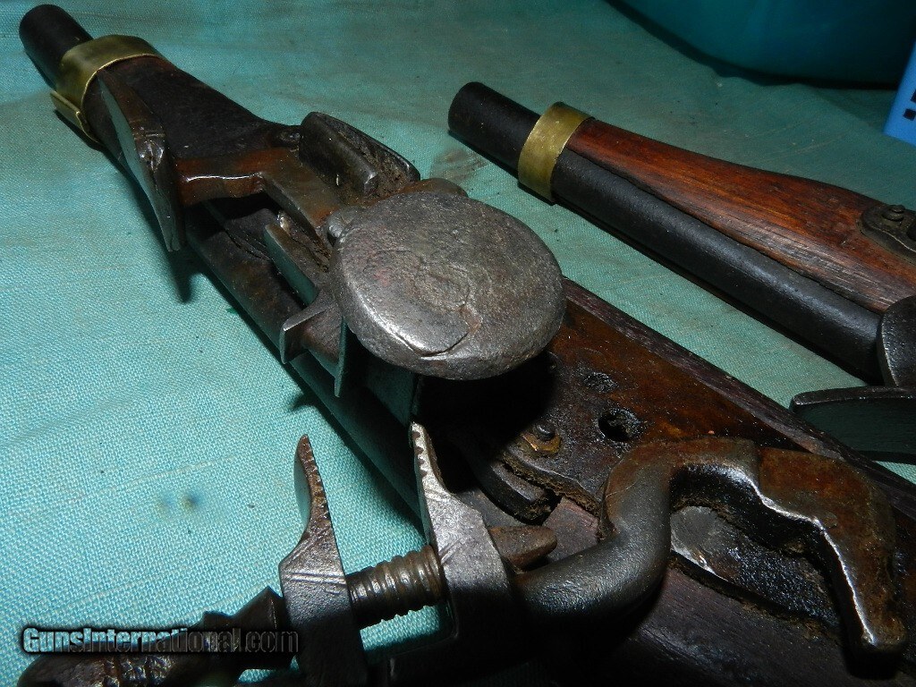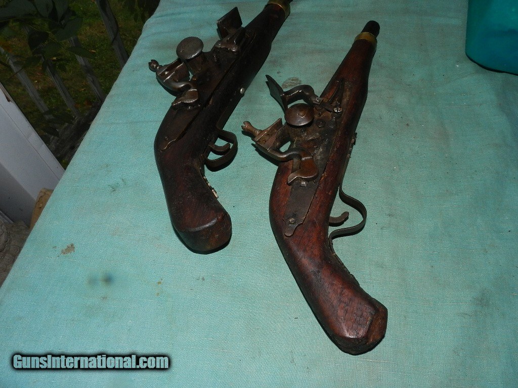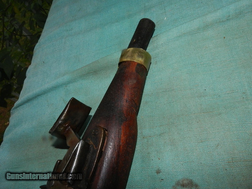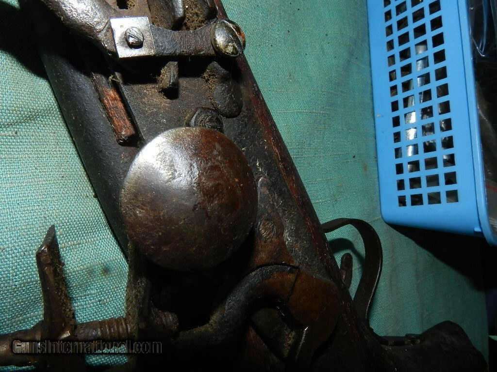 Description: A pair of cnapaunce like flintlock pistols of early times, not working locks and to be fired,Early weapon workmanship with crude made wood stocks and brass barrel bands. Because of age many repairs of changed parts may have been added or replaced. Measuring about 16" long with a round barrel of about 9" The rtoich hole of barrels not found so they were replaced, and locks may have internal parts missing. I have not taken these apart or tried to fix.. Making a man cave great Pirate display. Some of the first firearms were snapaunce before dof locks or then flintlocks. sold as is. thanks. When buying a gun if intending to shoot it, always have it examined by a competent gunsmith before shooting. To buy a gun from me you must get a direct email for me, with details, and shipping cost. We don’t have a web site .I prefer money orders or a check. Item ships when funds come in. I try to keep guns affordable, which means I make less money than most dealers. You won’t get altitude sickness, or nose bleed, with my prices! I consistently have the best selection of older guns If you attempt to buy, you must still contact us for details . Best to email to buy. Sometimes a local person can stop buy and purchase before the gun is removed. Sometimes not home to get calls. Some guns are required shipment to a gun dealer near you for a transfer to you when it arrives. Otherwise many older or black powder guns ship to your door. With the widest selection of older guns at great prices, We don’t have a store, and sell on the internet only. I’m easy to get along with. Thank You Antique: Yes Price: $395.00 Contact Seller |