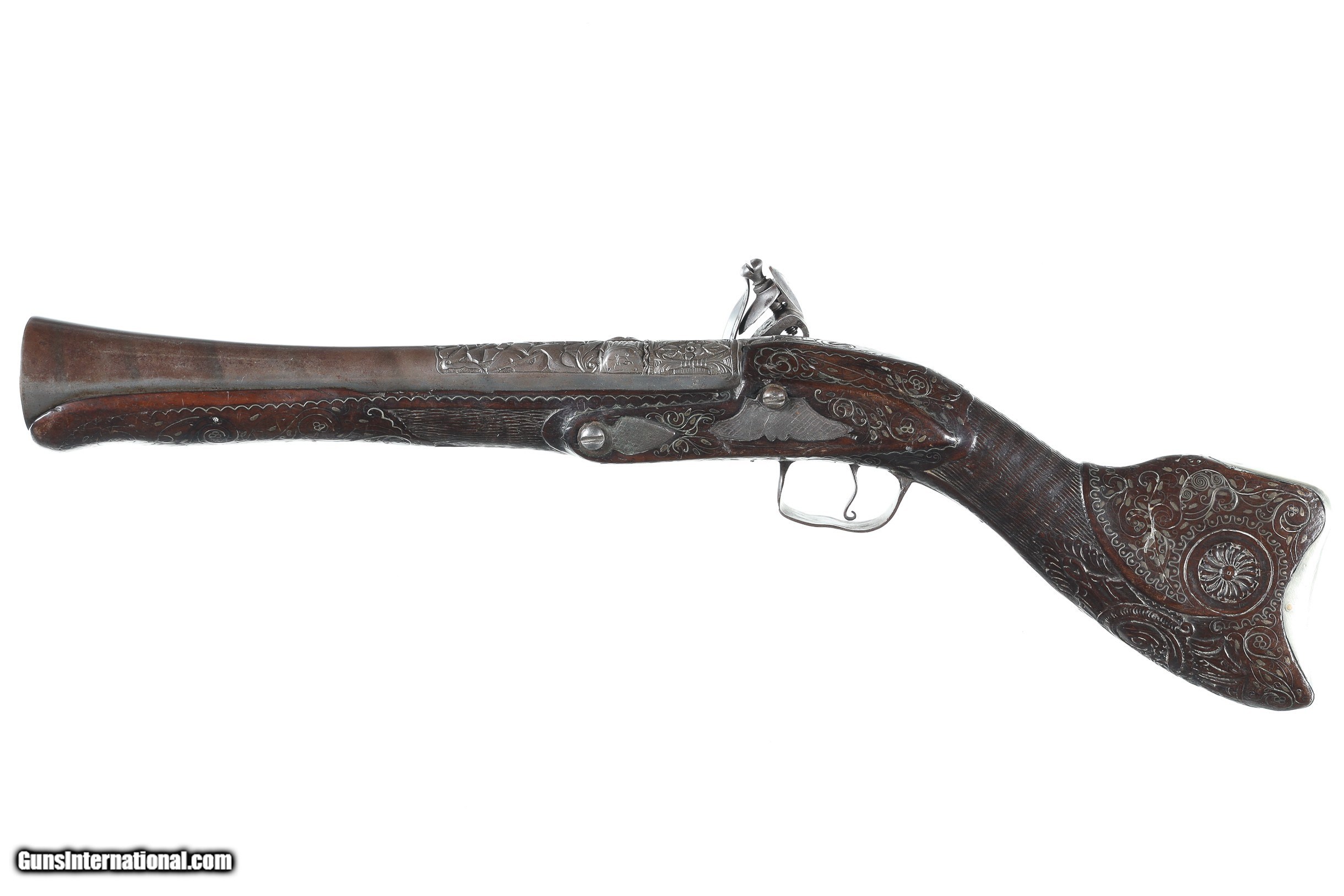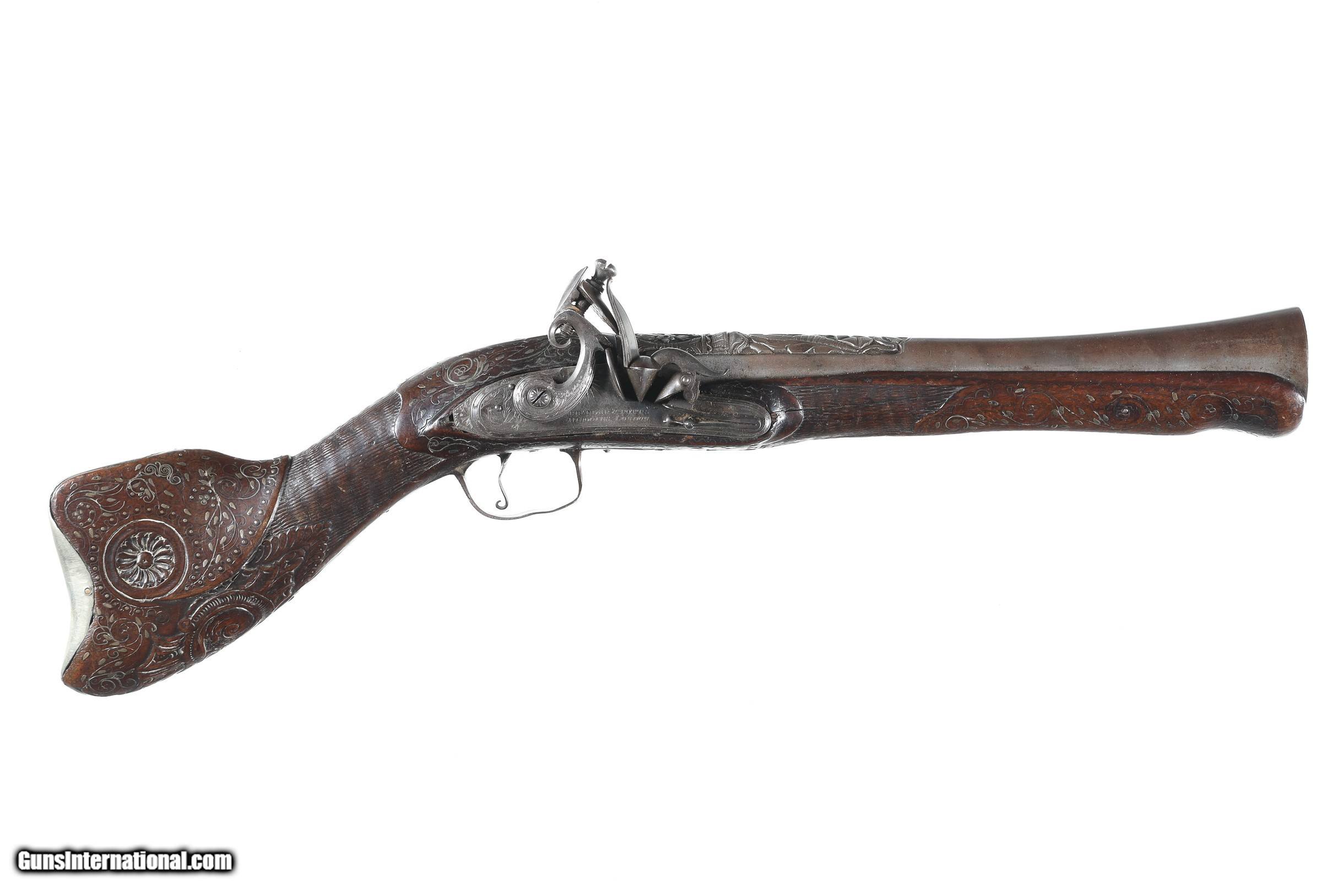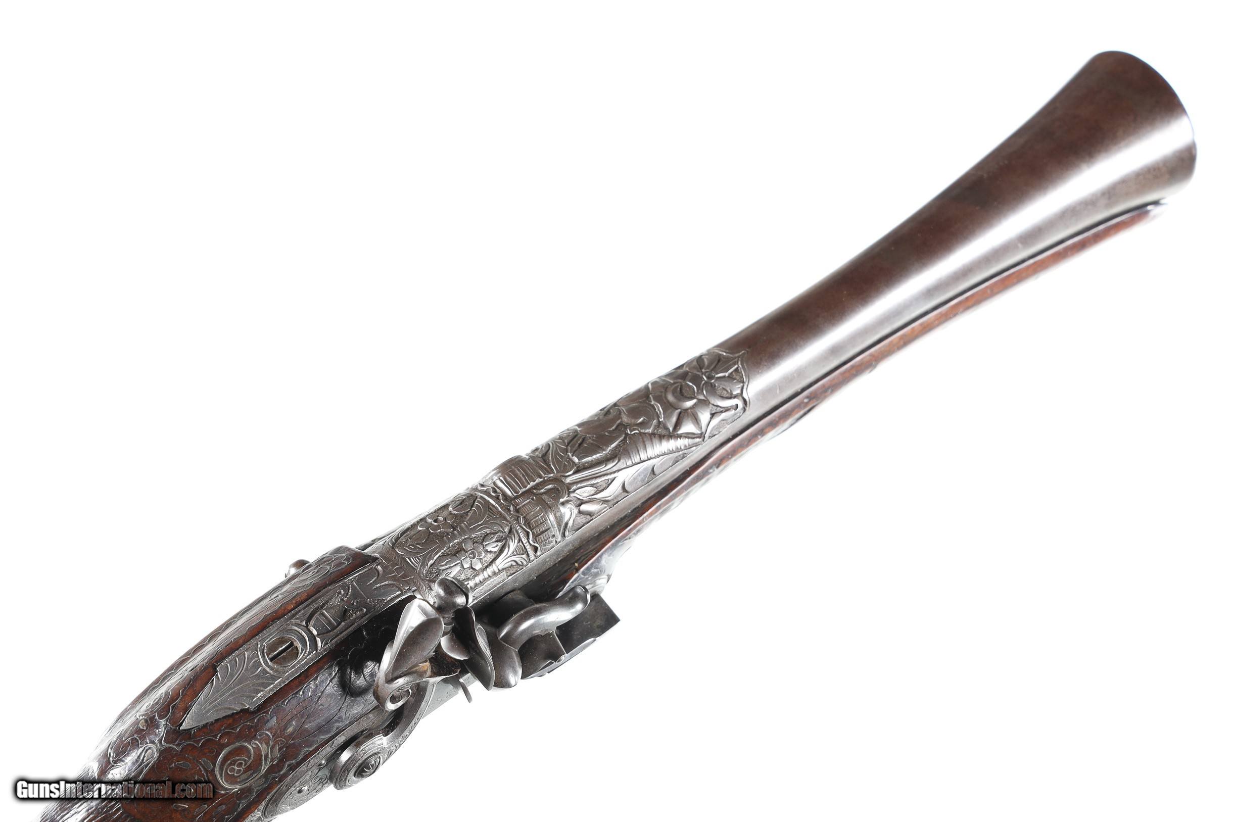 Description: English produced by Brander & Potts Flintlock Blunderbuss pistol with 28 Ga, bore and 1 3/4" flared muzzle. Profusely carved iron breech with English Rose & Foliate and African stands of arms. Ornate carved oil finished walnut stock with wire inlays and checkered German silver escutcheons and trigger guard . Waterproof Flint lock marked "BRANDER & POTTS MINORIES LONDON" with with game scene of Fowl at rear tang. Condition, The metal remains bright with crisp carvings and markings. The elaborate stock has some period of use impressions and a small crack forward of lock plate. Mechanically fine. • Free Shipping, No Credit Card Fees. • Lay-a-way available for this firearm. • 1/3 Down, a 1/3 in 30 Days 1/3 in 60 Days. SOLD Antique: Yes Manufacturer: Brander & Potts Model: Flintlock Serial Number: NSN Barrel Length: 10 1/2 |