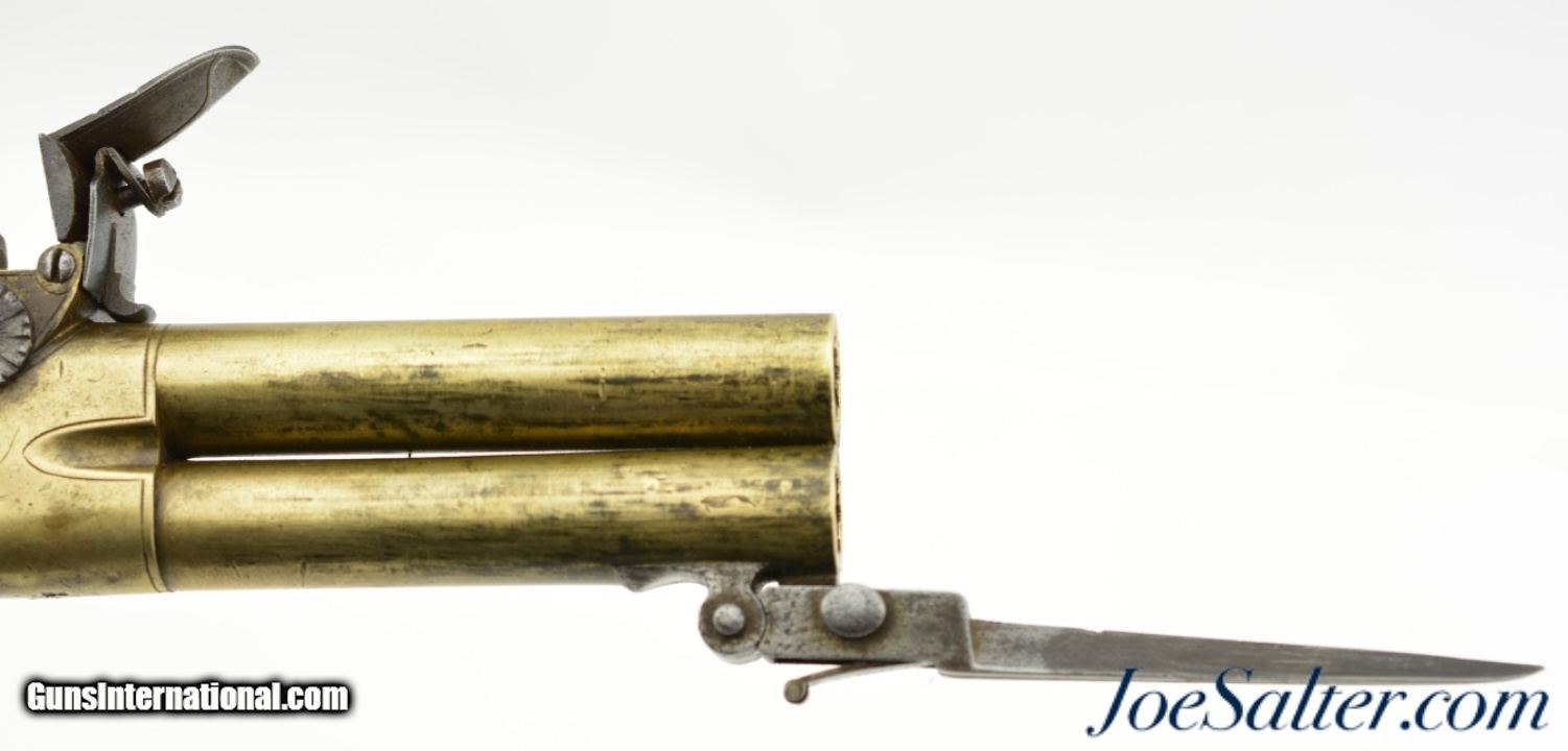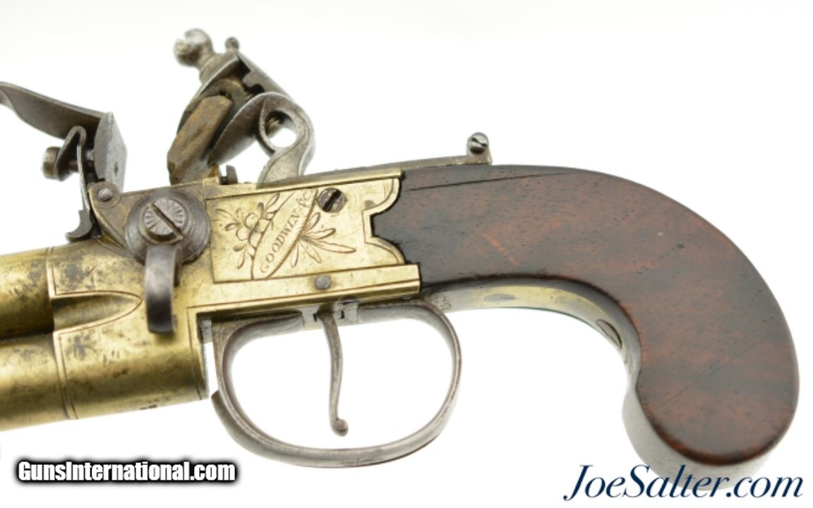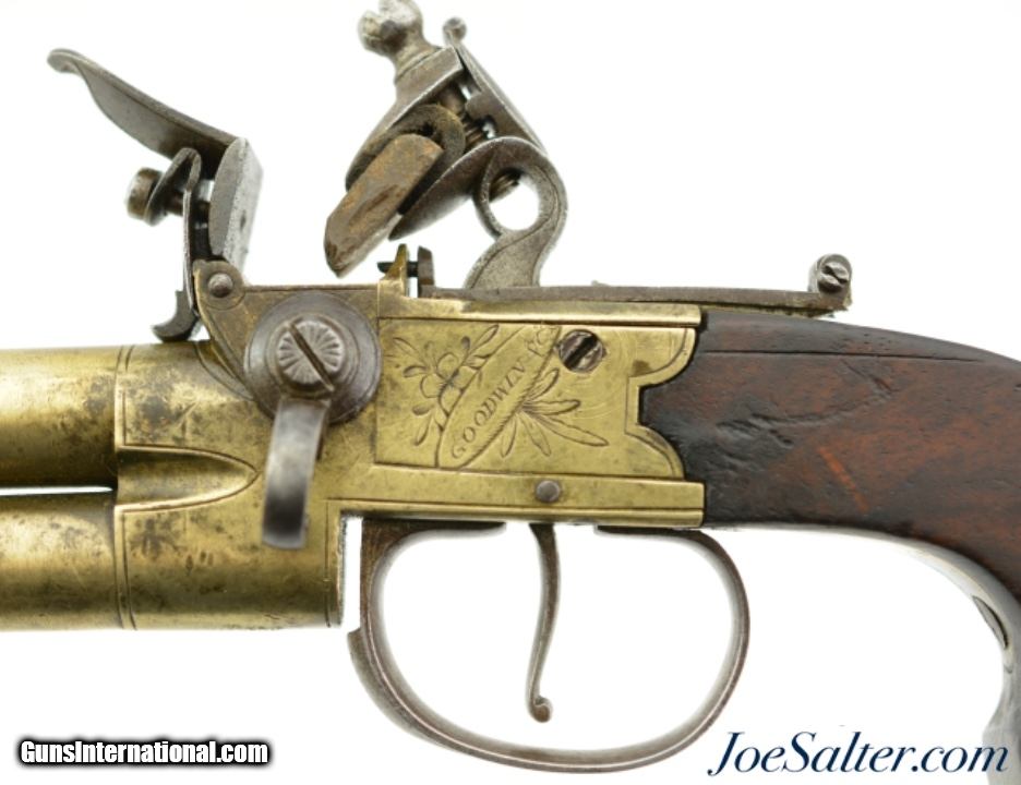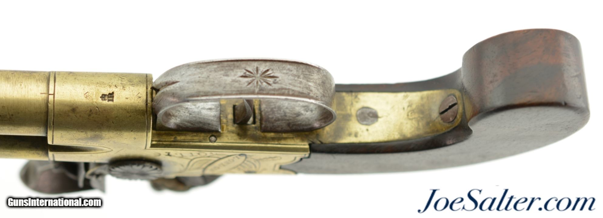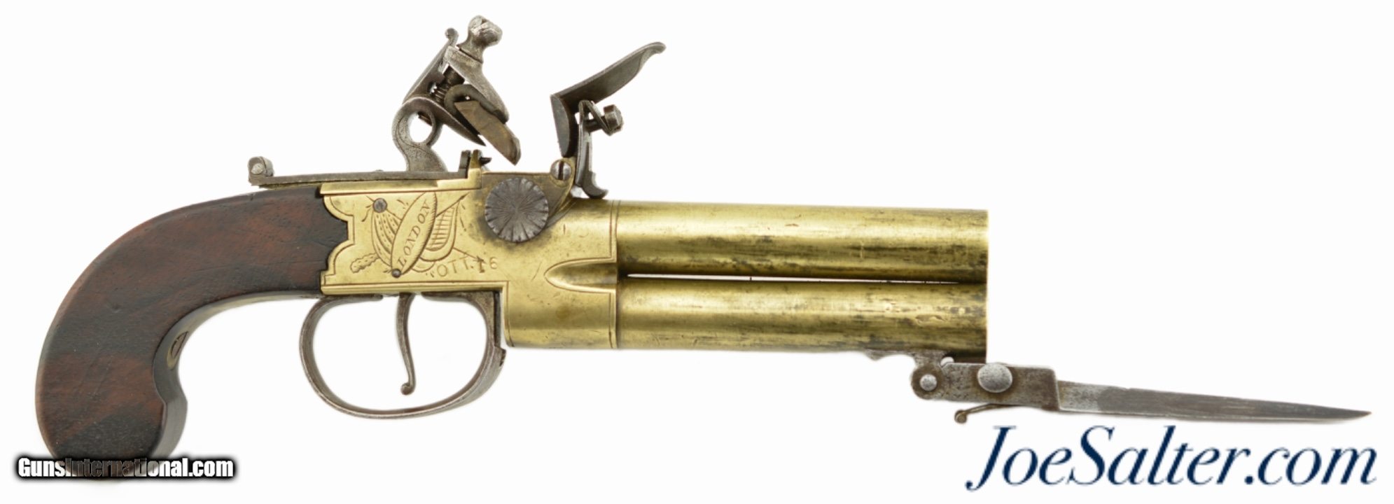 Description: NSN, approximately .41 Caliber, 4 1/8" barrels with very good, lightly pitted bores. This is a handsome pistol made ca. 1807 & 1818, that has a tap-action pan that allows for sequential firing of the top and bottom barrels. The brass frame and barrels have a pleasant, mottled yellow-ochre patina throughout. The barrels have scattered small handling blemishes, while the box frame has engraved martial panoplies on both sides with "GOODWIN & CO." and "LONDON" on the left and right sides respectively. Additionally, a 20th century British registration number is stamped into the brass on the right side. The tap, frizzen, cock, and sliding safety latch are mottled gray and plum-brown throughout, while the action is firm and fully functional. The smooth, bag-shaped walnut grip is in very good condition, although there are some linear scratches on the left side. The spring-loaded bayonet still snaps into place firmly and securely. George Goodwin was a Birmingham maker who was active in the early part of the 19th century. Many of his guns were marked "LONDON" but he did not have a trade address there. This is a fine example of a rare, tap-action bayonet pistil. Antique; SOLD Antique: Yes |