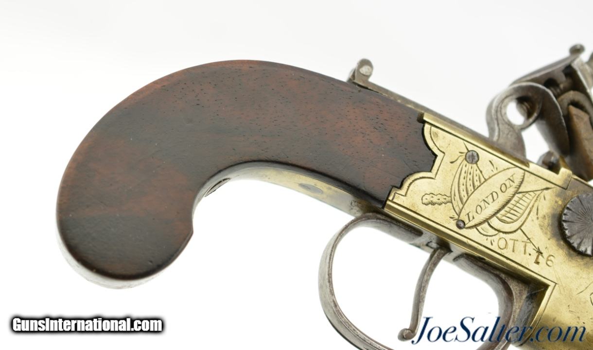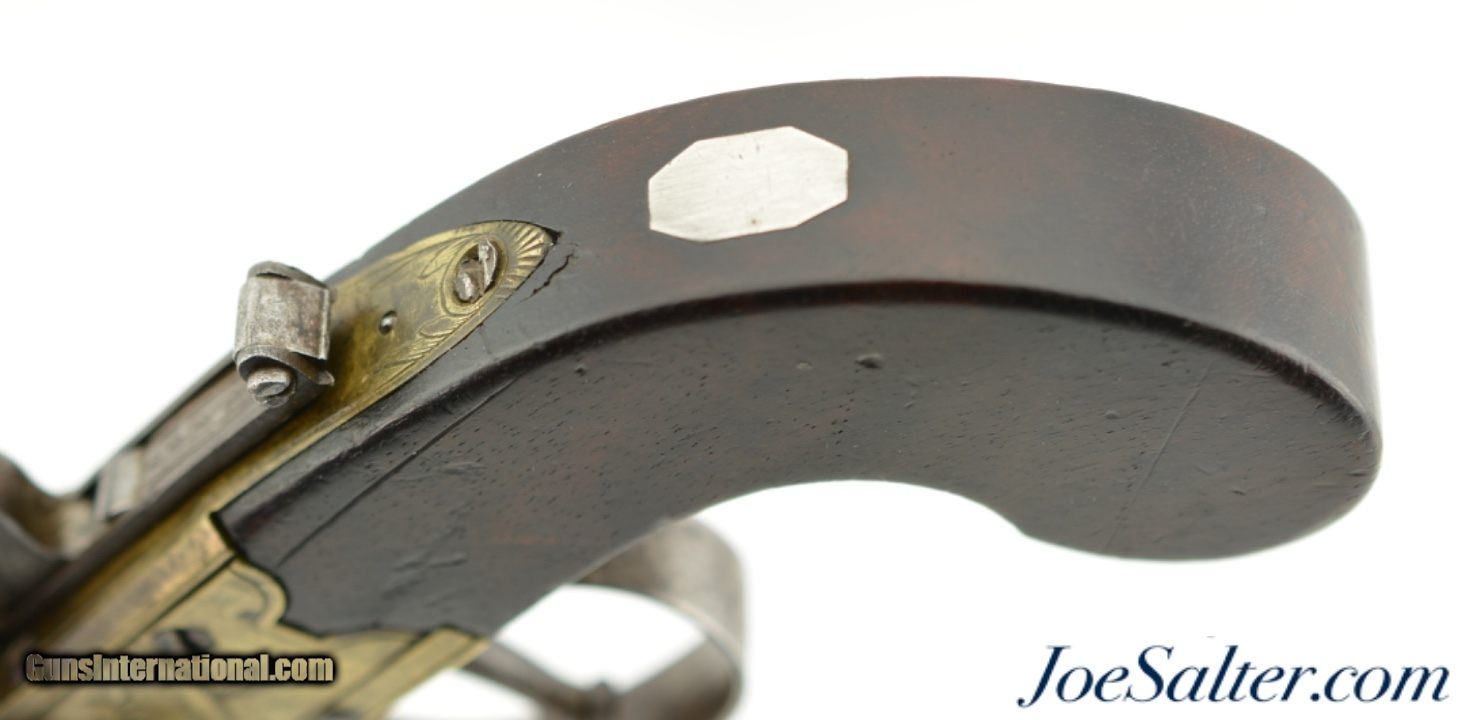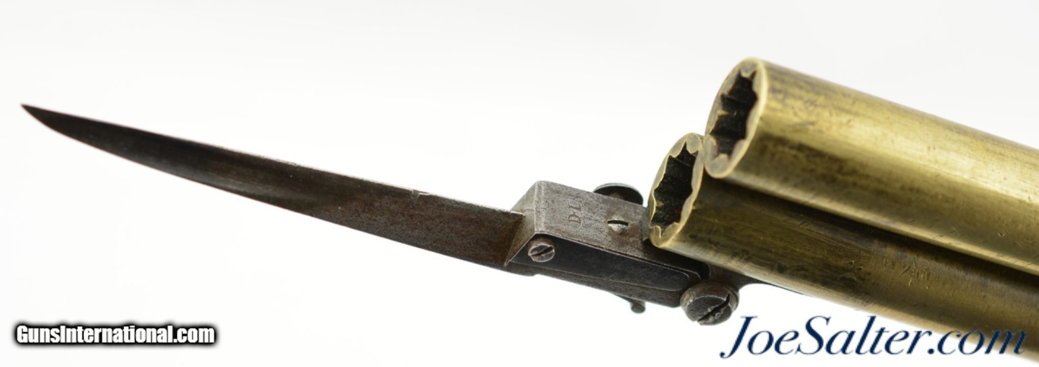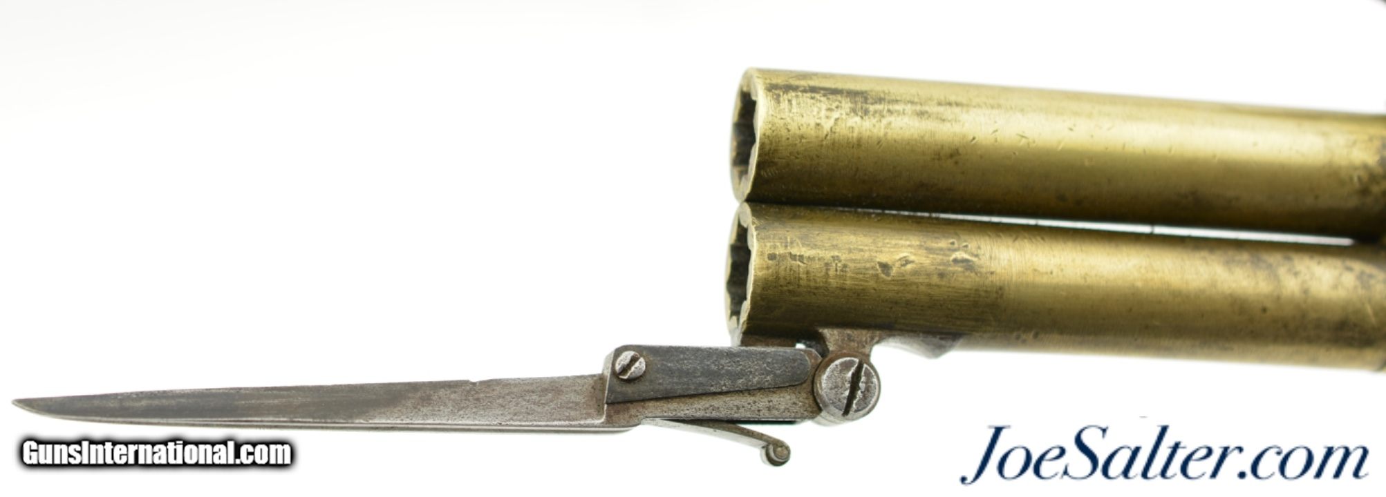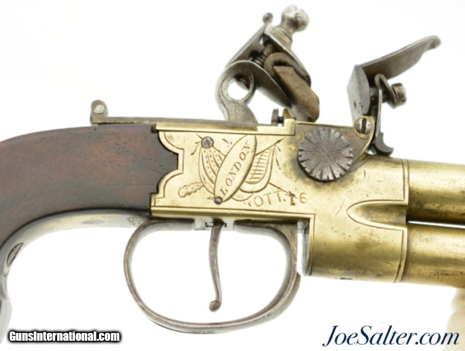 Description: NSN, approximately .41 Caliber, 4 1/8" barrels with very good, lightly pitted bores. This is a handsome pistol made ca. 1807 & 1818, that has a tap-action pan that allows for sequential firing of the top and bottom barrels. The brass frame and barrels have a pleasant, mottled yellow-ochre patina throughout. The barrels have scattered small handling blemishes, while the box frame has engraved martial panoplies on both sides with "GOODWIN & CO." and "LONDON" on the left and right sides respectively. Additionally, a 20th century British registration number is stamped into the brass on the right side. The tap, frizzen, cock, and sliding safety latch are mottled gray and plum-brown throughout, while the action is firm and fully functional. The smooth, bag-shaped walnut grip is in very good condition, although there are some linear scratches on the left side. The spring-loaded bayonet still snaps into place firmly and securely. George Goodwin was a Birmingham maker who was active in the early part of the 19th century. Many of his guns were marked "LONDON" but he did not have a trade address there. This is a fine example of a rare, tap-action bayonet pistil. Antique; SOLD Antique: Yes |