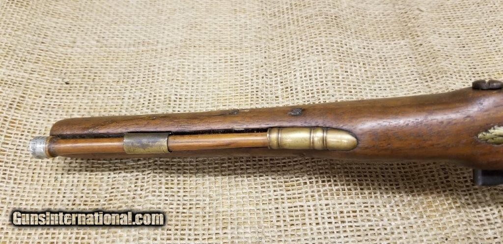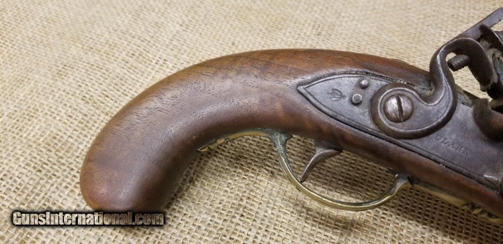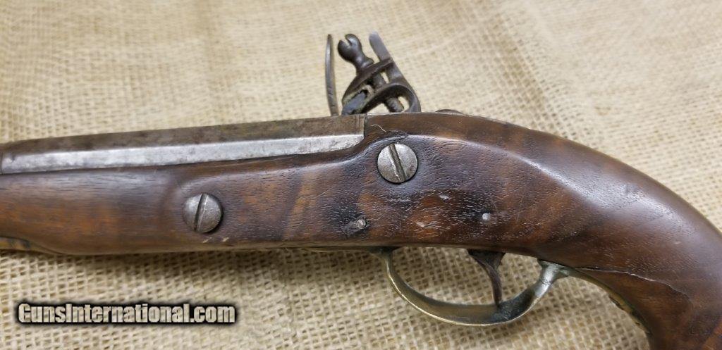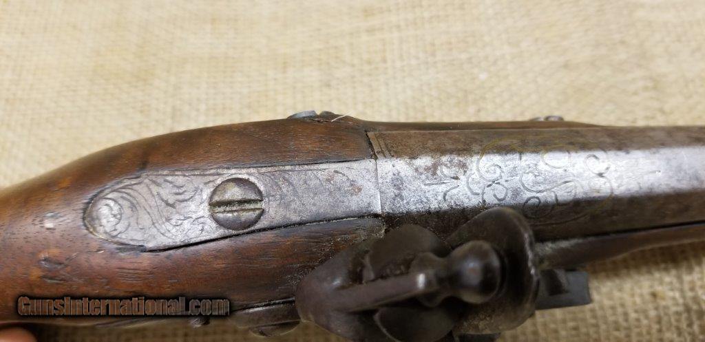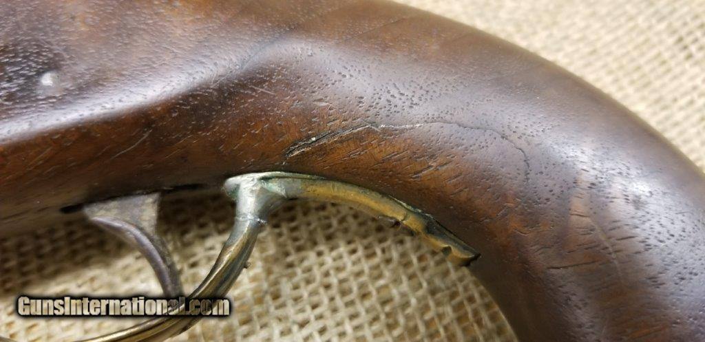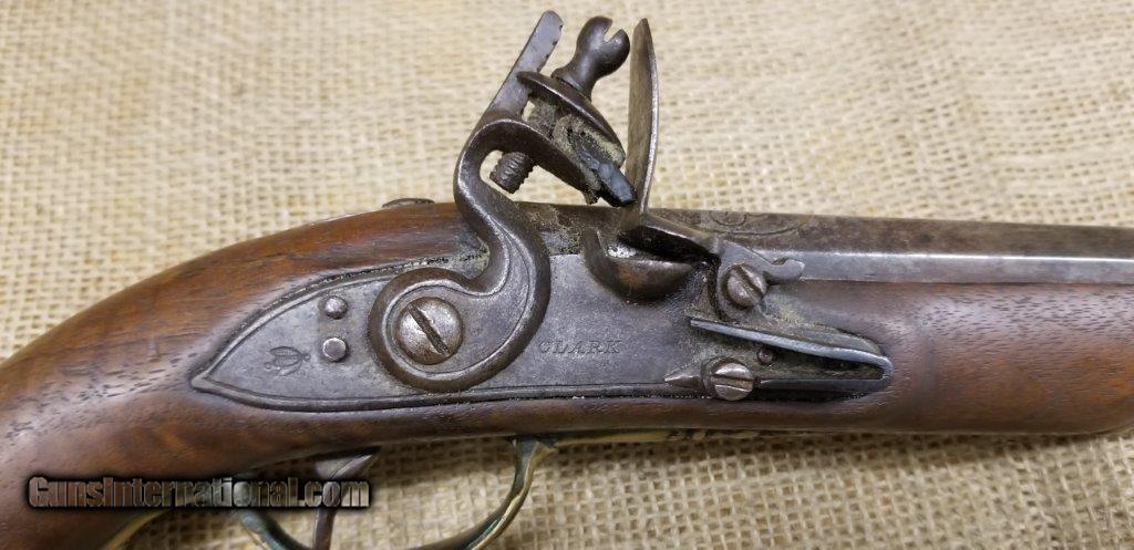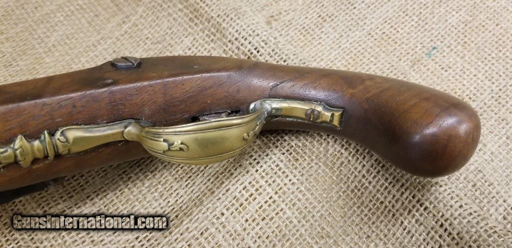 Description: British Clark Gentleman's Flintlock Pistol Marked Clark on lock plate Circa 1800 Brass trigger guard with torch pattern Repair behind trigger Octagon barrel converting to round Brass inlay on top of octagon barrel Brass thimble Walnut stock with cane handle Outlined gooseneck cock Action does not stay back, have not taken lock off to see what the issue may be. Barrel measures .585, length is 9 7/8 inch. Overall length is 15 inches. SOLD Antique: Yes |