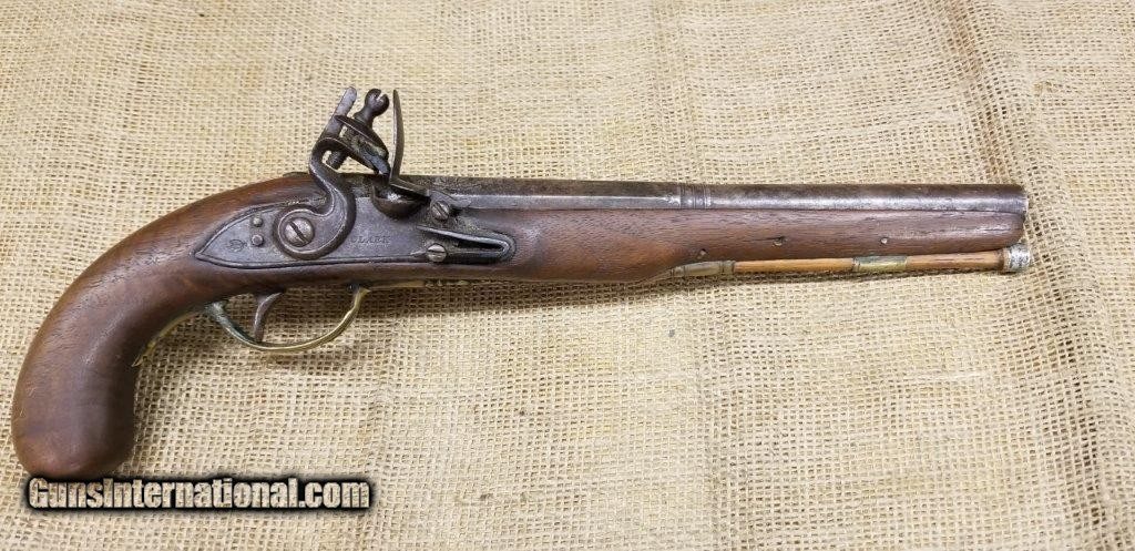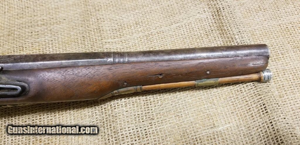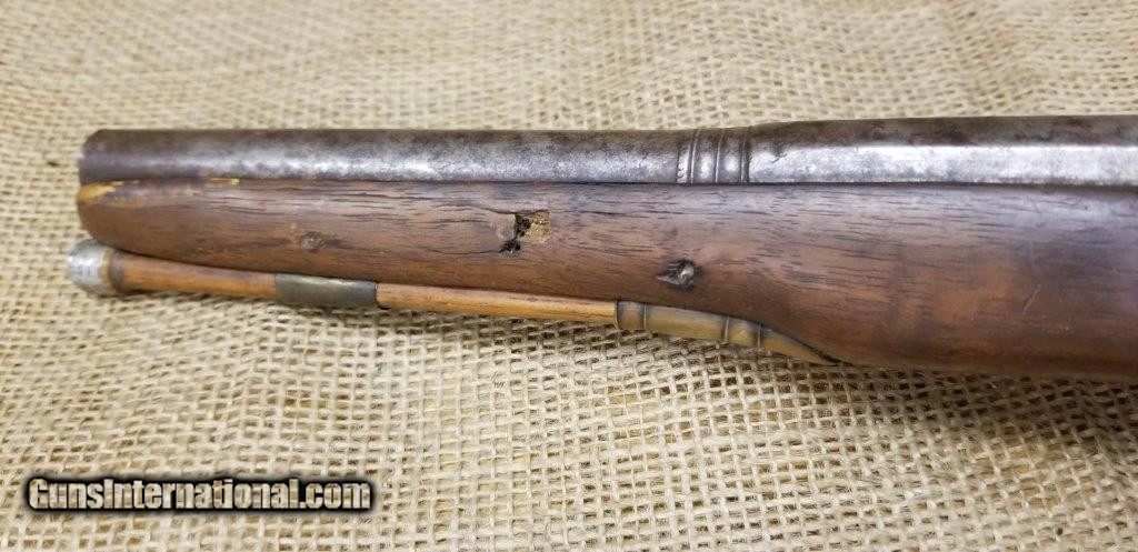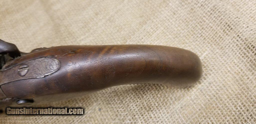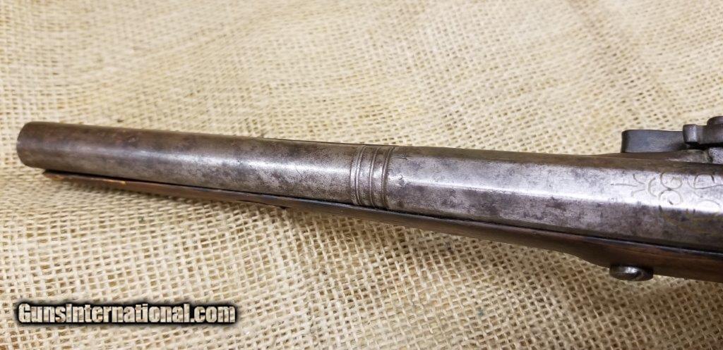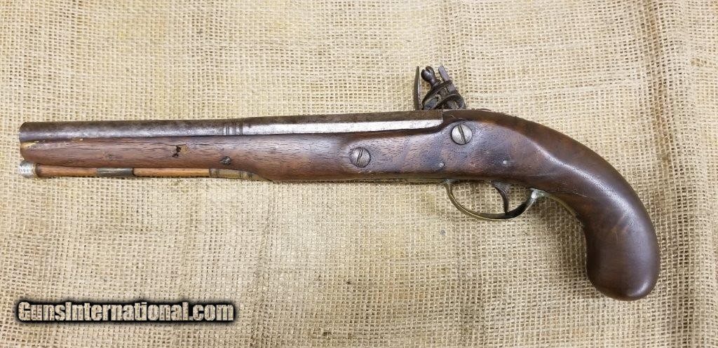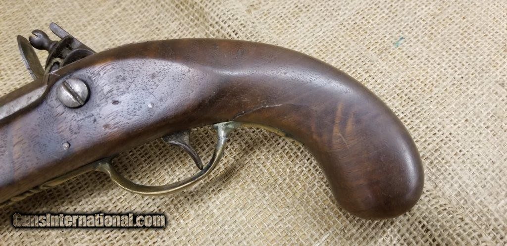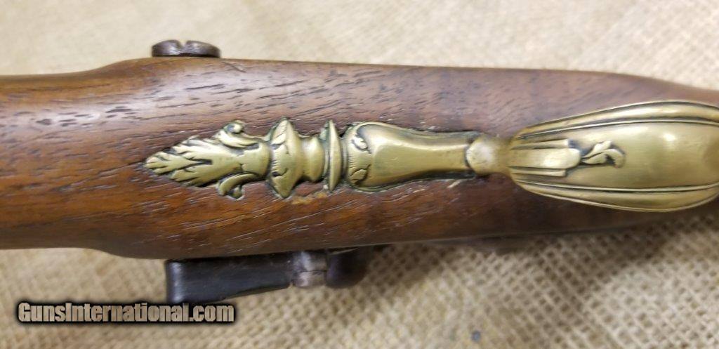 Description: British Clark Gentleman's Flintlock Pistol Marked Clark on lock plate Circa 1800 Brass trigger guard with torch pattern Repair behind trigger Octagon barrel converting to round Brass inlay on top of octagon barrel Brass thimble Walnut stock with cane handle Outlined gooseneck cock Action does not stay back, have not taken lock off to see what the issue may be. Barrel measures .585, length is 9 7/8 inch. Overall length is 15 inches. SOLD Antique: Yes |