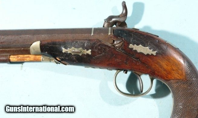 Description: BRITISH MANUFACTURED HENRY DERINGER STYLE PERCUSSION SILVER MOUNTED PISTOL FOR THE AMERICAN MARKET BY RICHARD HOLLIS & SONS CA. 1840’S-50’s. 10” with 5 ½” very fine true Damascus octagon .50 cal. barrel. Engraved lock and hammer. Lock engraved “RICH HOLLIS & SONS” Engraved German silver mounts. Walnut Deringer style stock with checkered bag shaped grip. All original except wood ramrod. Good overall with the original dark patina on metal and original wood finish. Many of this very popular style pistol imported from England to America particularly to the Southern states. Richard Hollis was a well known Birmingham maker in the mid 19th Century. SOLD Antique: Yes |