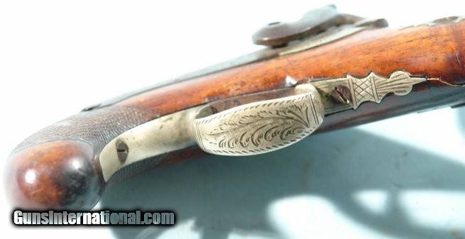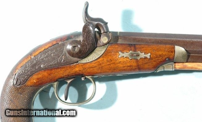 BRITISH MANUFACTURED HENRY DERINGER STYLE PERCUSSION SILVER MOUNTED PISTOL FOR THE AMERICAN MARKET BY RICHARD HOLLIS & SONS CA. 1840’S-50’s.