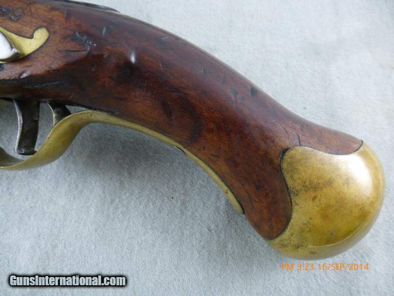 Description: BRITISH MILITARY ROYAL NAVY LONG SEA SERVICE British Military Royal Navy Sea Service Flintlock Pistol, circa. 1770’s. 12,.577 (regulation) round steel barrel w/ (2) Tower Proofs and another crown on tang. Lock marked; “TOWER” on end and a “CROWN” over “GR”, with a small crown and an arrow to the right of the large Crown which indicate service under the Crown. Stock is in Fine condition with a few unnoticeable cracks, dings and dents and original storekeepers markings stamped all over it. Has the original belt hook with crown proof. Very interesting, and historical. Metal has almost no corrosion markings are very readable. Brass regulation furniture. 19.5” Overall length. A very nice example that could have seen service during the American Revolutionary War. In good working order, locks up well on half cock and cock. (14-121) I take Visa/MasterCard, add 3%. Allow two weeks for all checks, whether bank, personal or certified to clear. It is also possible to wire funds to my account for instant credit for a $20.00 wire charge. 3 day- no questions asked return period for refund of price paid for gun (does not include shipping and credit card costs). Call or email with any questions or for more pictures. Guns are antique and should not be fired without examination by gunsmith. $50 shipping for long guns, $30 for hand guns to lower 48 states, about $50-$75 to most European countries and $70-$80 to Australia for antique handguns, carbines $75-$125. We can generally get insurance if you want through shipper but coverage is limited. Notify me if you want it. You can send 20% down- balance in 90 days for installment payment plan. No refunds on installment plans. I have shipped to Norway (long gun w/fragile stock) see feedback, England (Winchester1876, Rem. Dbl. Derr.), Northern Ireland, France, Australia and Sweden. Email if you are not U.S. for estimated shipping costs, payment methods, etc. I am always buying and trading for antique and collectible guns, Indian items, rare ammo, etc. Email what you have got for sale or trade. SOLD Antique: Yes |
