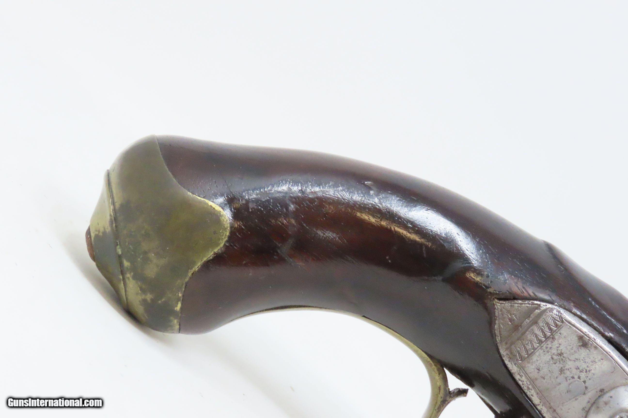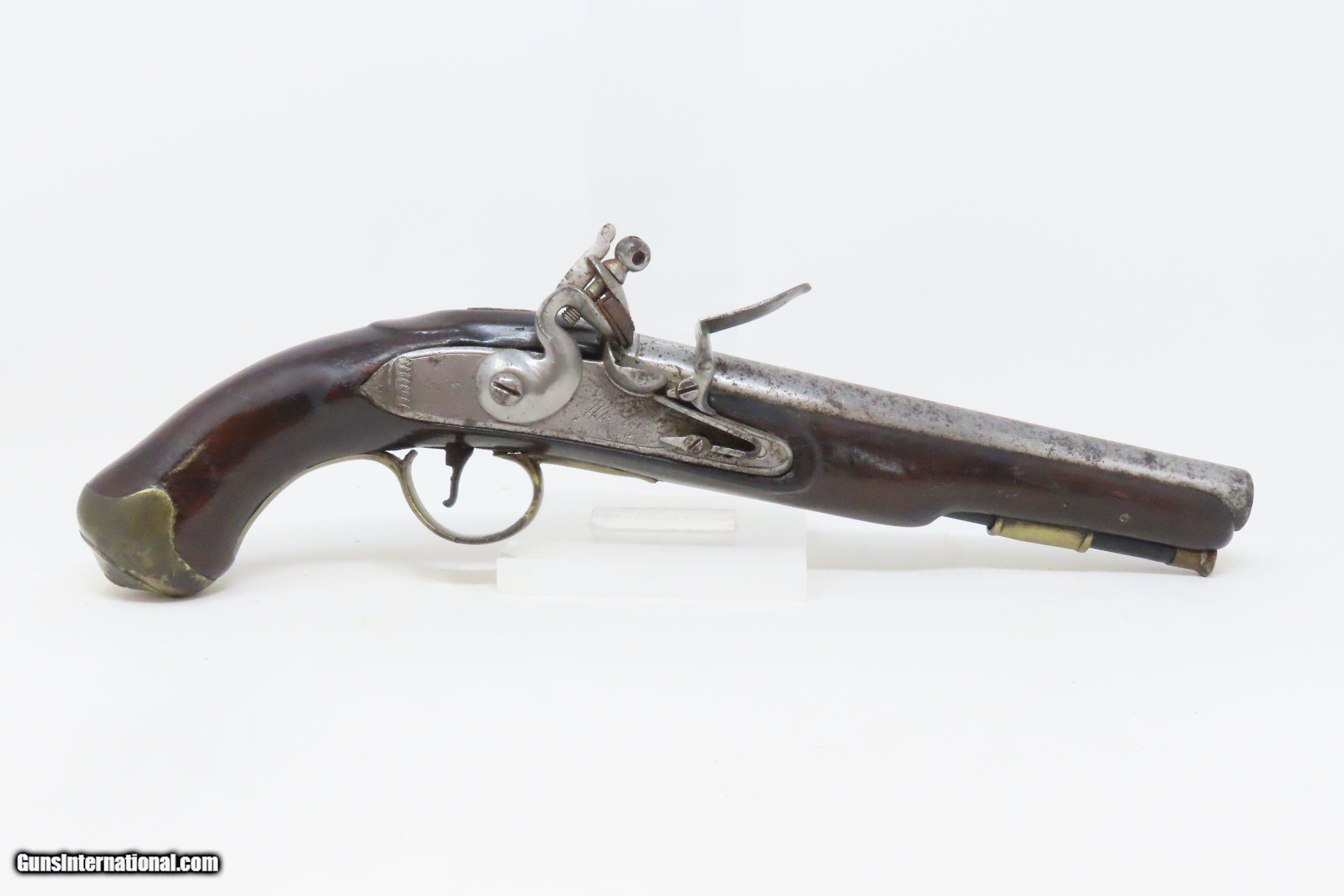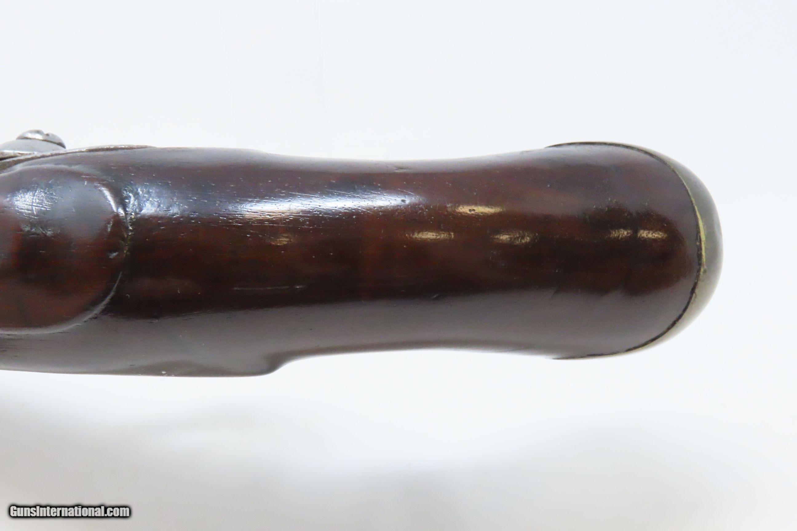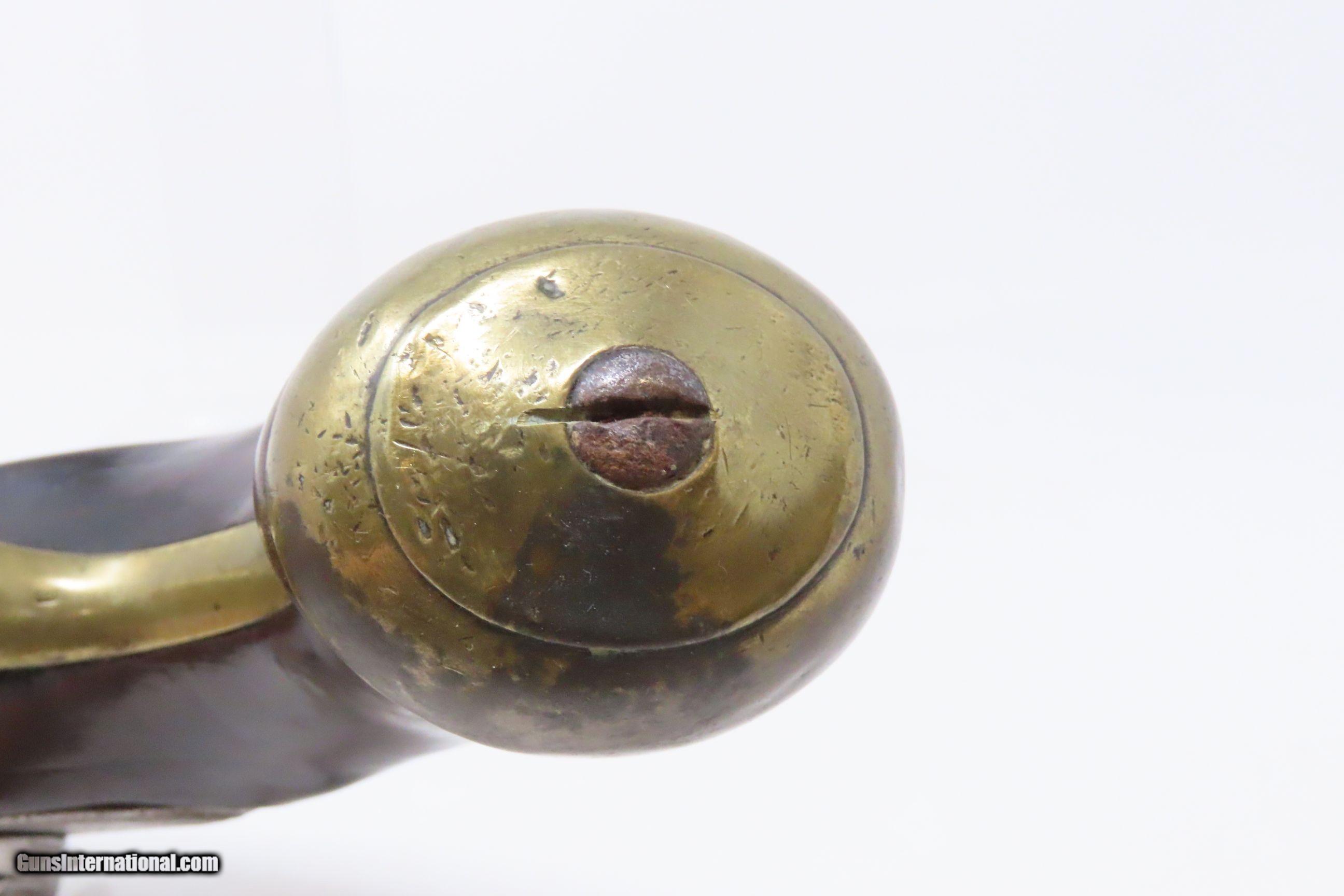 Description: British WHEELER Antique LIGHT DRAGOON Pattern .69 Flintlock CAVALRY Pistol British Military Flintlock Here we present an antique British Wheeler Marked Light Dragoon Flintlock Pistol, made circa the mid to late-18th Century. This pistol would have been carried by a member of the British Light Dragoons. Light Cavalry in the British Army began to be more highly developed and organized during this very period of the mid to late-1700s. By the 18th century, cavalry represented one of the three basic troop types of any European army, along with the infantry and artillery. Mounted troops came in a variety of different types, depending on the role that they played on the battlefield. Light cavalry rode small quick horses and carried light weapons ideal for scouting and skirmishing. Heavy cavalry, including cuirassiers and lancers, on the other hand, were often armored and were mounted on strong powerful horses which they used to smash and break enemy formations in close combat. The nature of the terrain and the tactical realities of the American Revolution reduced the use of cavalry, forcing battlefield commanders to adapt their tactics from those used in Europe. While not as important to the outcome of the conflict as infantry or artillery, the cavalry of both the British and American armies were essential to the war effort. Two British Regiments, the 16th & 17th, participated in the attempt to put down the American Revolution against British rule from 1775-1783. The overall condition is good. Weathered appearance. The action will hold half-cock but not full cock. Reconverted to flintlock. The bore is smooth and dim. The stock has a repaired split on the left stock flat and all is stable and solid. Some faint Birmingham proofs are visible on the barrel. Own the original! This is a legitimate antique and not a reproduction. Barrel is 9 inches. Caliber: .69 Flintlock Overall condition as seen in photos. Very Fast. Very Safe. FREE SHIPPING WORLDWIDE. Delivered directly to your door by express mail! Guaranteed AUTHENTIC & Includes CERTIFICATE OF AUTHENTICITY. ancestryguns $1600 #230363 SOLD Antique: Yes |