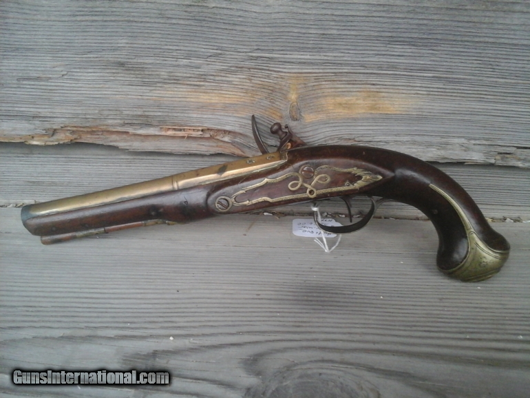 Description: All brass except for the hammer, frizzen, barrel tang and spring. The lock is marked "BUNNEY", the top barrel flat at the breech end is marked "LONDON" and the left rear flat is marked with two crown over scepter proofmarks. Light floral scroll engraving on the breech end of the barrel, trigger guard, buttcap and on the left side plate wooden ramrod with swelled head and mounted with a full walnut stock.3 day inspection allowed. Will trade for gold or silver SOLD Antique: Yes |