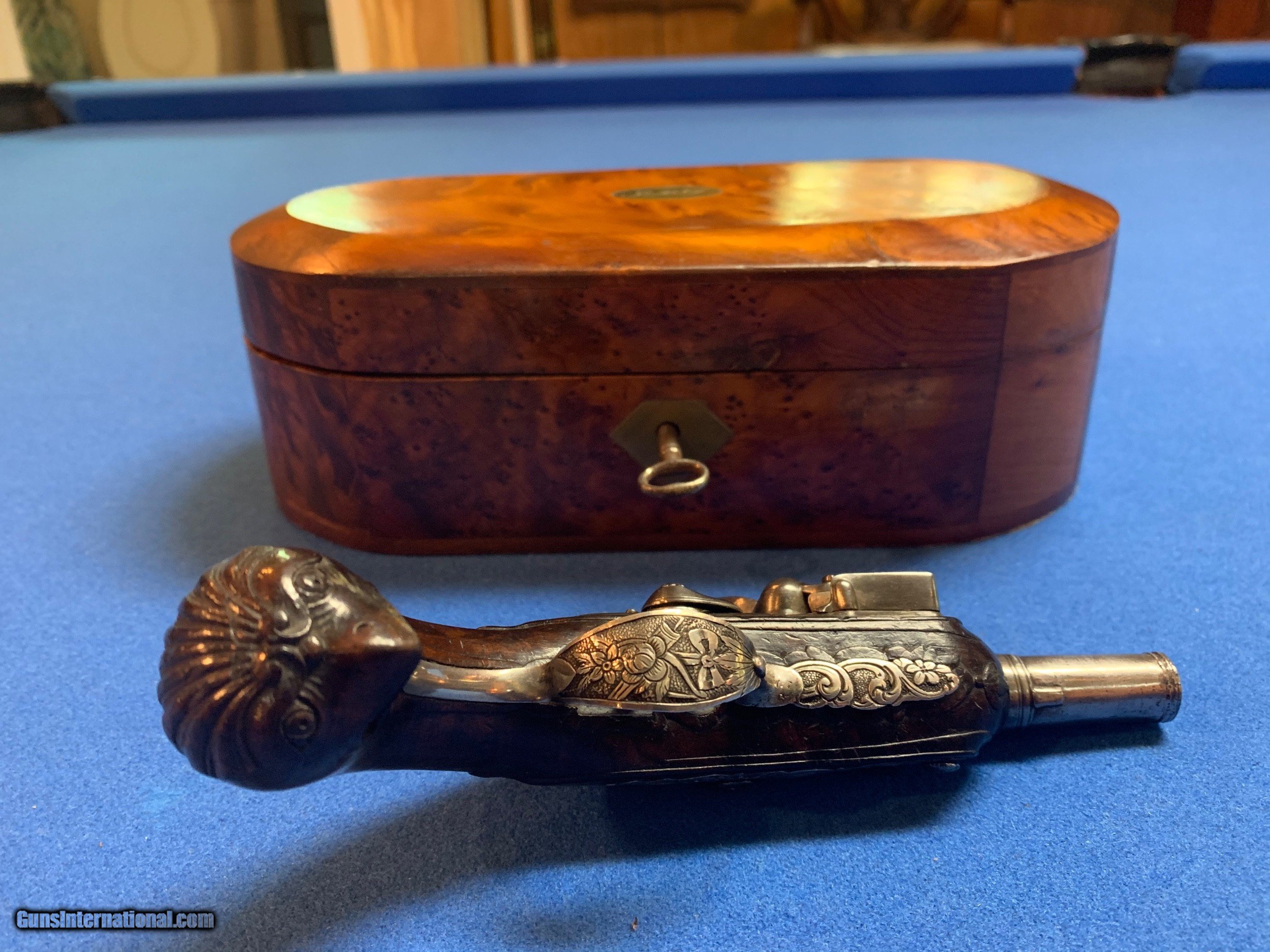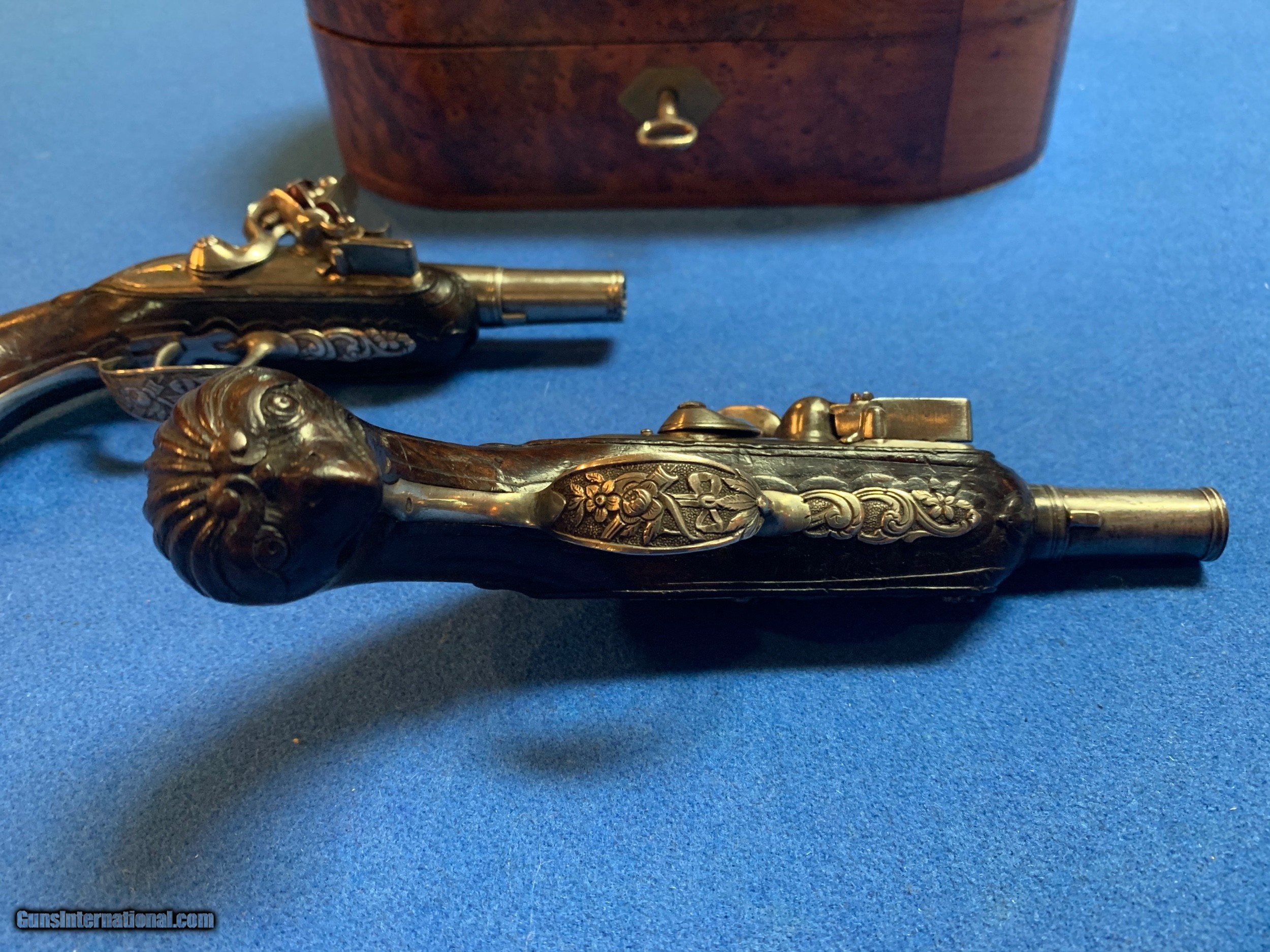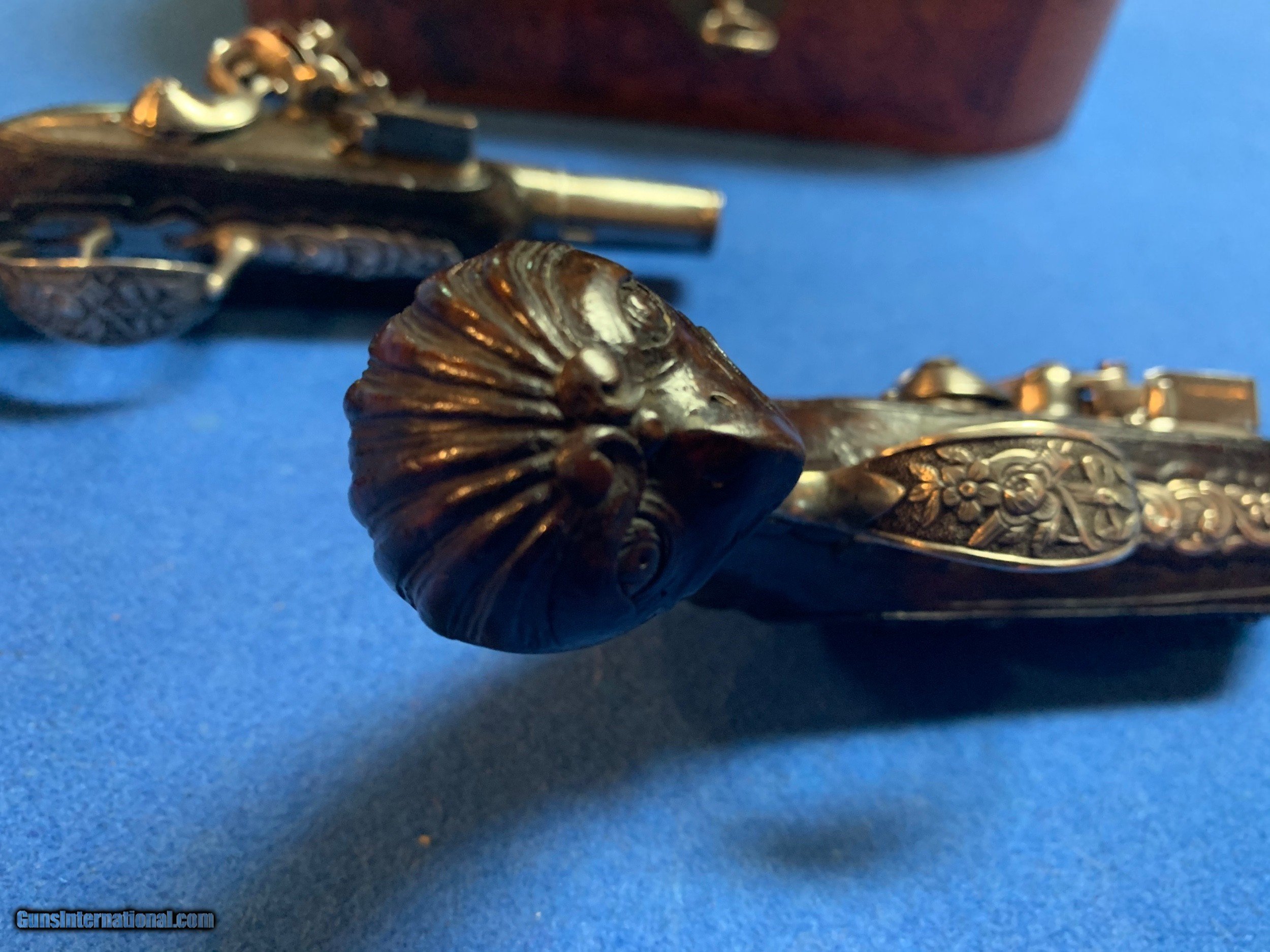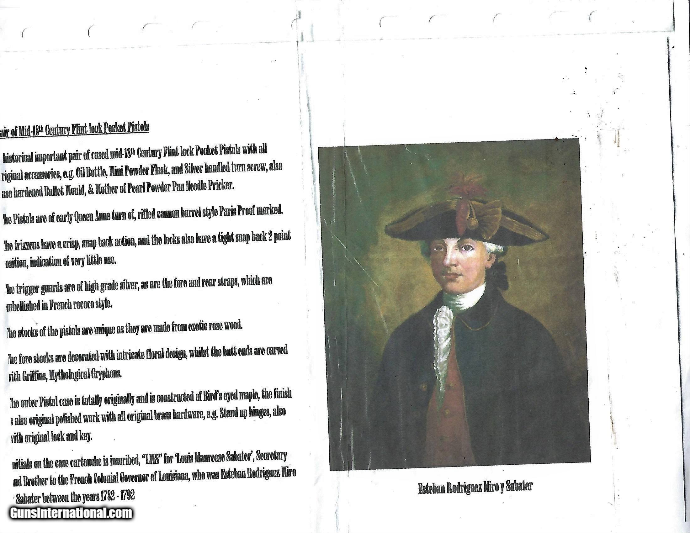 Description: Historical Important pair of cased 18th Century Queen Anne turn off Rifled Cannon barrels Flintlock High Grade Silver amounted Pistols with all Original Accessories. Housed in a Exotic Burl Wood Case made of Birds Eye Maple . Comes with Oil Bottle , Mini Powder Flask , Siver Handled turn Screw, Case Hardened Bullet Mold and the Original Key. Both pistols are in excellent original working order. Both pistols are correct and 100 percent originals. The barrels are Original in the White Finish. Markings and Engraving are crisp. The Stocks are made of Rosewood. And have Mythological Gryfons head carved grip. The enitial s are on box and tools LMS. The owner Louis Maureese Sabador , Secretary and brother to the Colonial Governor of Louisiana , who was Esteban Rodriguez Moro Sabater between the years 1782- 1792. One of a kind set ! Made of the highest Quality. Please review my photos and please email me with any questions? 3 day inspection. Thank you for looking , Little Jo SOLD Antique: Yes |