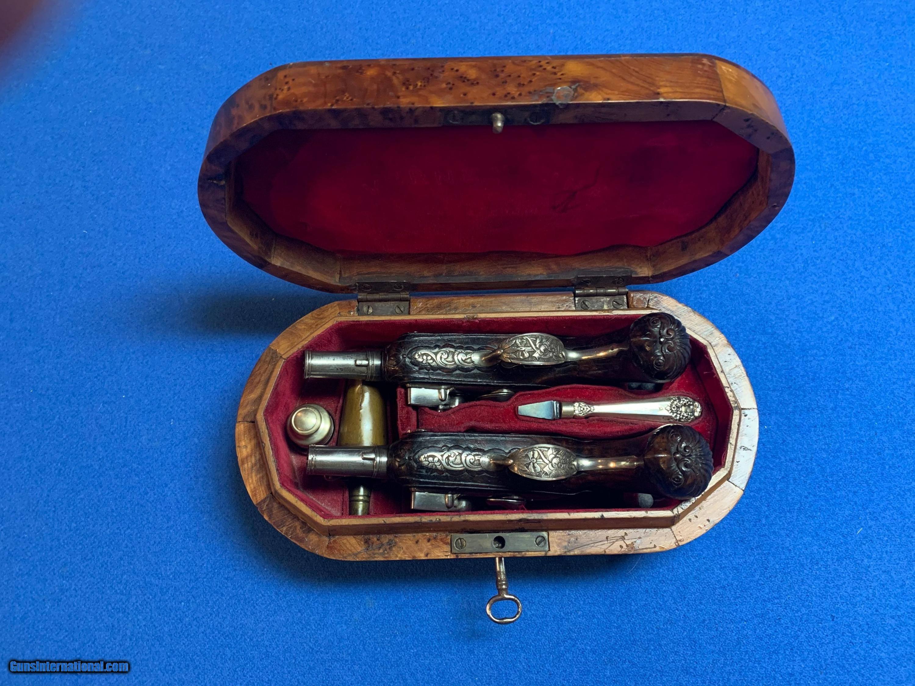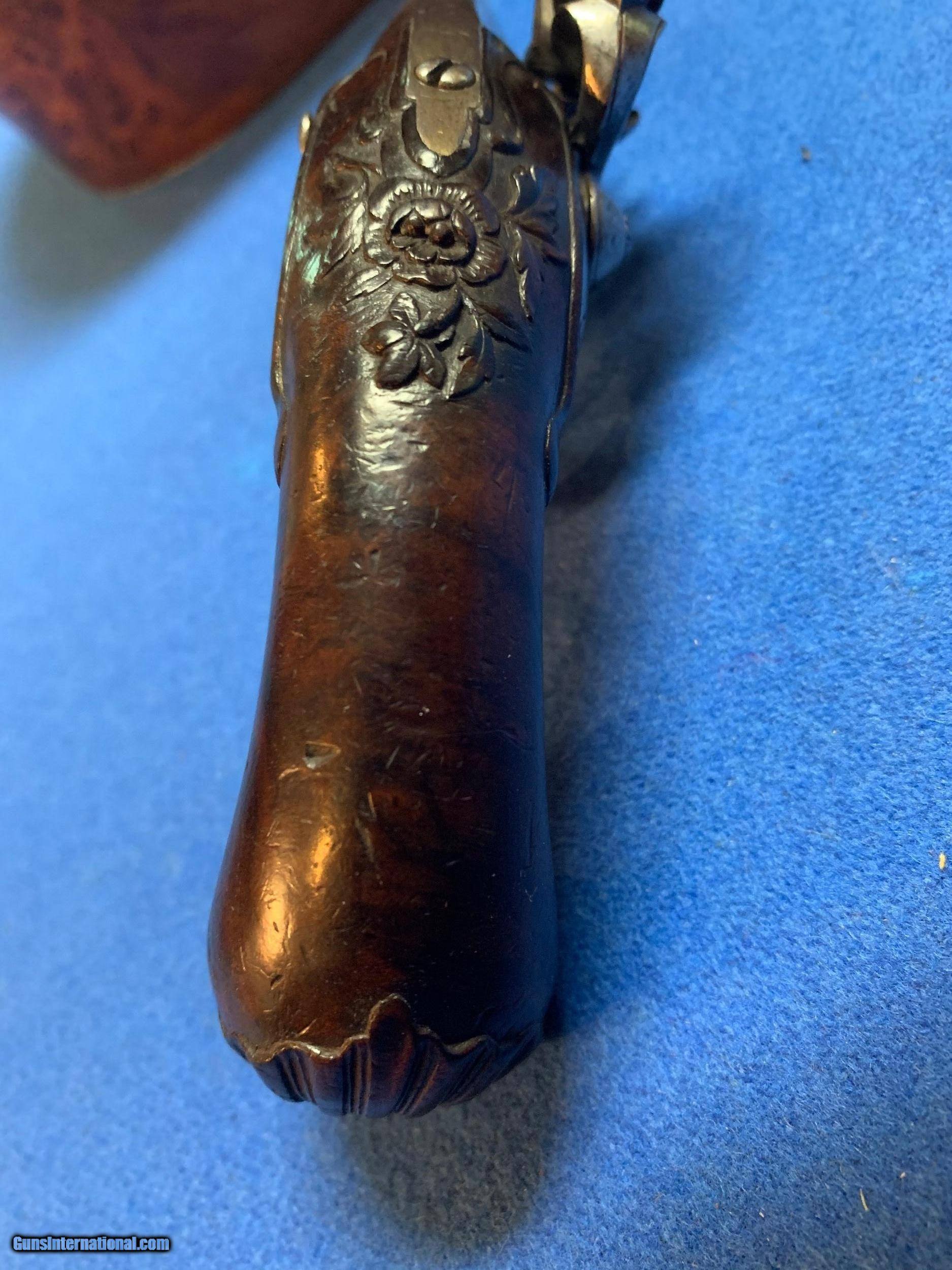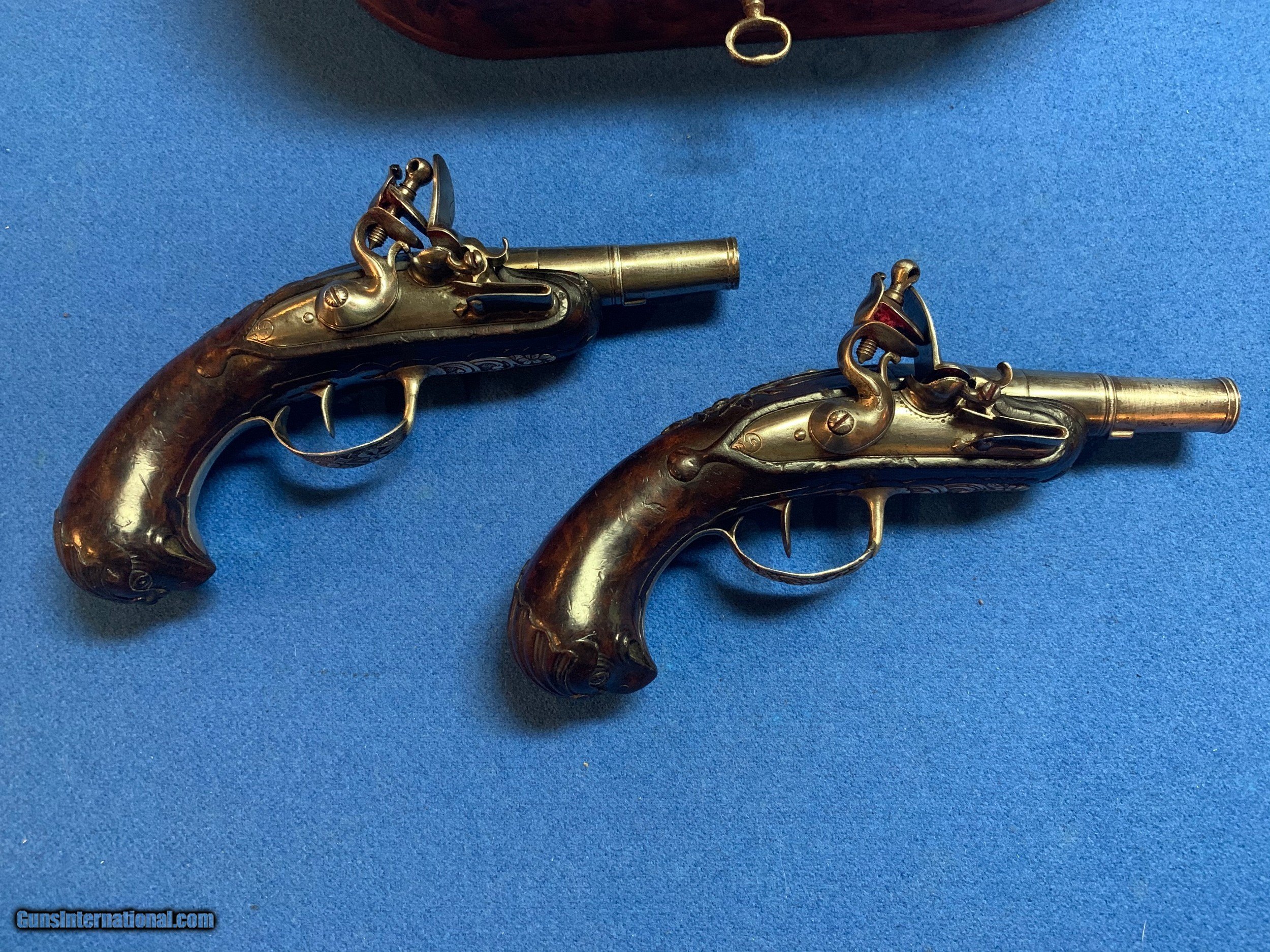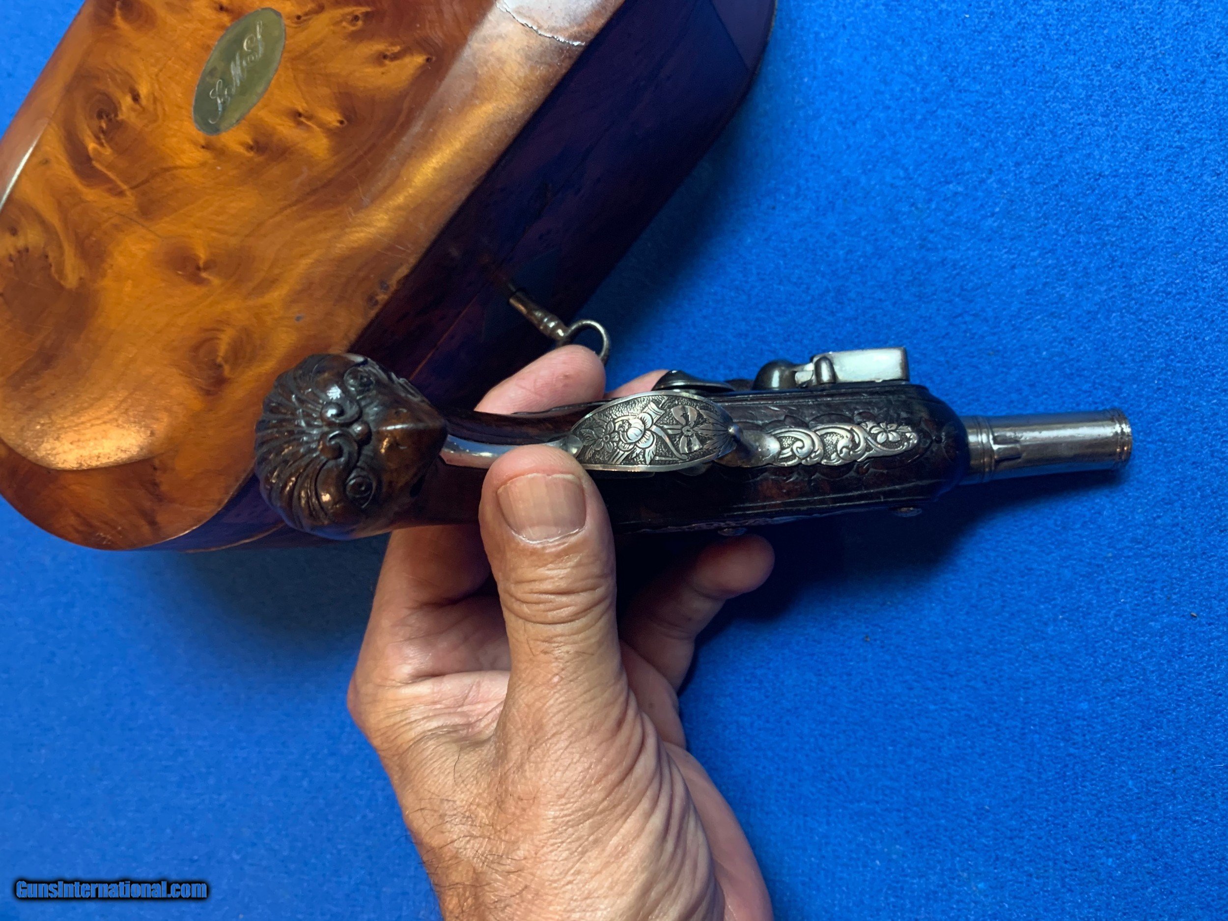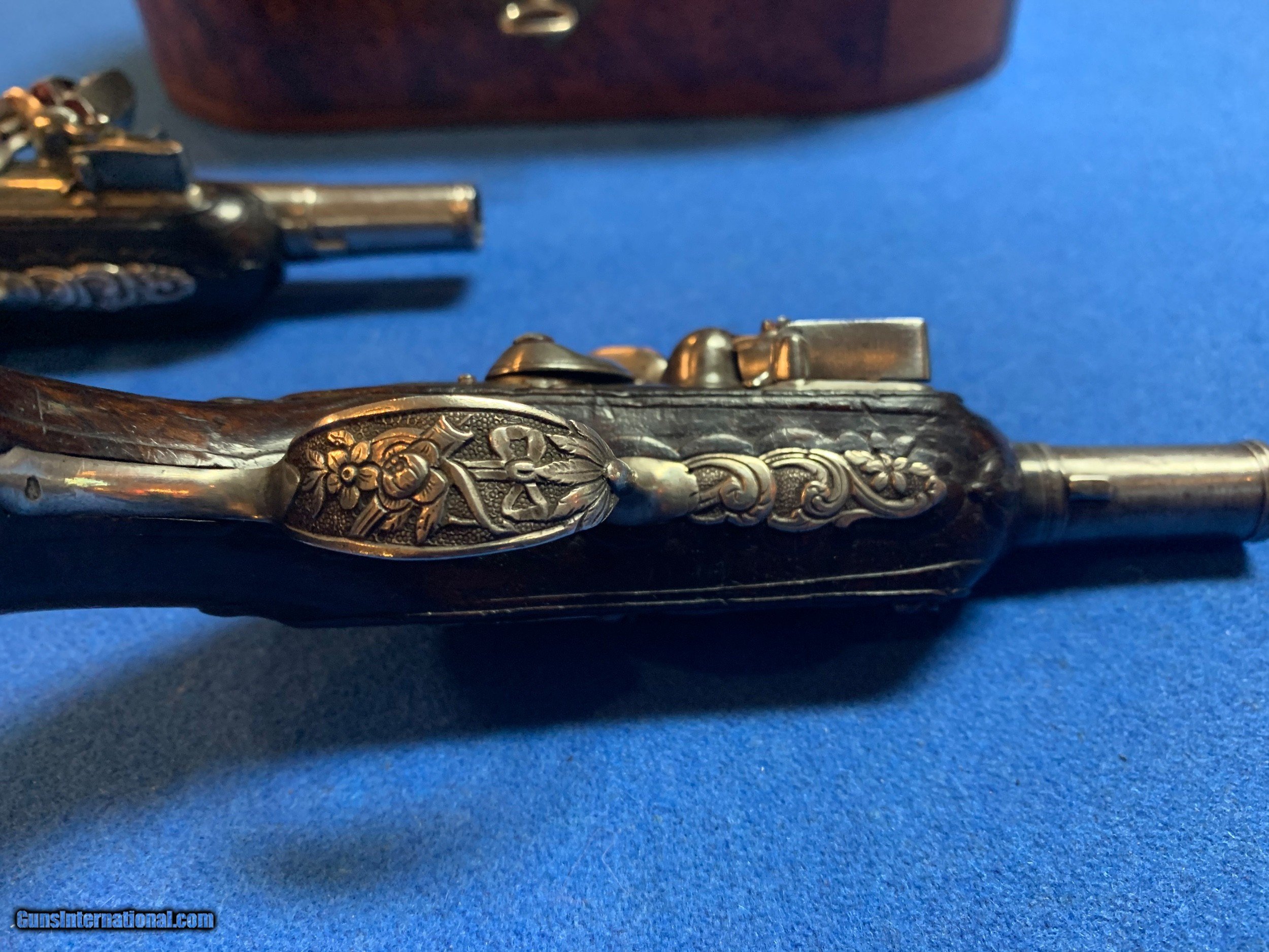 Description: Historical Important pair of cased 18th Century Queen Anne turn off Rifled Cannon barrels Flintlock High Grade Silver amounted Pistols with all Original Accessories. Housed in a Exotic Burl Wood Case made of Birds Eye Maple . Comes with Oil Bottle , Mini Powder Flask , Siver Handled turn Screw, Case Hardened Bullet Mold and the Original Key. Both pistols are in excellent original working order. Both pistols are correct and 100 percent originals. The barrels are Original in the White Finish. Markings and Engraving are crisp. The Stocks are made of Rosewood. And have Mythological Gryfons head carved grip. The enitial s are on box and tools LMS. The owner Louis Maureese Sabador , Secretary and brother to the Colonial Governor of Louisiana , who was Esteban Rodriguez Moro Sabater between the years 1782- 1792. One of a kind set ! Made of the highest Quality. Please review my photos and please email me with any questions? 3 day inspection. Thank you for looking , Little Jo SOLD Antique: Yes |