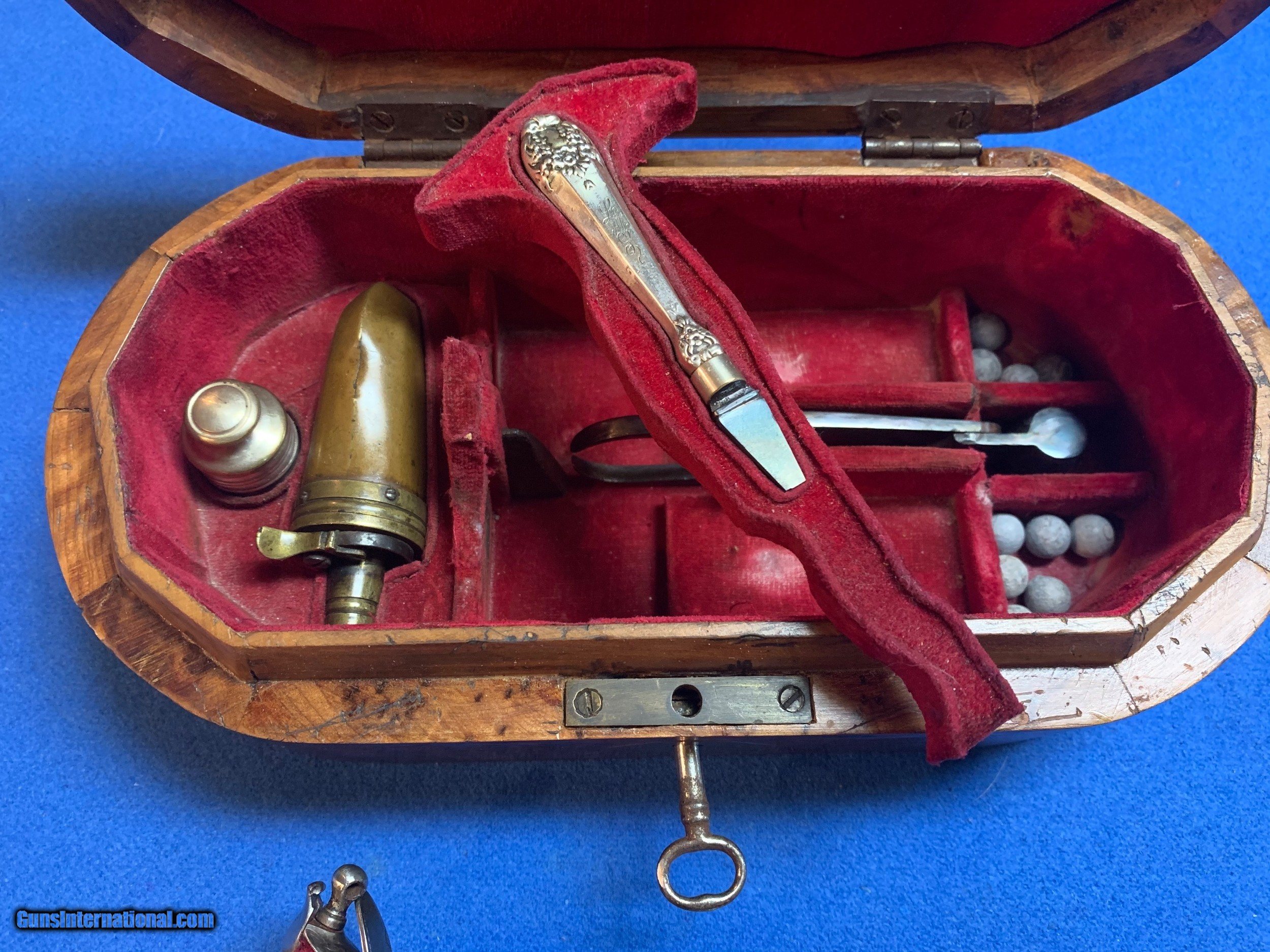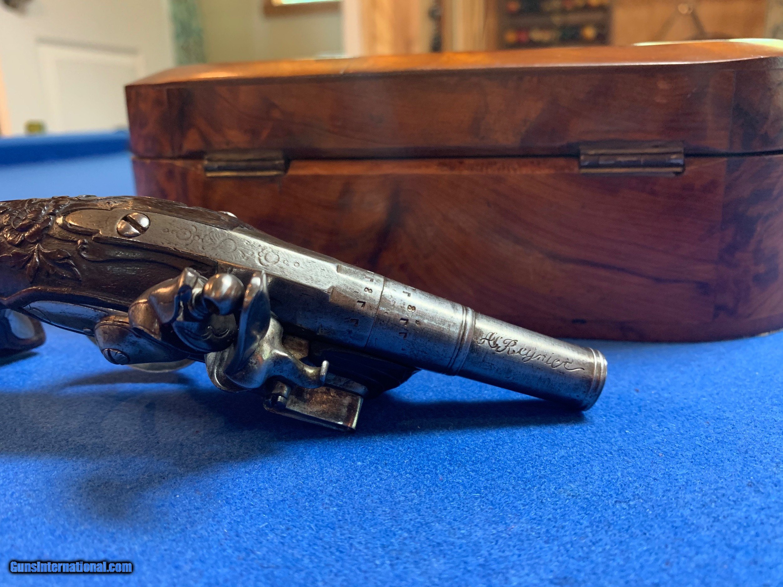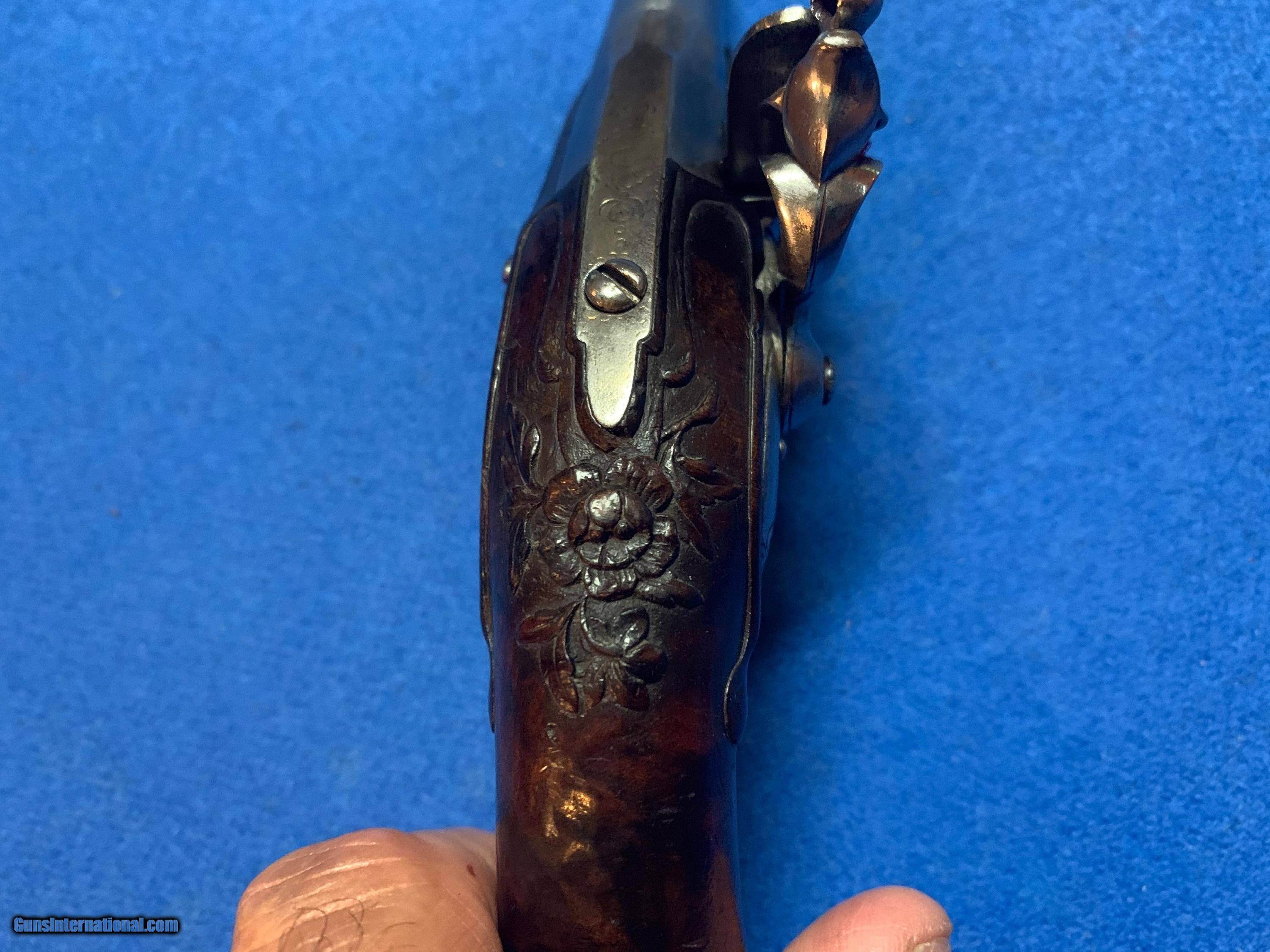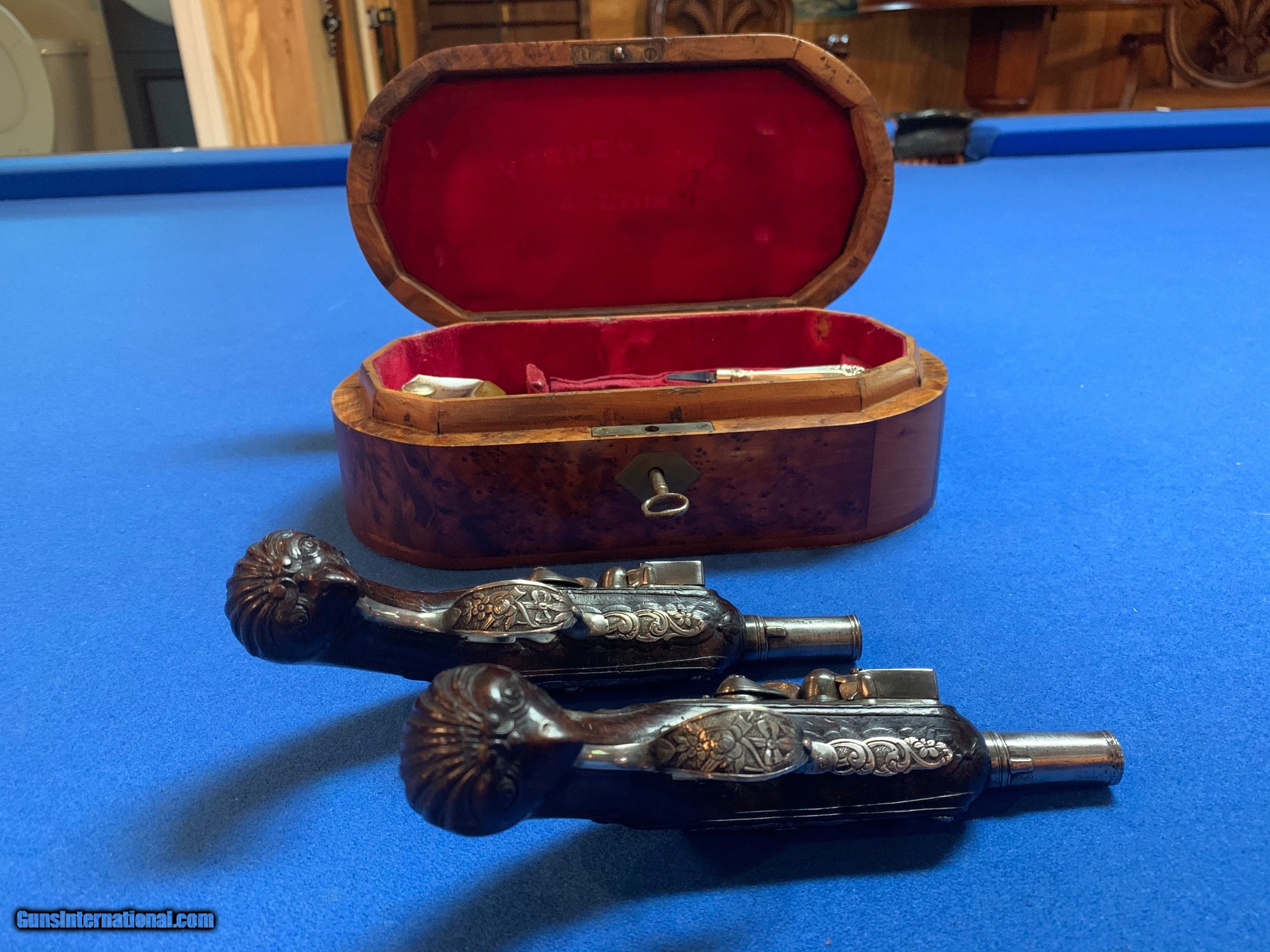 Description: Historical Important pair of cased 18th Century Queen Anne turn off Rifled Cannon barrels Flintlock High Grade Silver amounted Pistols with all Original Accessories. Housed in a Exotic Burl Wood Case made of Birds Eye Maple . Comes with Oil Bottle , Mini Powder Flask , Siver Handled turn Screw, Case Hardened Bullet Mold and the Original Key. Both pistols are in excellent original working order. Both pistols are correct and 100 percent originals. The barrels are Original in the White Finish. Markings and Engraving are crisp. The Stocks are made of Rosewood. And have Mythological Gryfons head carved grip. The enitial s are on box and tools LMS. The owner Louis Maureese Sabador , Secretary and brother to the Colonial Governor of Louisiana , who was Esteban Rodriguez Moro Sabater between the years 1782- 1792. One of a kind set ! Made of the highest Quality. Please review my photos and please email me with any questions? 3 day inspection. Thank you for looking , Little Jo SOLD Antique: Yes |