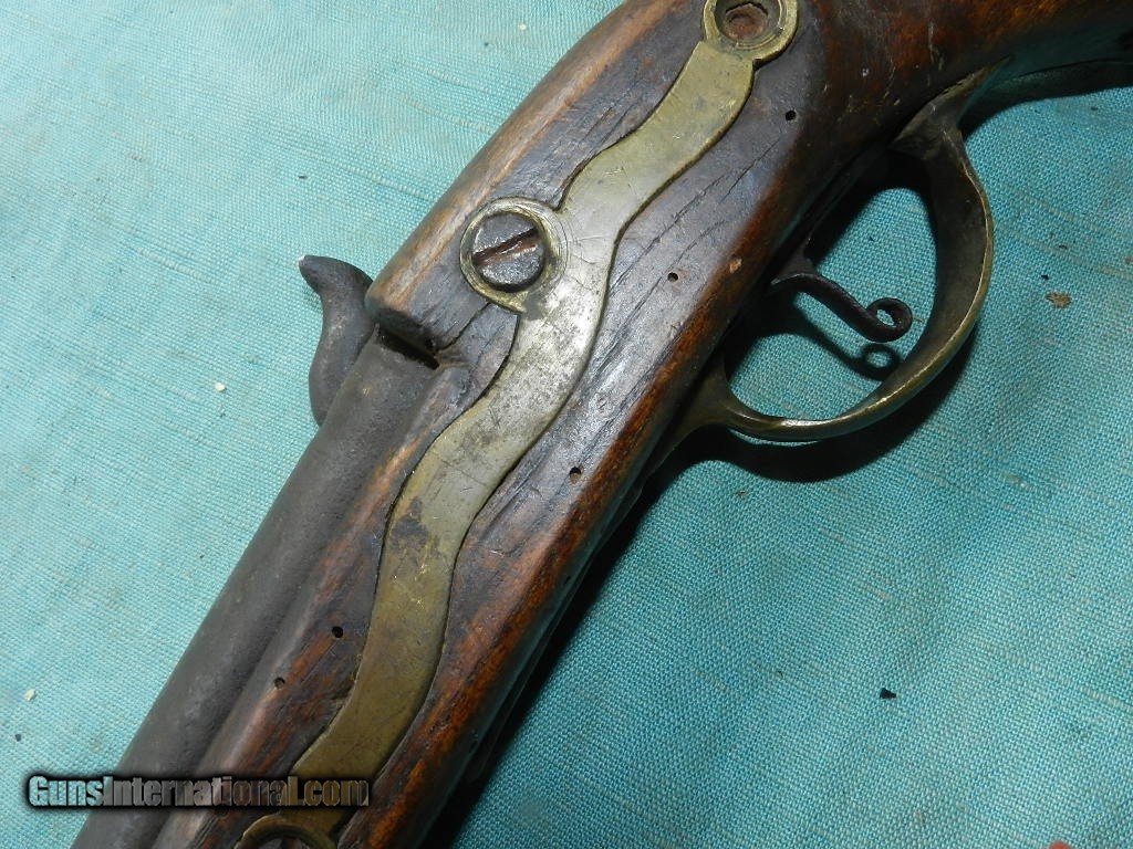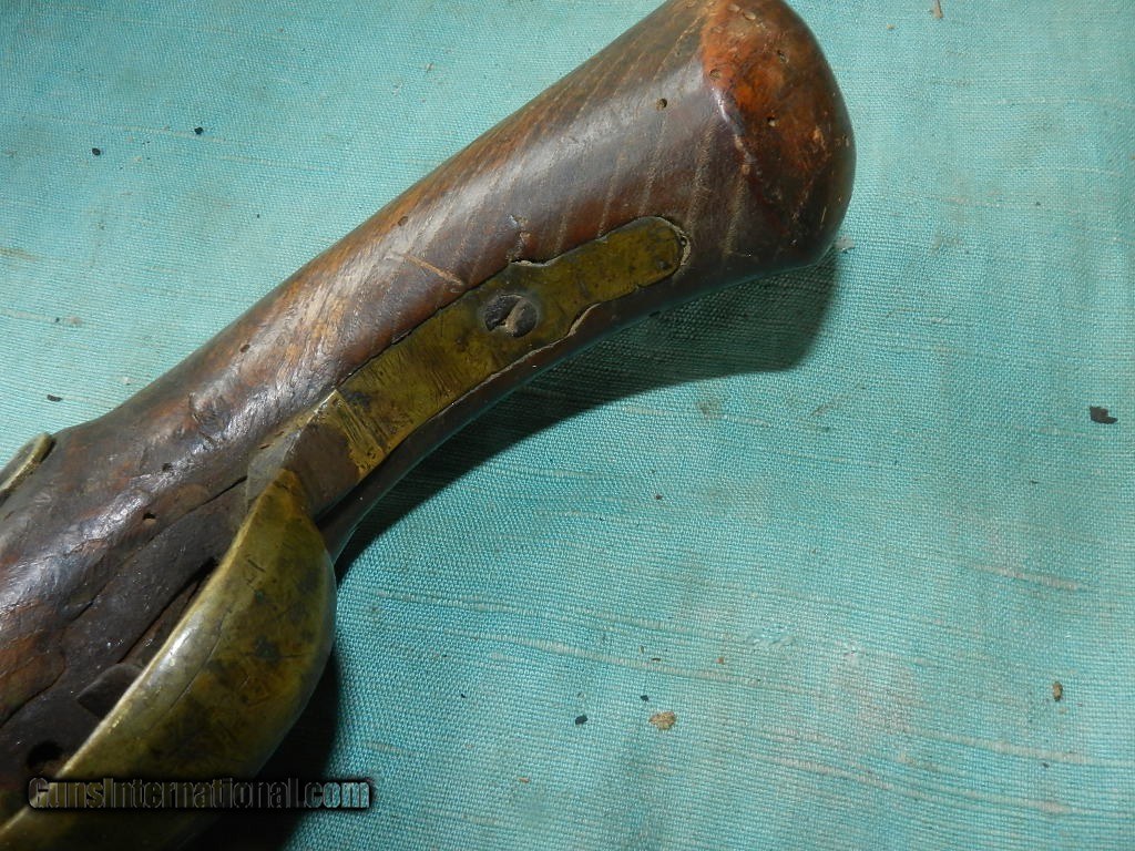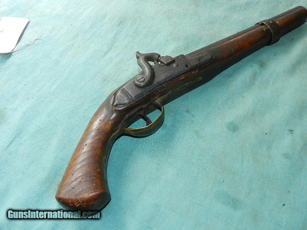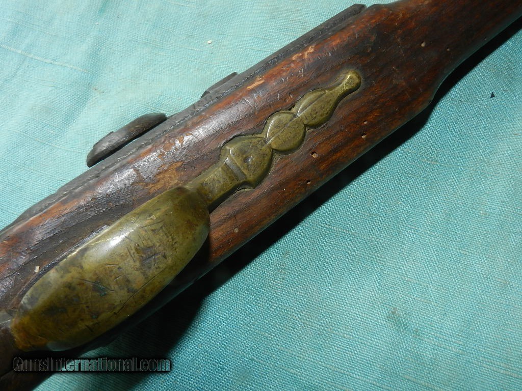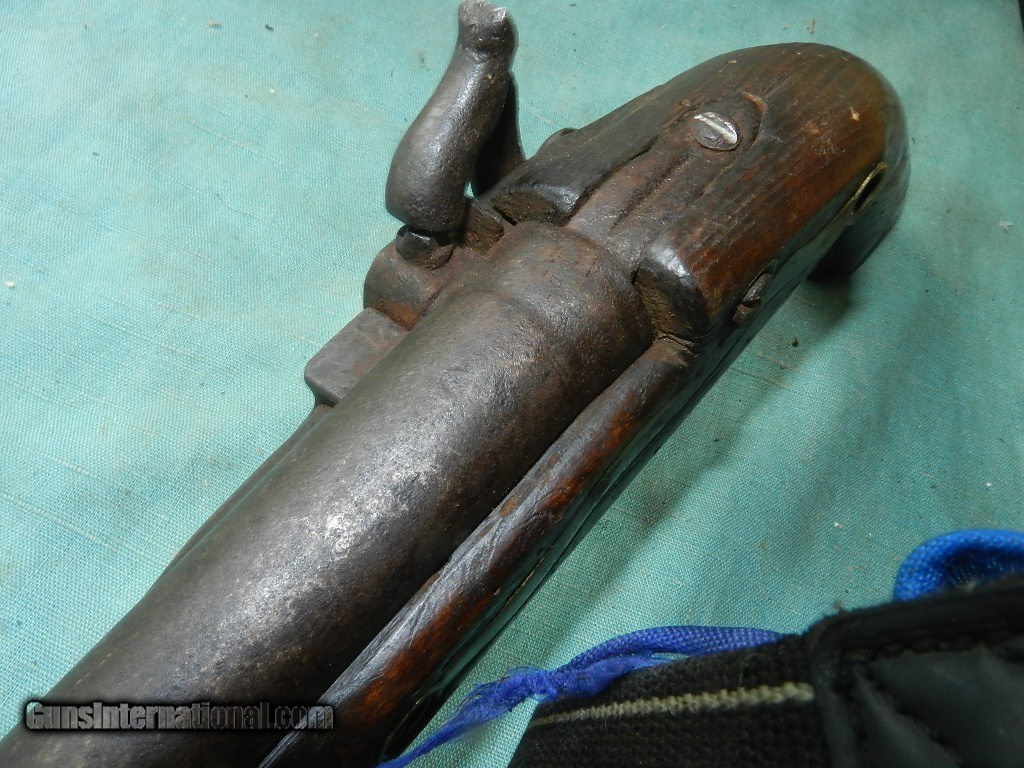 Description: SOLD A Converted colorful .69 cal, 10 3/8'' round barrel with an oxidized bore. The metal surfaces of this pistol are a dark oxidized brown patina showing old pitting overall. The barrel is equipped with a thin brass blade front sight and shows no evident markings. The lockplate was converted from flint and is of rather bulky construction with slight teat and step at the rear, it shows Russian Tula arsenal markings in script along with ''1804'' date. The hammer spur is broken off and the barrel is loose as the forward wedge hardware has broken off. The pistol is equipped with a rudimentary brass triggerguard and sideplate showing dings and old tool marks, toned overall to a deep ocher patina. The hardwood stock rates fair showing scattered thin drying cracks, dings and a number of powder post beetle holes scattered about. There is an old piece of iron cord at the tip of the stock holding together . The lock still holds though the mainspring is weak. The appearance of this arm really suggests it saw use in Central Asia or some other far-flung outskirt of the Russian Empire, possiblt theblock taken from a musket and native made stock, something made by cossacks for personal use. Very rare to get any early Russian made guns..When buying a gun always have it examined by a competent gunsmith before shooting. To buy a gun from me you must get a direct email for me, with details, and shipping cost. We don’t have a web site .I prefer money orders or a check. Item ships when funds come in. I try to keep guns affordable, which means I make less money than most dealers. You won’t get altitude sickness, or nose bleed, with my prices! I consistently have the best selection of older guns If you attempt to buy, you must still contact us for details . Best to email to buy. Sometimes a local person can stop buy and purchase before the gun is removed. Sometimes not home to get calls. Some guns are required shipment to a gun dealer near you for a transfer to you when it arrives. Otherwise many older or black powder guns ship to your door. With the widest selection of older guns at great prices, We don’t have a store, and sell on the internet only. I’m easy to get along with. Thank You SOLD Antique: Yes |