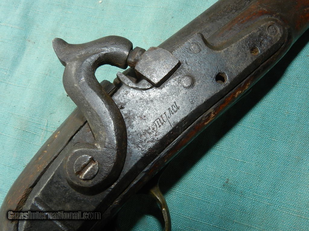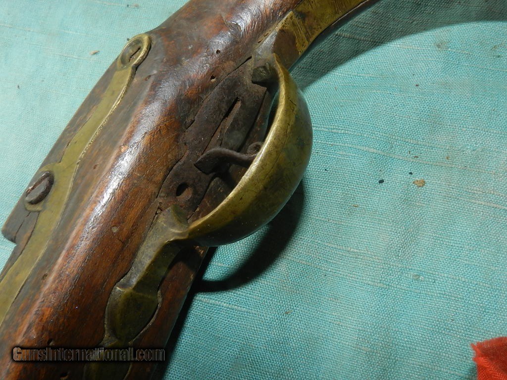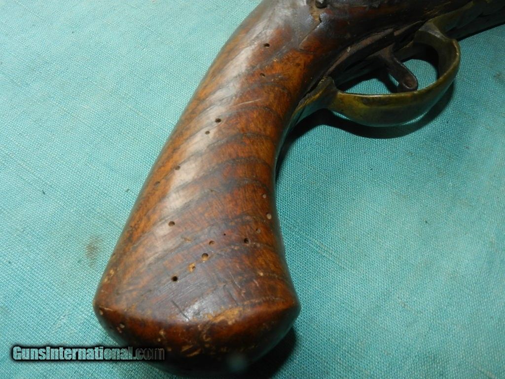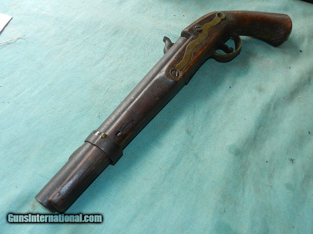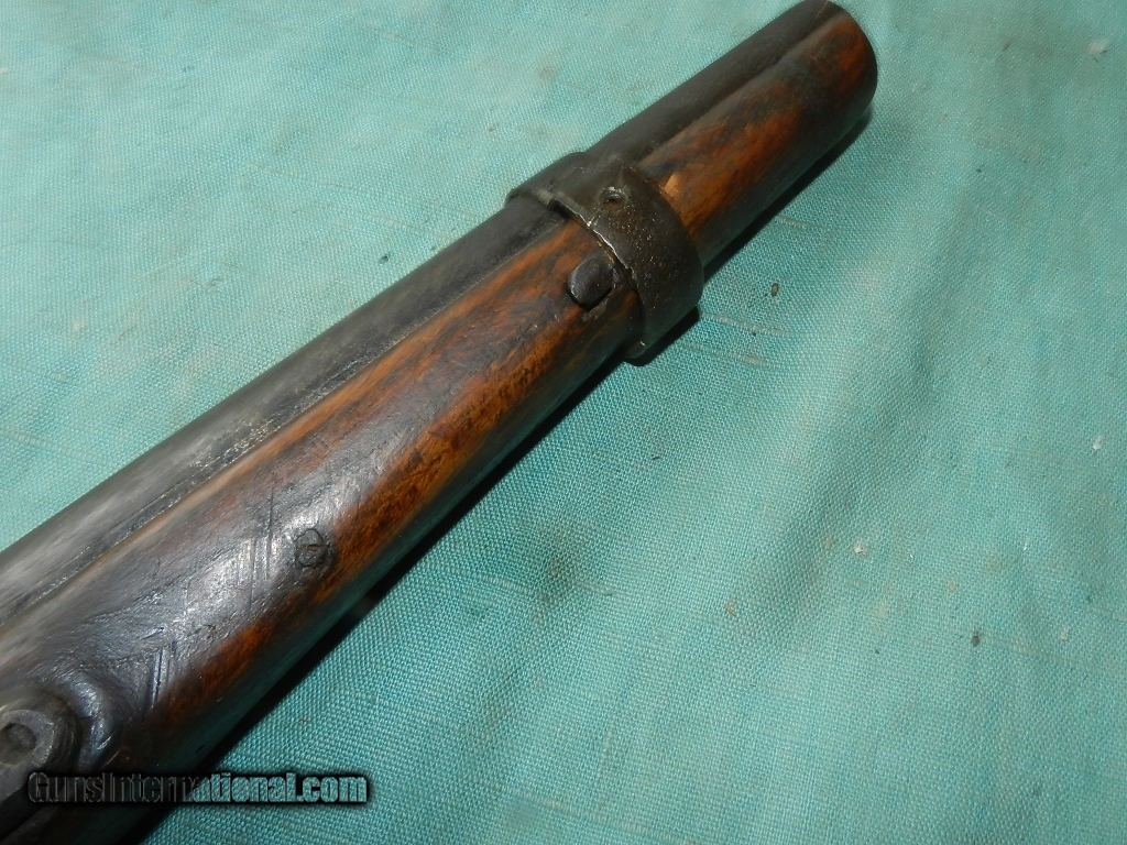 Description: SOLD A Converted colorful .69 cal, 10 3/8'' round barrel with an oxidized bore. The metal surfaces of this pistol are a dark oxidized brown patina showing old pitting overall. The barrel is equipped with a thin brass blade front sight and shows no evident markings. The lockplate was converted from flint and is of rather bulky construction with slight teat and step at the rear, it shows Russian Tula arsenal markings in script along with ''1804'' date. The hammer spur is broken off and the barrel is loose as the forward wedge hardware has broken off. The pistol is equipped with a rudimentary brass triggerguard and sideplate showing dings and old tool marks, toned overall to a deep ocher patina. The hardwood stock rates fair showing scattered thin drying cracks, dings and a number of powder post beetle holes scattered about. There is an old piece of iron cord at the tip of the stock holding together . The lock still holds though the mainspring is weak. The appearance of this arm really suggests it saw use in Central Asia or some other far-flung outskirt of the Russian Empire, possiblt theblock taken from a musket and native made stock, something made by cossacks for personal use. Very rare to get any early Russian made guns..When buying a gun always have it examined by a competent gunsmith before shooting. To buy a gun from me you must get a direct email for me, with details, and shipping cost. We don’t have a web site .I prefer money orders or a check. Item ships when funds come in. I try to keep guns affordable, which means I make less money than most dealers. You won’t get altitude sickness, or nose bleed, with my prices! I consistently have the best selection of older guns If you attempt to buy, you must still contact us for details . Best to email to buy. Sometimes a local person can stop buy and purchase before the gun is removed. Sometimes not home to get calls. Some guns are required shipment to a gun dealer near you for a transfer to you when it arrives. Otherwise many older or black powder guns ship to your door. With the widest selection of older guns at great prices, We don’t have a store, and sell on the internet only. I’m easy to get along with. Thank You SOLD Antique: Yes |
