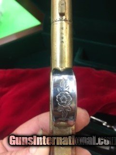 Description: This is a extremly nice set of Thomas Jefferson flint lock pistols cambered in .36 cal. This presentation set includes the hardwood box with Ball mold, white gloves, kutter, papers, screw driver and cover bags. These pistols were made in Italy for the United States Historical Society. These are made of brass, chrome plated and walnut wood grips. these were made some time around 1980 and are very accurate copies of the pair owned by Thomas Jefferson. These are consecutive serial numbered at 962-A & 962-B. If you have any questions or concerns, Please feel free to contact me, I'm just a text or phone call away. SOLD Handgun Caliber: .36 Condition: very nice Metal Condition: very nice Wood Condition: very nice |