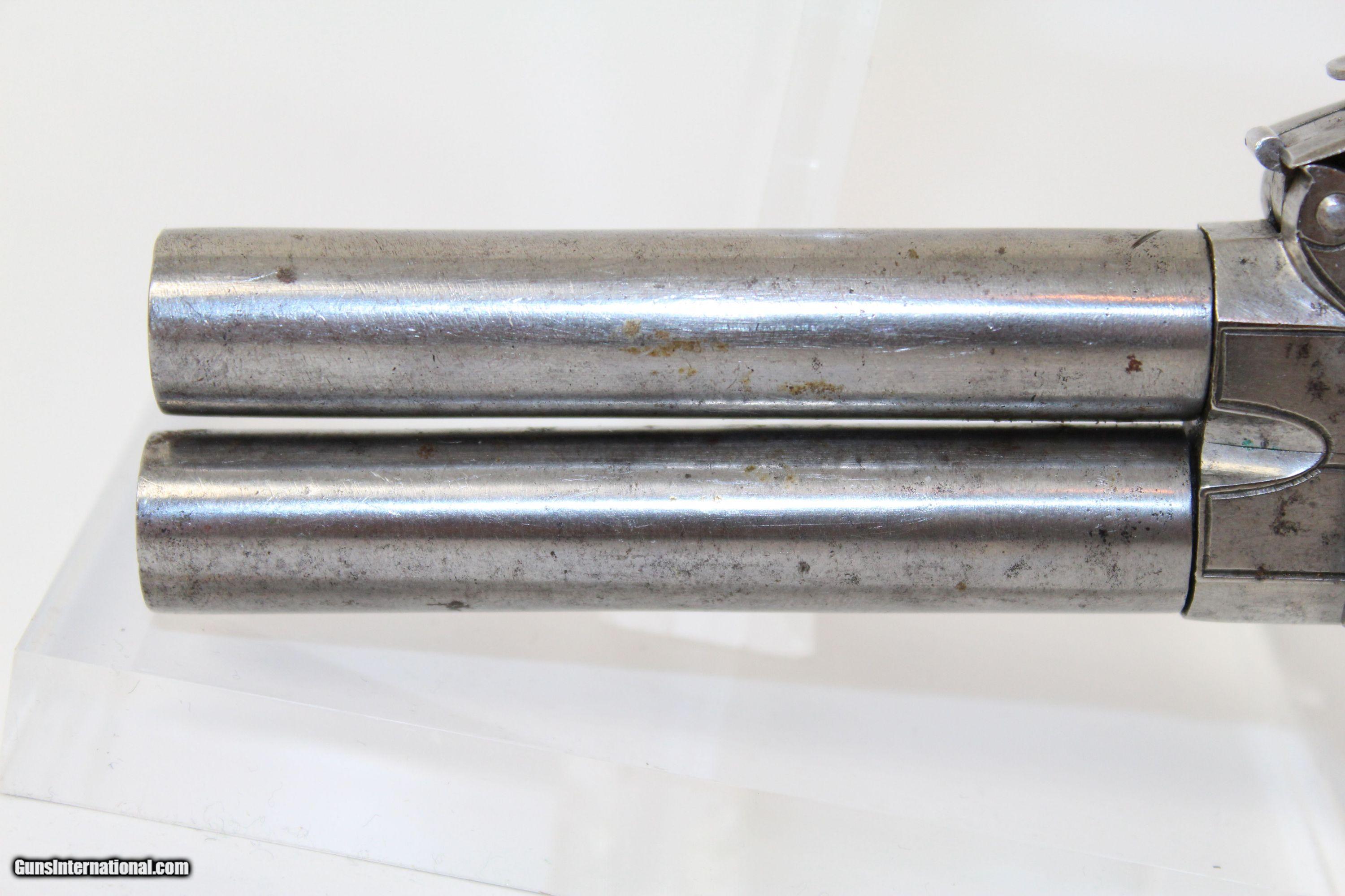 Description: DOUBLE BARREL Antique FLINTLOCK Tap Action Pistol 18th Century British Defensive Pistol with Barrel Selector Here we present an antique British Over/Under Tap Action Flintlock Pistol with Screw-Off Barrels, made circa the late 1700s. This pistol was designed for defensive use. Its major advantage over most pistols of the period was the ability to fire two shots instead of one. Each bore has its own vent through which a spark would travel to ignite the charge within. With a flip of the horseshoe-shaped rotating lever on the left side of the frame, one could select either the top or bottom bore. If neither barrel had been shot yet, the shooter could open both vents to shoot both bores simultaneously. The barrels thread off for tool-less loading. This also gave the lead ball a better gas seal and more velocity than one having to fit from the muzzle. This pistol features floral engravings on both sides of the barrel above the trigger. Each barrel and the frame bears a “CROWN/V” proof mark. The overall condition is fine. The metal surfaces are bright. The engravings are clear. The walnut grip is nicely checkered. The bores are both clean. The action in this pistol is excellent. Here is a very neat British flintlock pistol! Own the original! This is a legitimate antique and not a reproduction. Barrel is 3 inches. Caliber: .40 Overall condition as seen in photos. Very Fast. Very Safe. FREE SHIPPING WORLDWIDE. Delivered directly to your door by express mail! Guaranteed AUTHENTIC & Includes CERTIFICATE OF AUTHENTICITY. ancestryguns $1350 #6077 SOLD Antique: Yes |