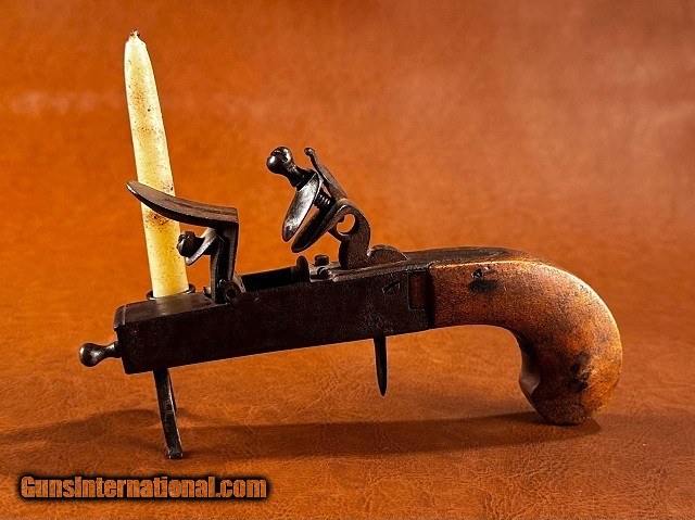 Early American Iron Flintlock Tinder Lighter Fire Starter Pistol w/ Candlestick Colonial Tabletop Tavern Tool *RARE* 1780-1800