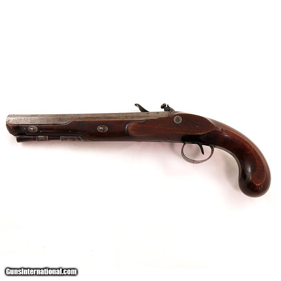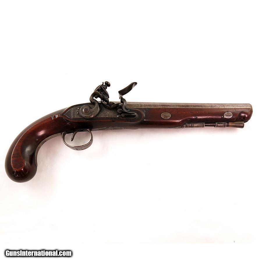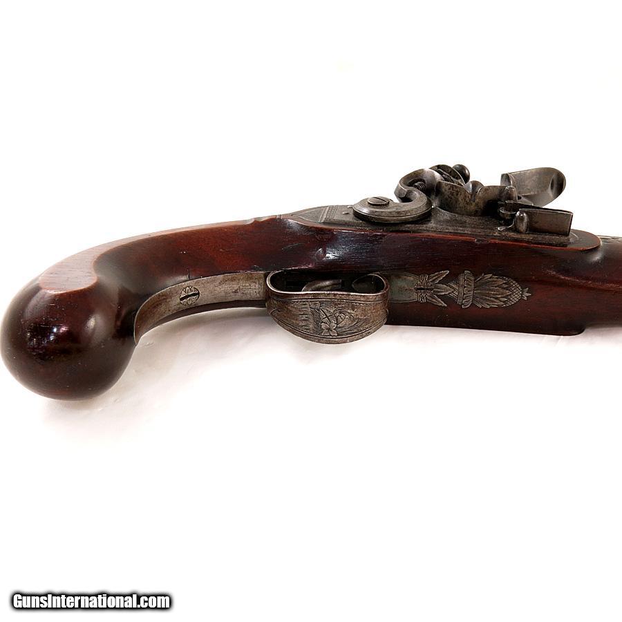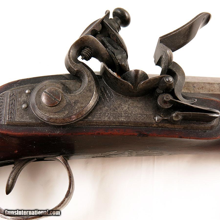 Description: English Officer's Flintlock Pistol by Richardson Manchester. Very nice condition. Gold touch hole. Nice wood with no cracks or breaks. It measures 14 3/4" overall with 9" barrel. SOLD Antique: Yes |