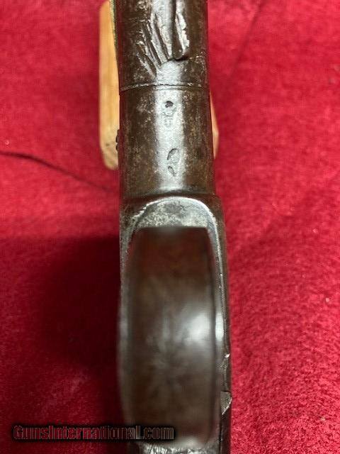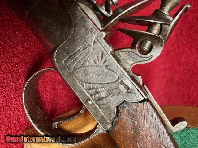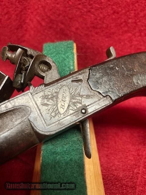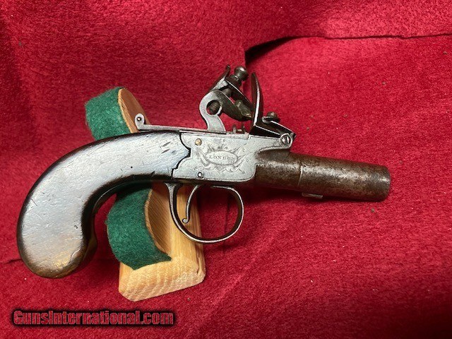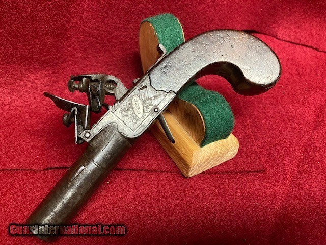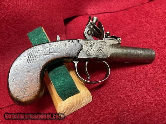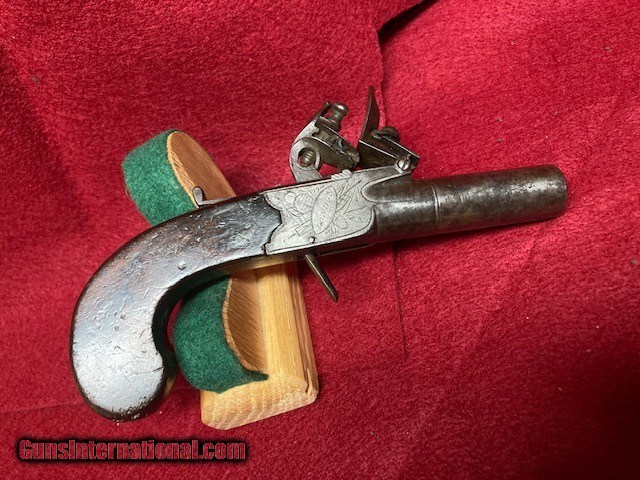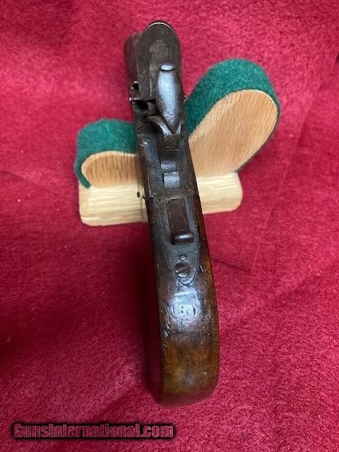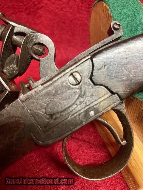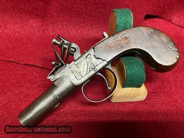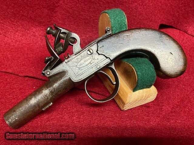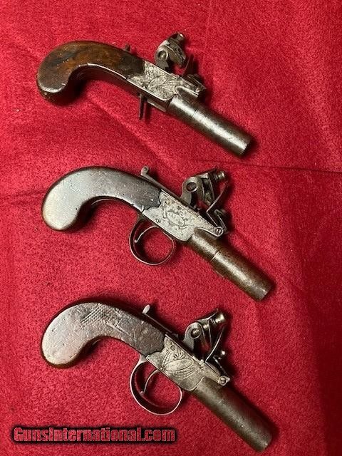 Description: Three English FlintlockPocket(Muff) Pistols. London Marked. 3 different Makers. 1) Fisher. 2) Brasher 3) Bate- drop trigger. All have proof stamps under barrels. I believe they are .45 caliber. Likely Mid 1800's era. All 3 seem to operate as they should. Sell individual $395 each. ALL 3 (set) $1050. Shipping $20.00. SOLD Antique: Yes |