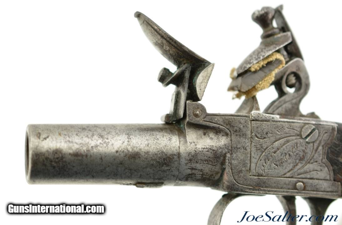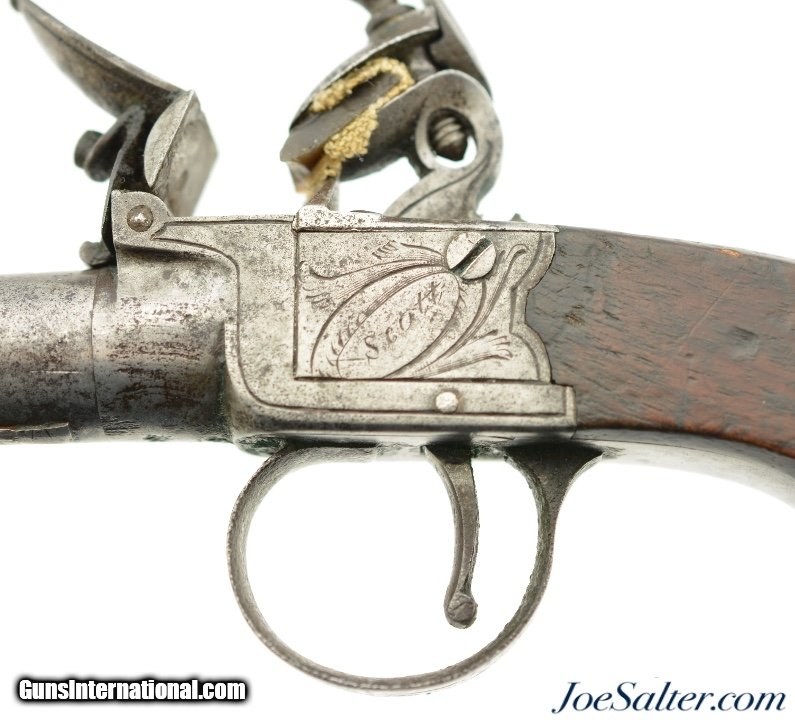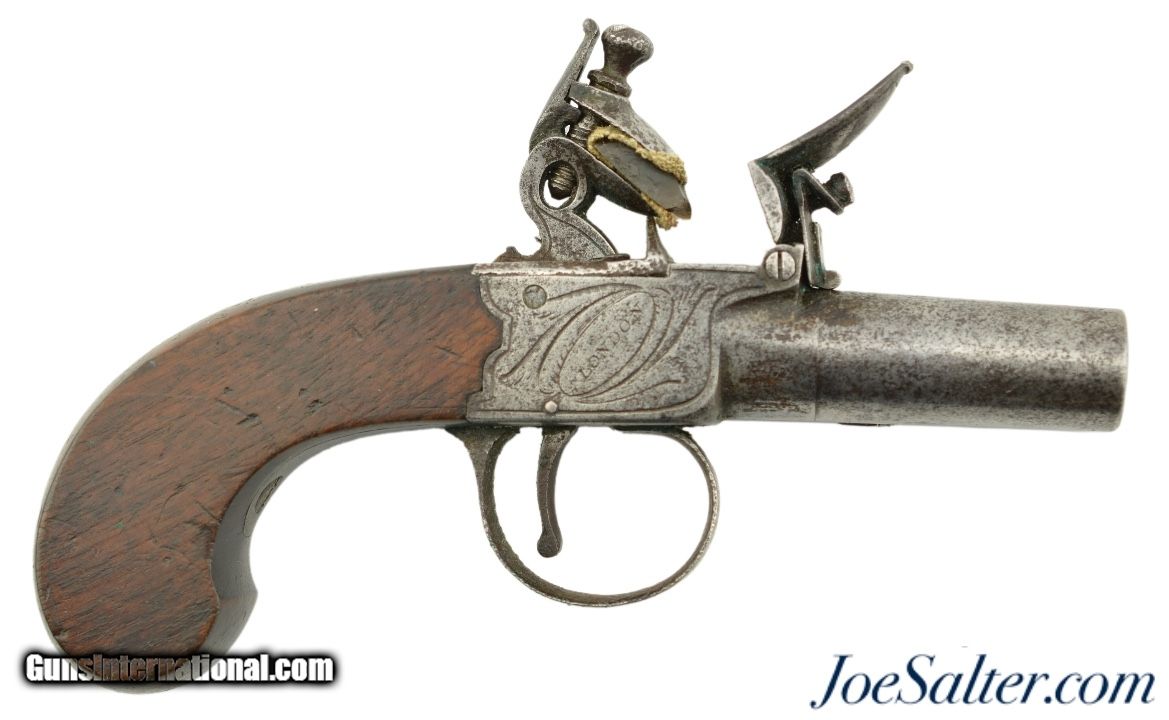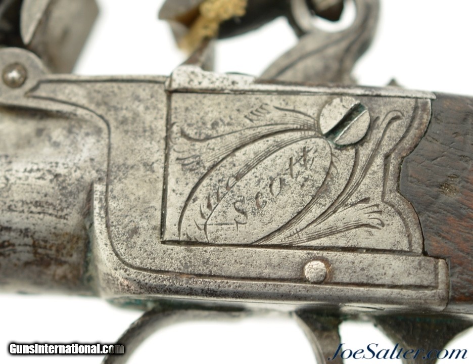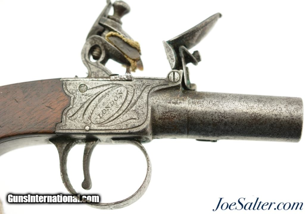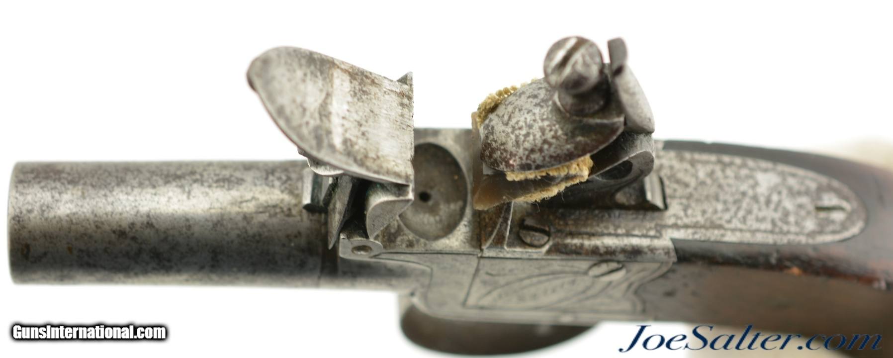 Description: This is a .45 Caliber black powder muzzle-loading, flintlock turn-off barrel "Muff" or pocket pistol with a 1 ¾ inch turn off barrel that is firmly in place and currently is frozen in position with a very fine dark bore. Manufactured in England it is marked "Scott" on the left frame and "London" on the right along with simple engraving. Both the barrel and frame show English proof marks. The metal surfaces have a dark gray patina with small areas of surface roughness. The action functions properly with hammer holding at half and full cock, strong springs, releasing with a crisp trigger pull. A great example of the once very popular self protection carry gun of its day. Antique SOLD Antique: Yes |