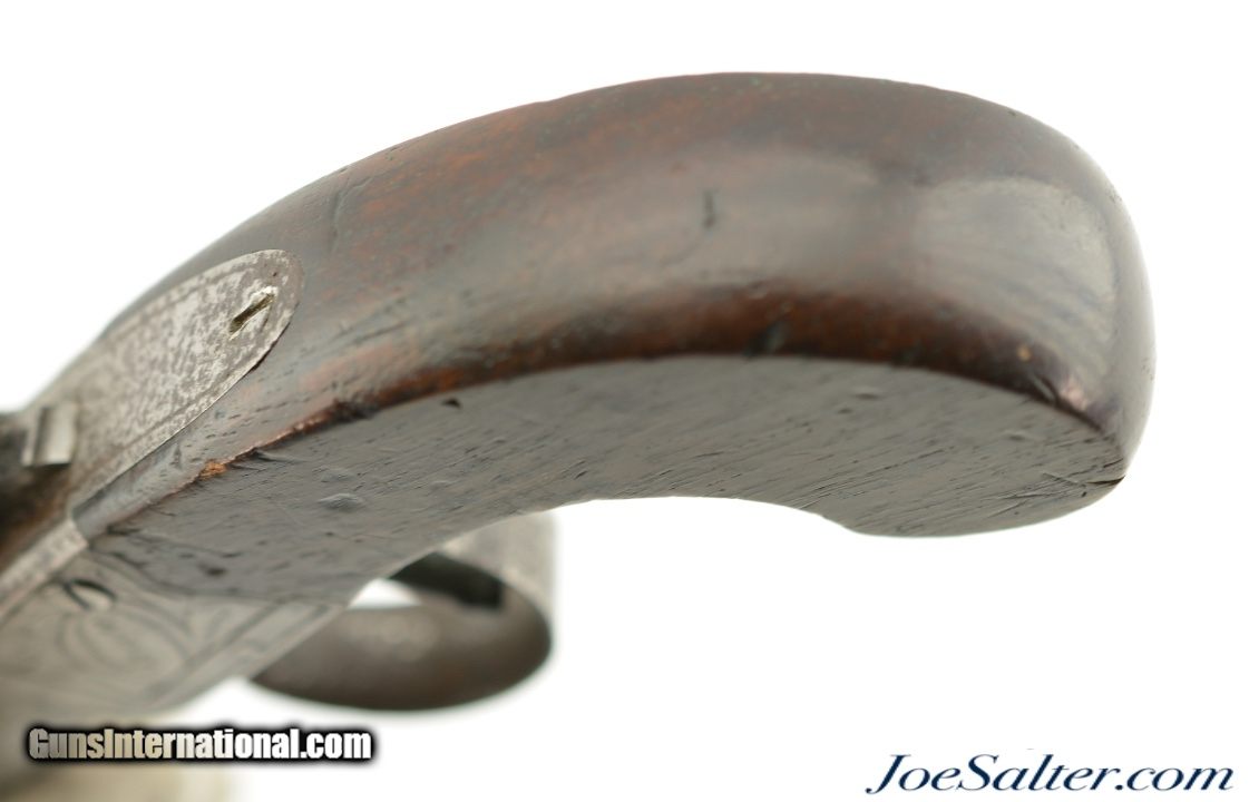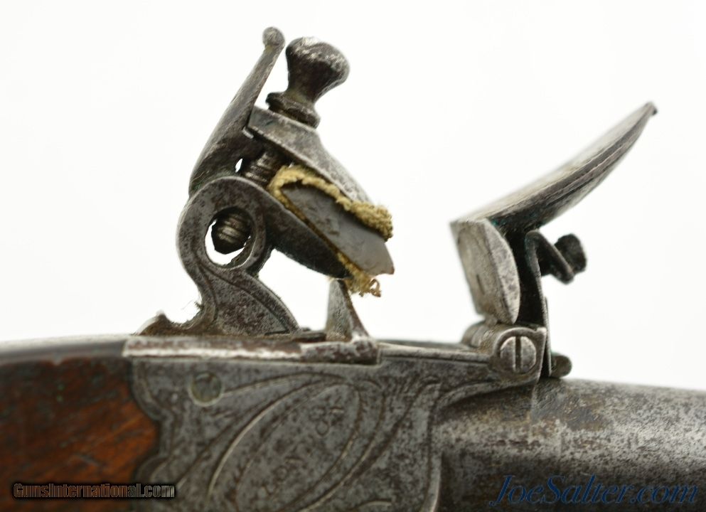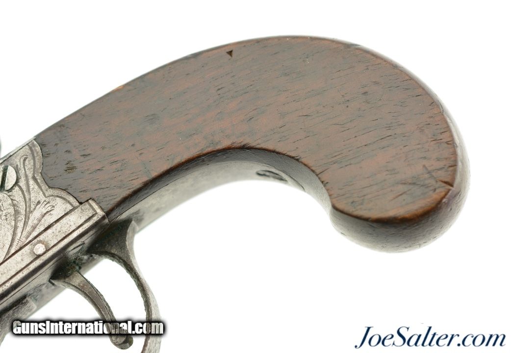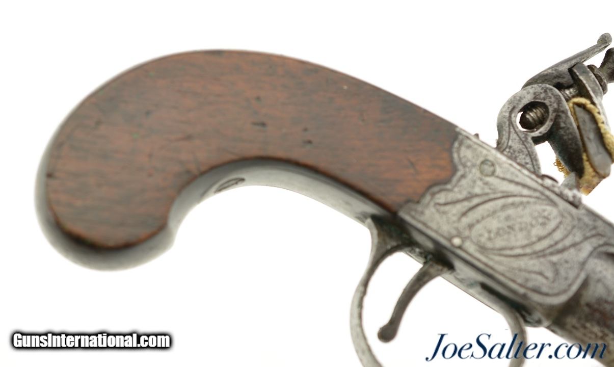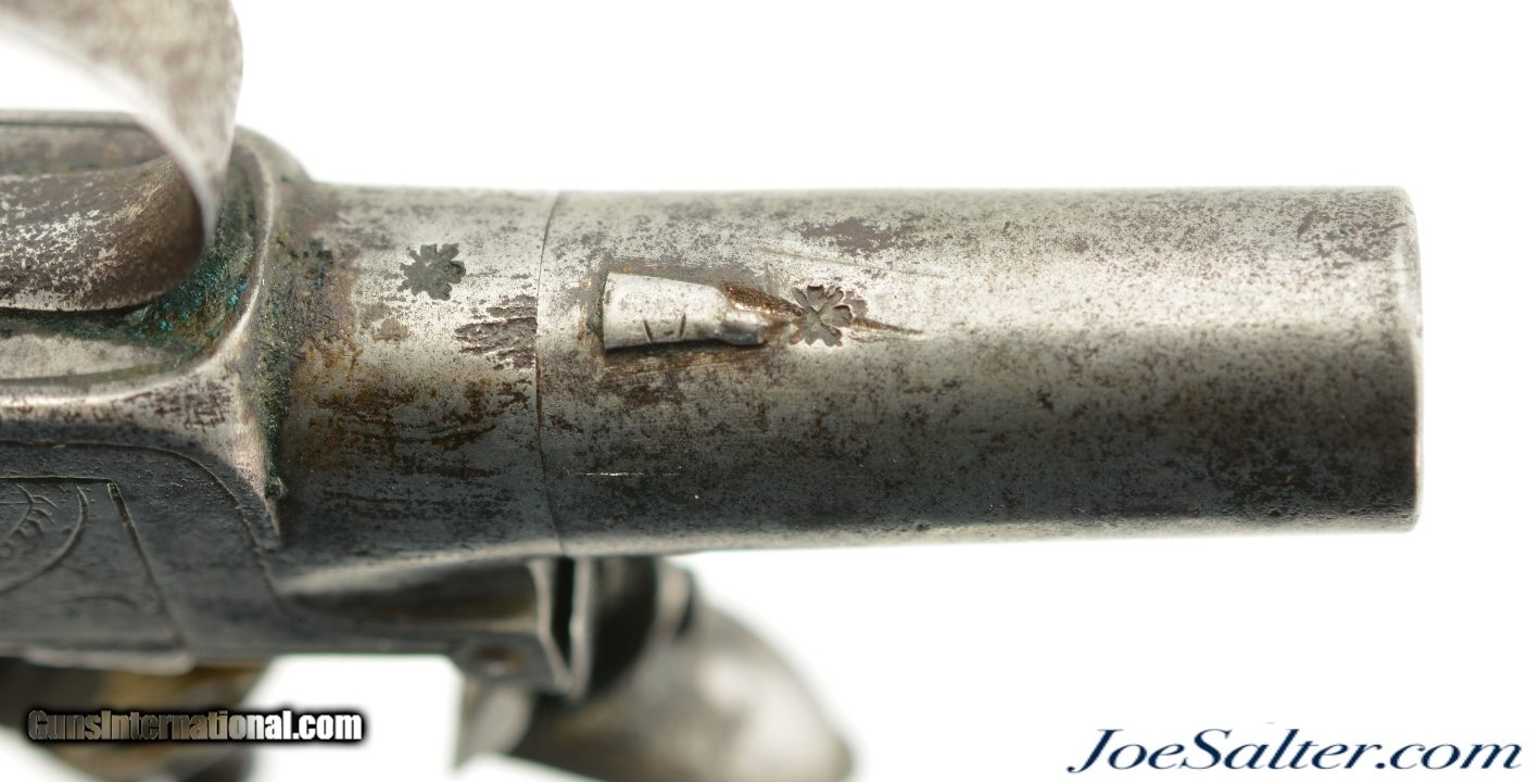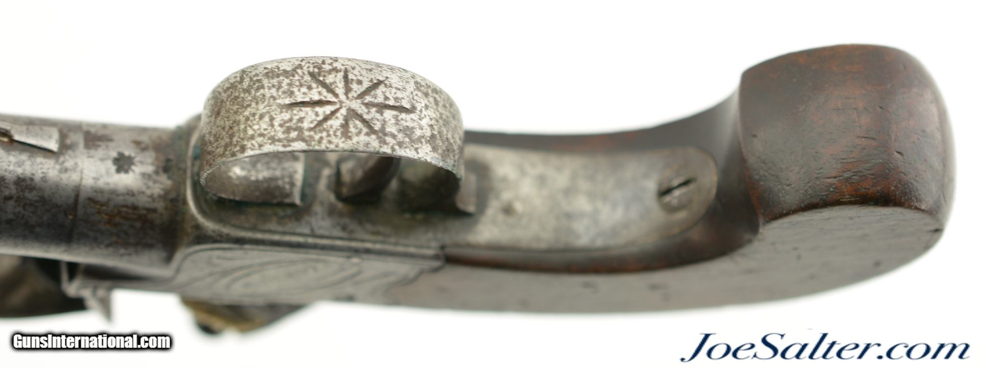 Description: This is a .45 Caliber black powder muzzle-loading, flintlock turn-off barrel "Muff" or pocket pistol with a 1 ¾ inch turn off barrel that is firmly in place and currently is frozen in position with a very fine dark bore. Manufactured in England it is marked "Scott" on the left frame and "London" on the right along with simple engraving. Both the barrel and frame show English proof marks. The metal surfaces have a dark gray patina with small areas of surface roughness. The action functions properly with hammer holding at half and full cock, strong springs, releasing with a crisp trigger pull. A great example of the once very popular self protection carry gun of its day. Antique SOLD Antique: Yes |