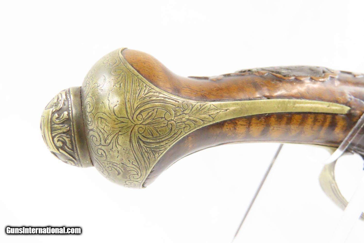 Description: ENGRAVED 1700s EUROPEAN Antique FLINTLOCK .61 Caliber Pistol Italian With Unique Markings and a Beautifully Carved Stock! Here we present an antique Flintlock Pistol, made in the 18th Century, almost certainly the Italian Penninsula. This large bored pistol would have been intended for use as a military or defensive firearm. It is a medium sized flintlock, being able to fit into a large pocket or more likely in a belt. Its barrel is 10 inches in length. This would have likely been purchased privately by an officer and carried into battle in the event he met the enemy. Here is a fantastic, scarce and historical European Pistol from one of the most pivotal times in European history! Almost every metal surface is engraved with floral designs. The stock is beautifully carved to accent the metal hardware. The trigger guard tang features some period markings. The overall condition is very good. The action is as strong as ever. The bore is good. The stock is carved and the finish on the wood retains a bit of shine. There is a thin crack in front of the lock that travels upward towards the barrel, even still, the stock is solid and stable. Own the original! This is a legitimate antique and not a reproduction. Barrel is 10 inches. Caliber: .61 Overall condition as seen in photos. Very Fast. Very Safe. FREE SHIPPING WORLDWIDE. Delivered directly to your door by express mail! Guaranteed AUTHENTIC & Includes CERTIFICATE OF AUTHENTICITY. ancestryguns $4350 #20733 SOLD Antique: Yes |
