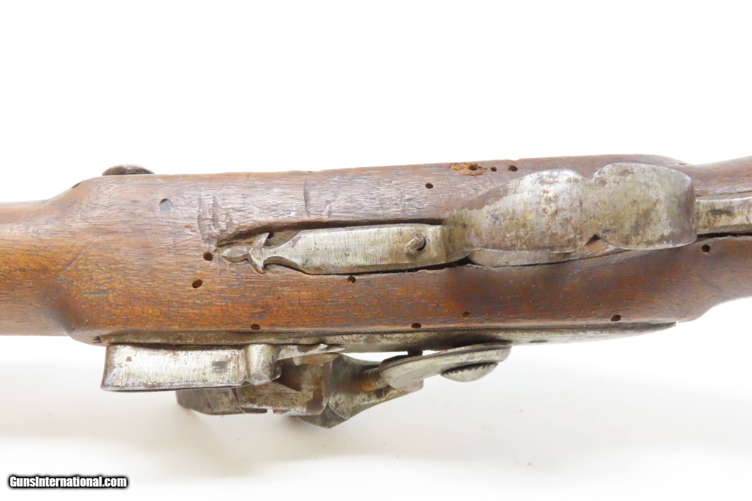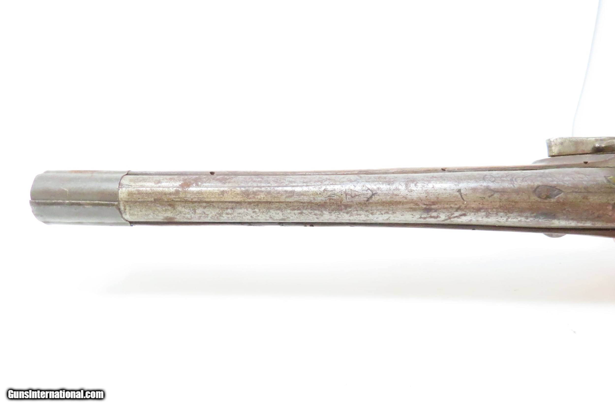 Description: Engraved EUROPEAN Antique .60 Caliber Flintlock CAVALRY PIRATE HORSE Pistol Circa Late 1700s to Early 1800s Here we present an antique likely European Flintlock Heavy Cavalry Holster Pistol, made circa the late 1700s to early 1800s. Like the cavalry pistols from nations such as Britain and France, this was a large, single shot pistol with a brass pommel that could be used as a club when the single shot was expended. The overall condition is rough. The action has spring tension and a half- and full-cock but the trigger does not release the cock. The bore is smooth and oxidized. The stock has some worming throughout and a chip at the pommel. A good one for display! Own the original! This is a legitimate antique and not a reproduction. Barrel is 11 inches. Caliber: .60 Flintlock Overall condition as seen in photos. Very Fast. Very Safe. FREE SHIPPING WORLDWIDE. Delivered directly to your door by express mail! Guaranteed AUTHENTIC & Includes CERTIFICATE OF AUTHENTICITY. ancestryguns $1385 #215086 SOLD Antique: Yes |