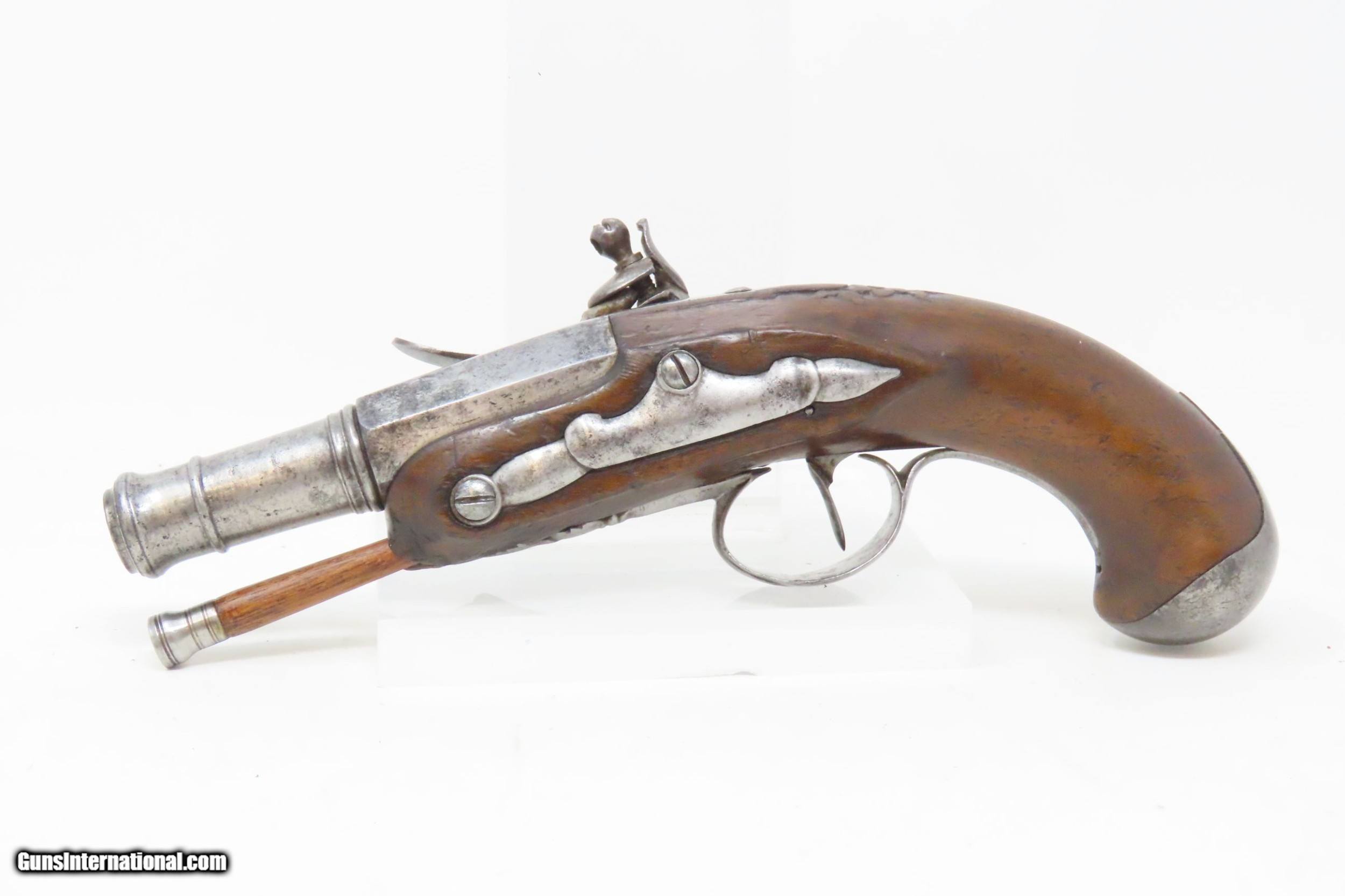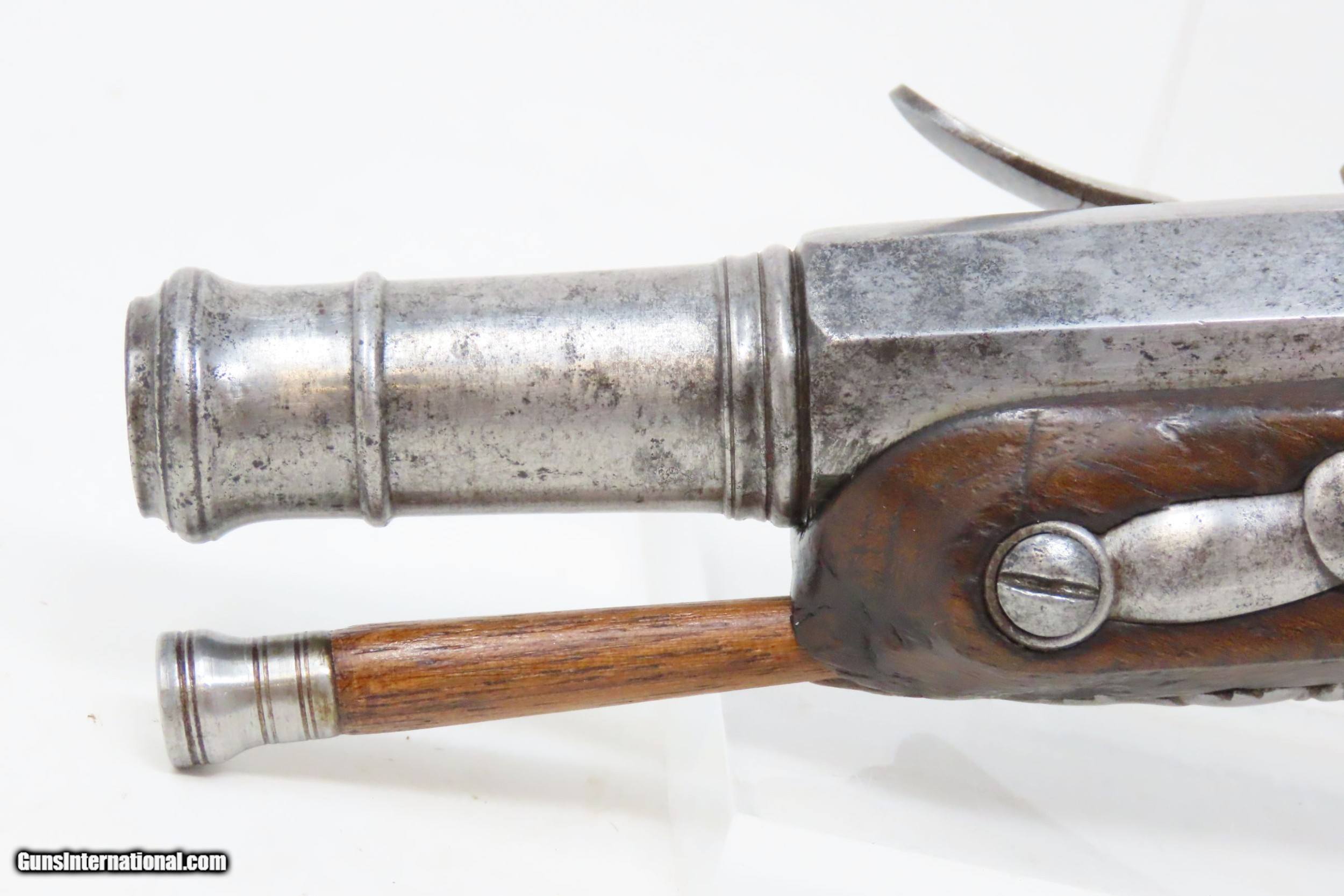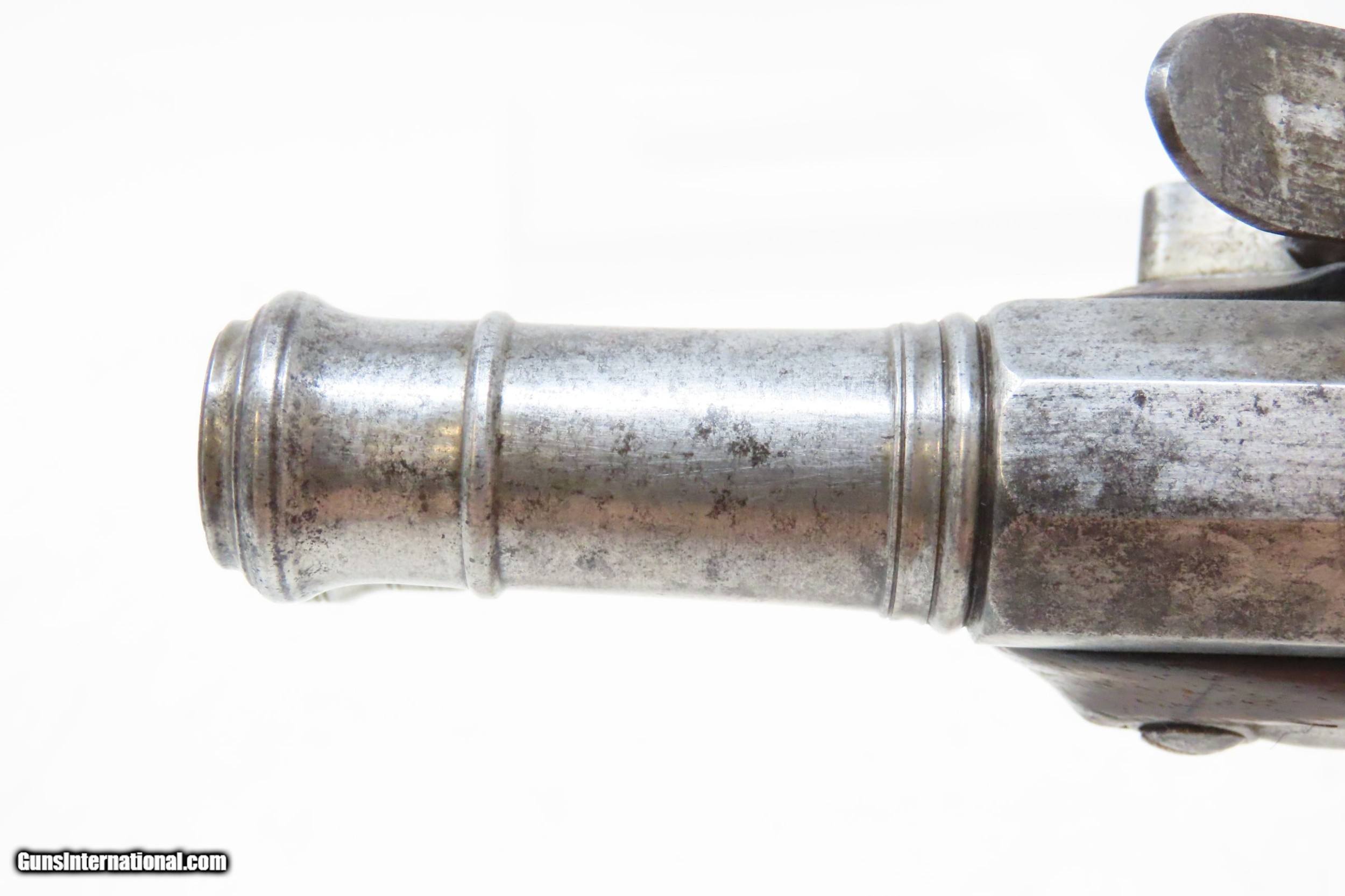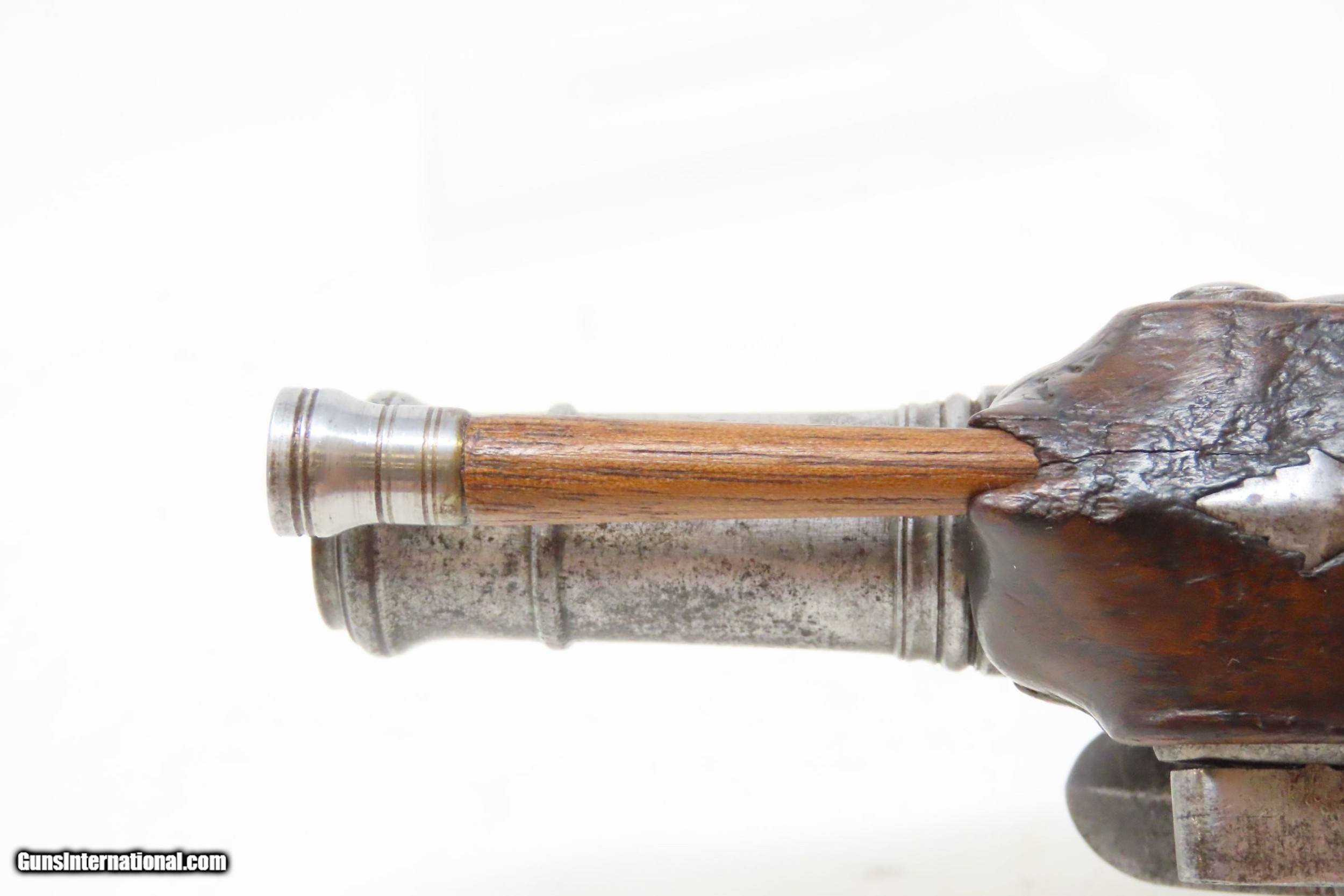 Description: EUROPEAN Antique .50 Caliber FLINTLOCK Pocket/Holster SELF DEFENSE Pistol Cannon Barrel with Iron Pommel Cap Here we present an antique European Flintlock Pocket/Holster Pistol, made circa the early 1800s. This pistol has a fairly small frame and a short, large-bore barrel. It would have been concealable in a jacket or attached to one’s belt and used for self-defense on the busy streets of London or Paris. The bore is .50 caliber. The overall condition is very good. Strong action. Smooth, patinated bore. The stock is solid. There is a short, repaired split just forward of the lock. The ramrod is a replacement and is not removable. Own the original! This is a legitimate antique and not a reproduction. Barrel is 3-5/8 inches. Caliber: .50 Flintlock Overall condition as seen in photos. Very Fast. Very Safe. FREE SHIPPING WORLDWIDE. Delivered directly to your door by express mail! Guaranteed AUTHENTIC & Includes CERTIFICATE OF AUTHENTICITY. ancestryguns $1200 #220381 SOLD Antique: Yes |