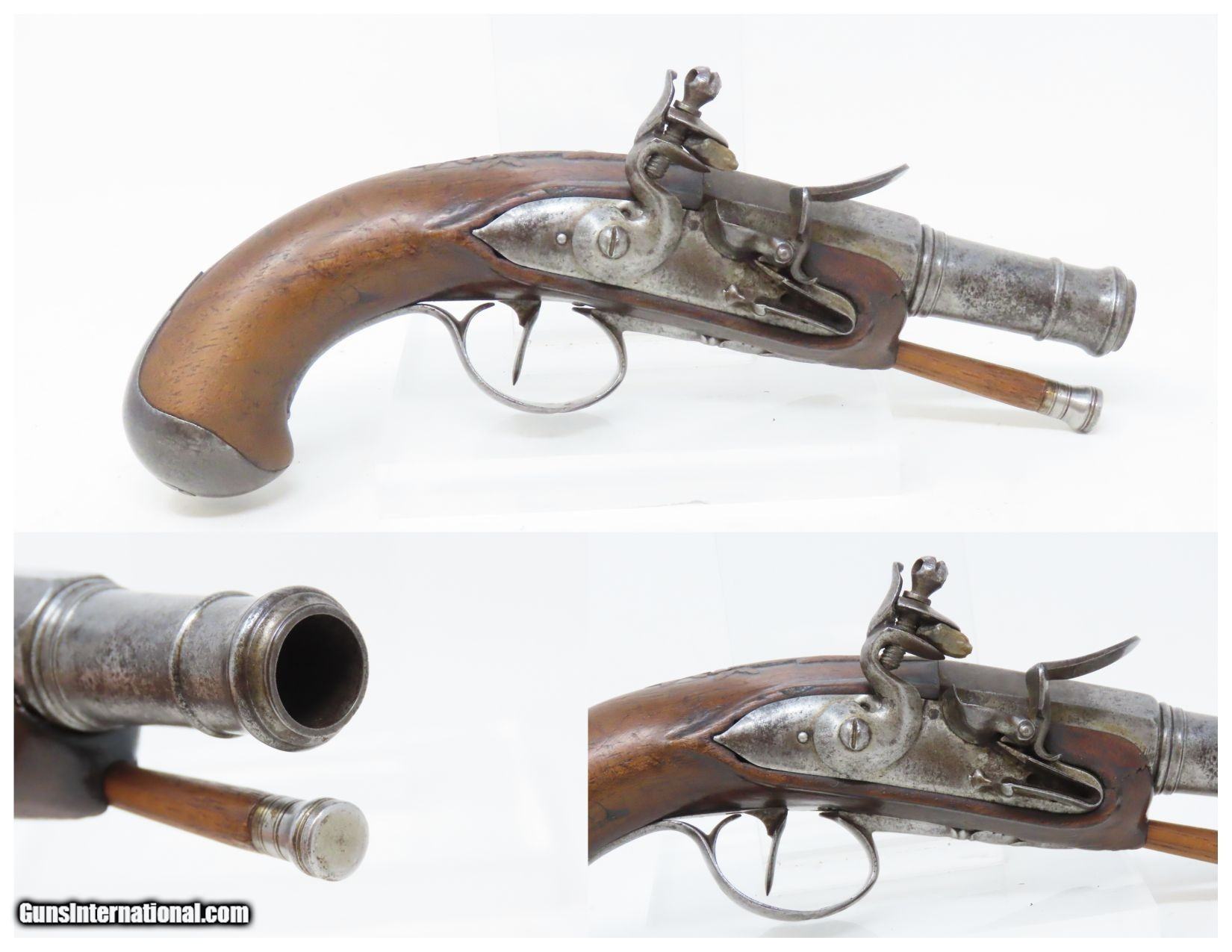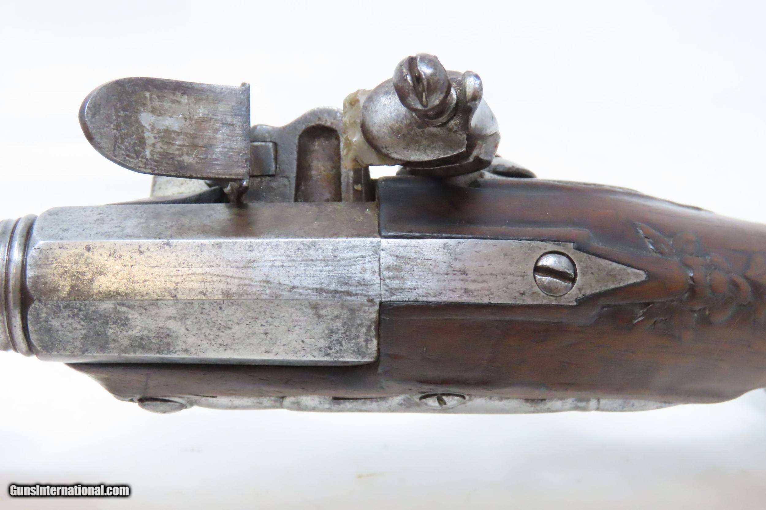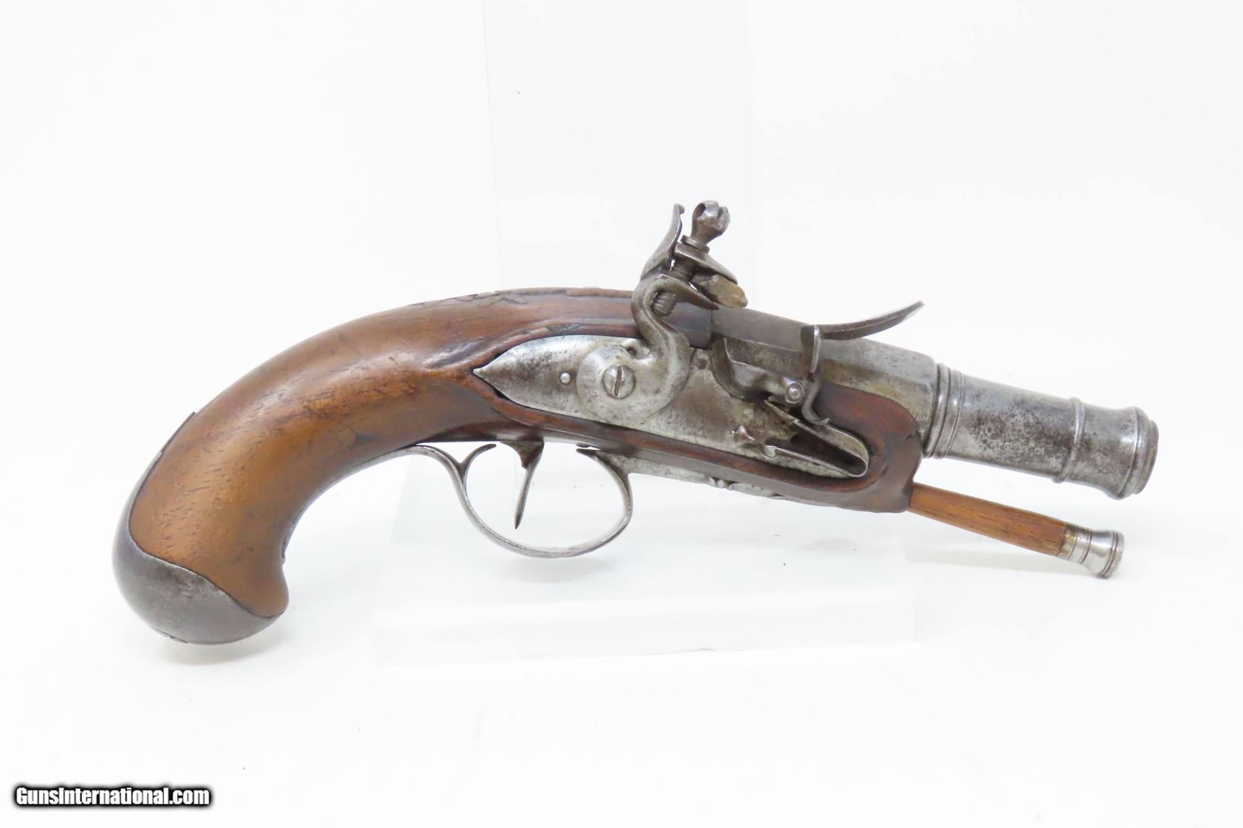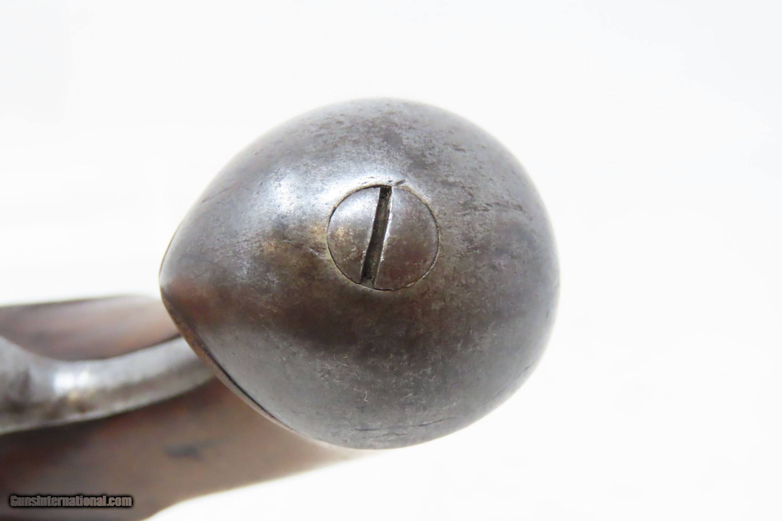Description: EUROPEAN Antique .50 Caliber FLINTLOCK Pocket/Holster SELF DEFENSE Pistol Cannon Barrel with Iron Pommel Cap Here we present an antique European Flintlock Pocket/Holster Pistol, made circa the early 1800s. This pistol has a fairly small frame and a short, large-bore barrel. It would have been concealable in a jacket or attached to one’s belt and used for self-defense on the busy streets of London or Paris. The bore is .50 caliber. The overall condition is very good. Strong action. Smooth, patinated bore. The stock is solid. There is a short, repaired split just forward of the lock. The ramrod is a replacement and is not removable. Own the original! This is a legitimate antique and not a reproduction. Barrel is 3-5/8 inches. Caliber: .50 Flintlock Overall condition as seen in photos. Very Fast. Very Safe. FREE SHIPPING WORLDWIDE. Delivered directly to your door by express mail! Guaranteed AUTHENTIC & Includes CERTIFICATE OF AUTHENTICITY. ancestryguns $1200 #220381 SOLD Antique: Yes |
