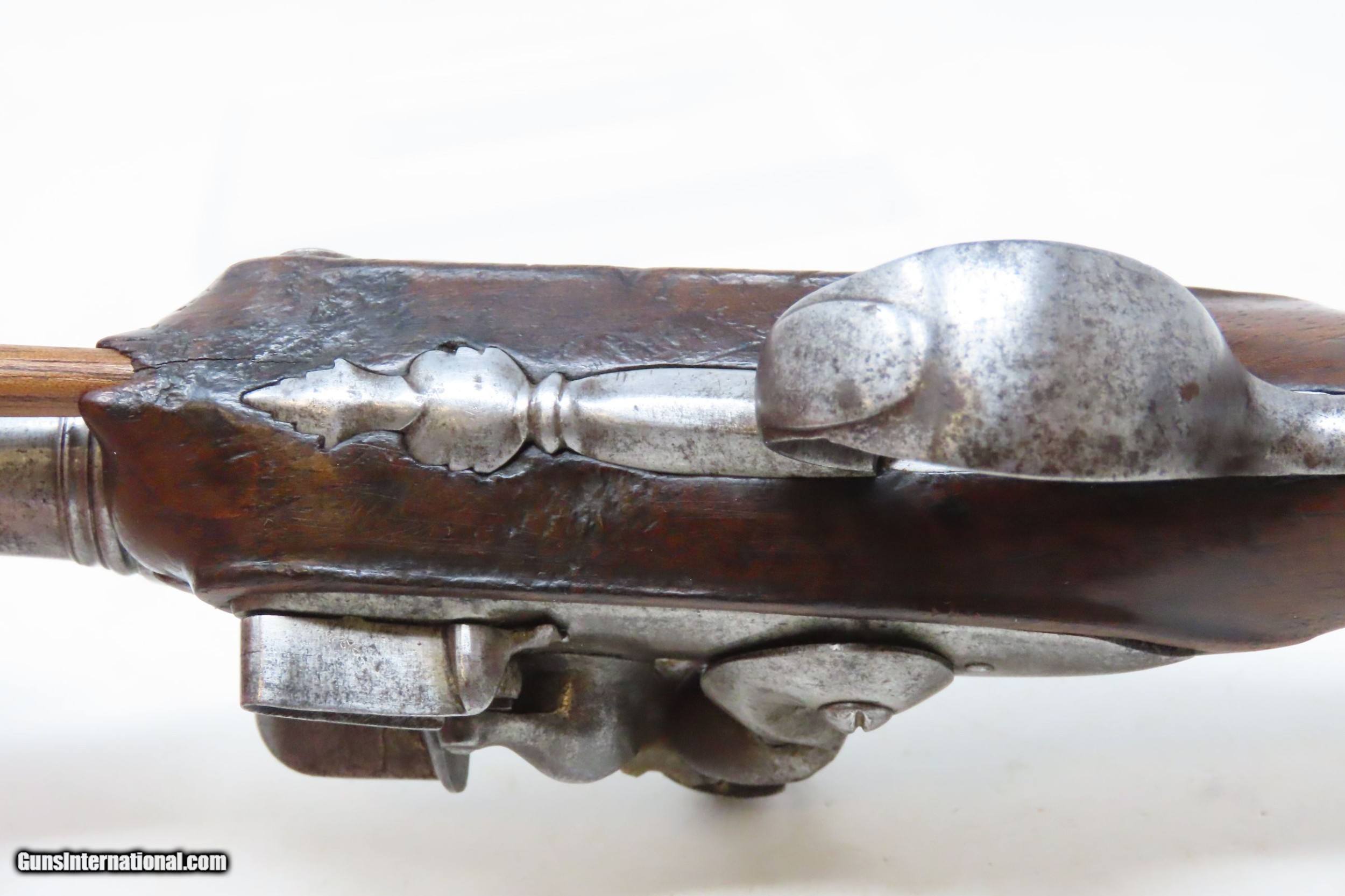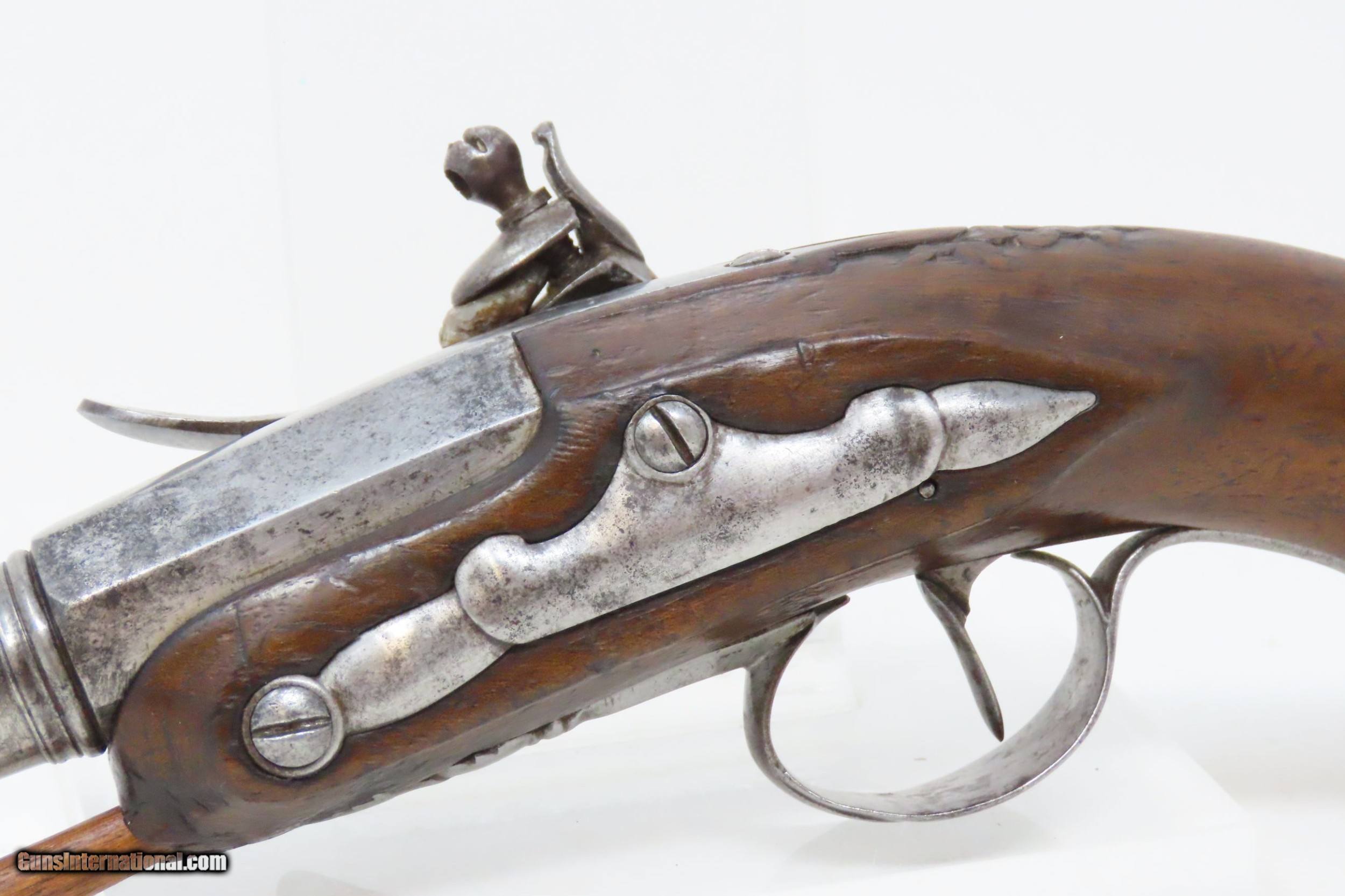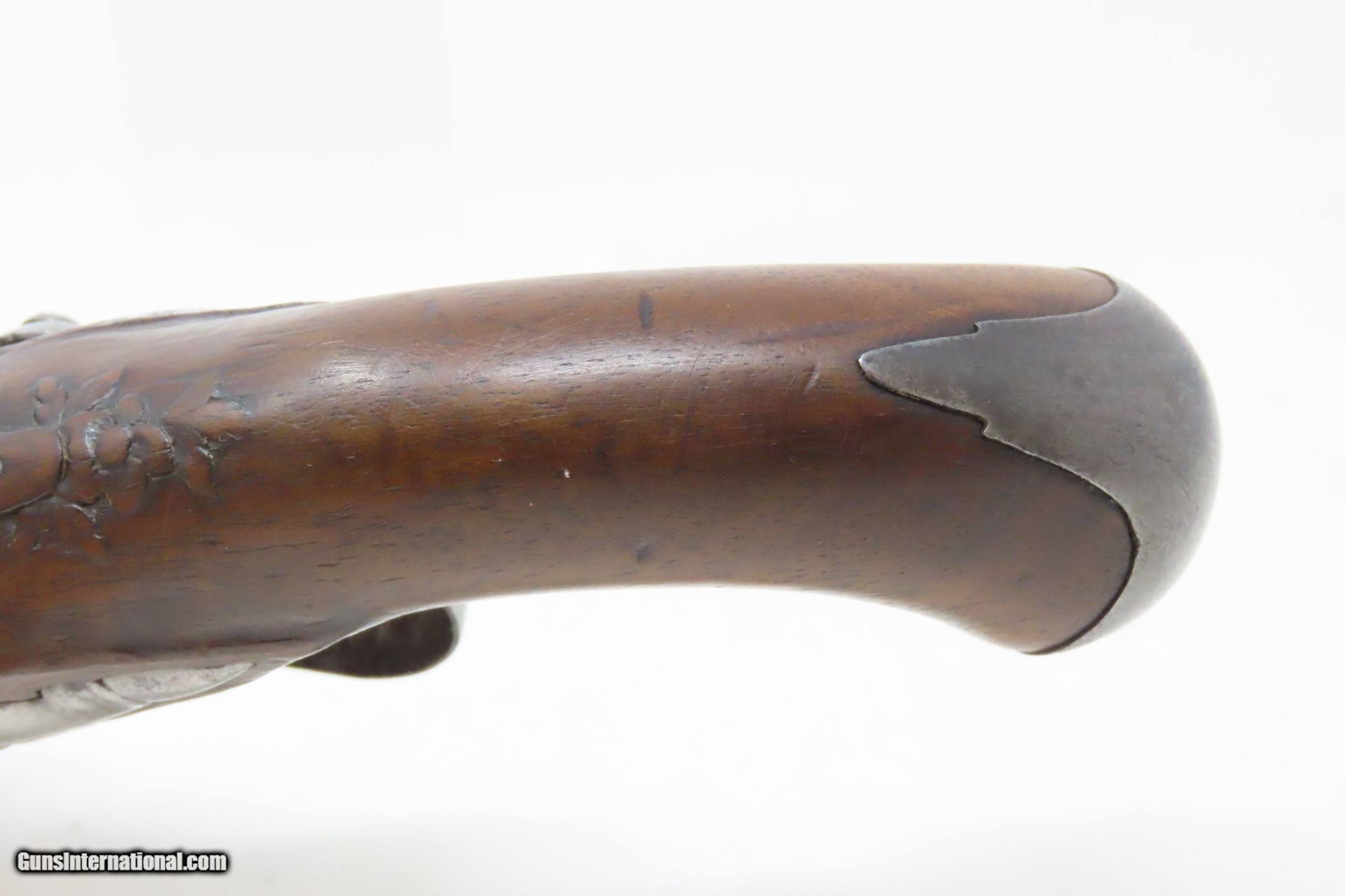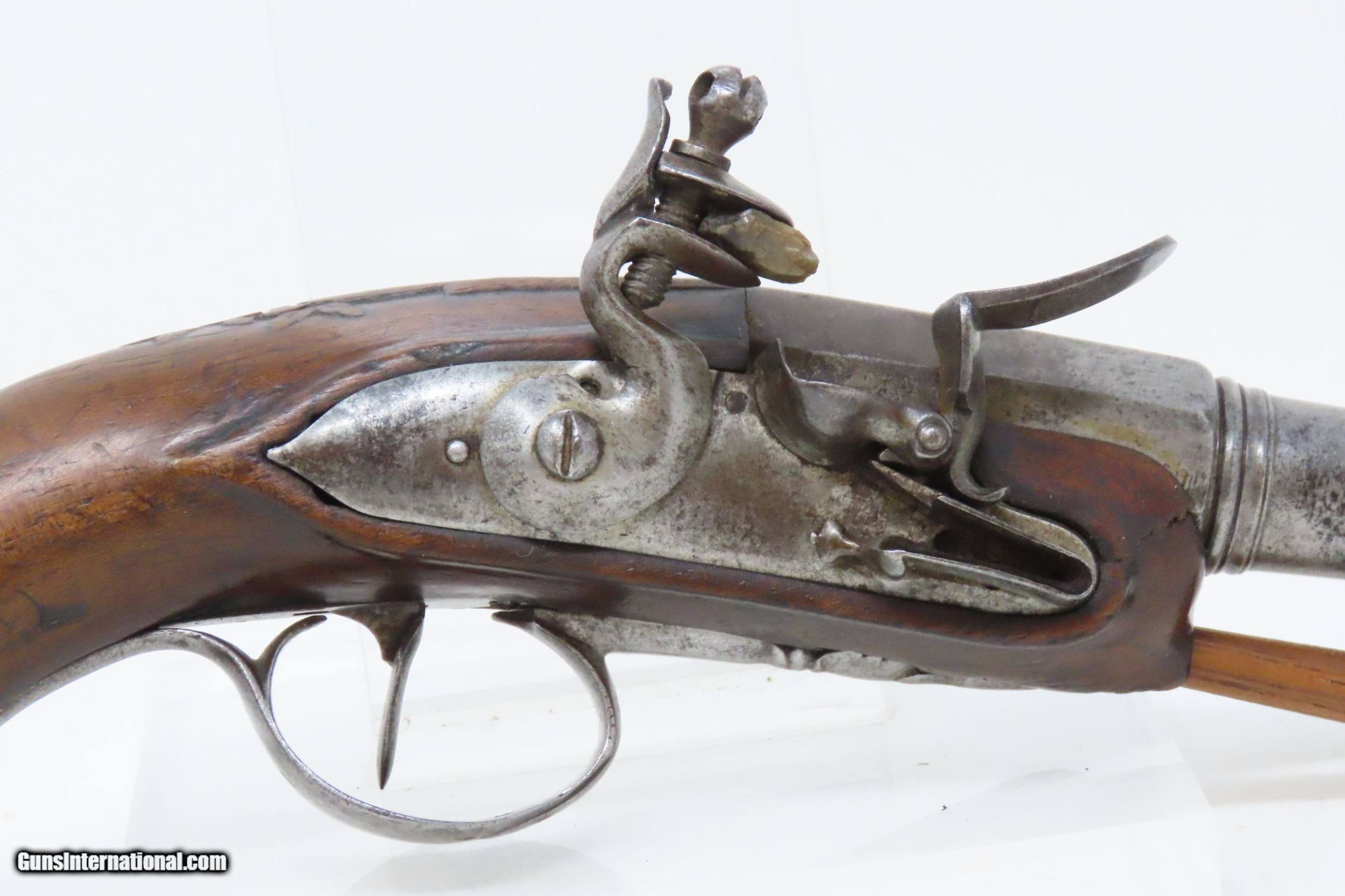 Description: EUROPEAN Antique .50 Caliber FLINTLOCK Pocket/Holster SELF DEFENSE Pistol Cannon Barrel with Iron Pommel Cap Here we present an antique European Flintlock Pocket/Holster Pistol, made circa the early 1800s. This pistol has a fairly small frame and a short, large-bore barrel. It would have been concealable in a jacket or attached to one’s belt and used for self-defense on the busy streets of London or Paris. The bore is .50 caliber. The overall condition is very good. Strong action. Smooth, patinated bore. The stock is solid. There is a short, repaired split just forward of the lock. The ramrod is a replacement and is not removable. Own the original! This is a legitimate antique and not a reproduction. Barrel is 3-5/8 inches. Caliber: .50 Flintlock Overall condition as seen in photos. Very Fast. Very Safe. FREE SHIPPING WORLDWIDE. Delivered directly to your door by express mail! Guaranteed AUTHENTIC & Includes CERTIFICATE OF AUTHENTICITY. ancestryguns $1200 #220381 SOLD Antique: Yes |