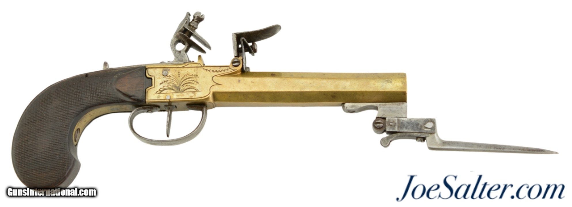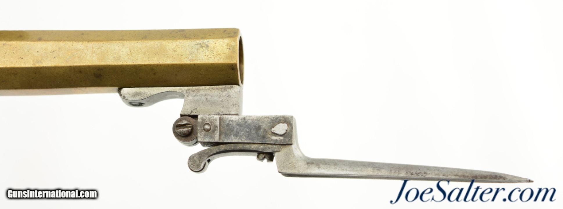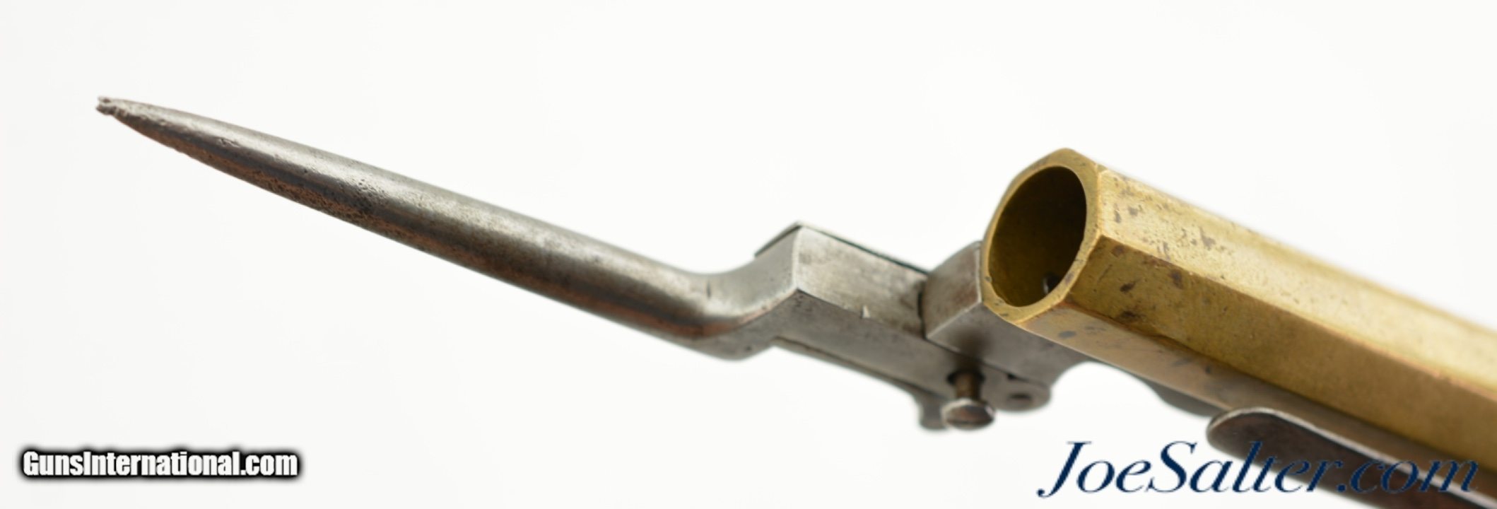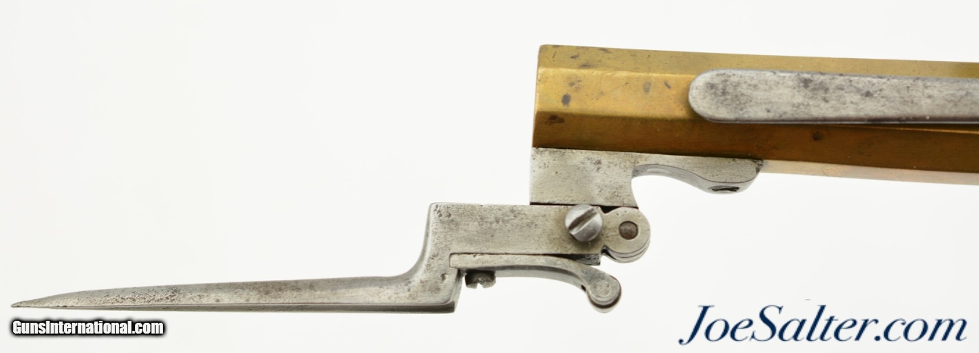 Description: NSN, .58 Caliber, 4 1/2" octagon barrel with a very good, lightly pitted bore. This is a handsome pistol, built along British lines, but devoid of proofmarks, that has an all brass frame and barrel. The brass has an overall dull yellow-ochre patina with some fairly well done foliate engraving along the sides of the box frame. The centrally hung hammer, frizzen, trigger, and trigger guard have a mottled plum-brown and gray patina with some mild pitting along a few of the surfaces. A folding angular bayonet with 2 7/8" blade is mounted on the underside of the muzzle. The bayonet still deploys swiftly and securely, with the catch at the muzzle functioning properly. The sliding safety catch, bayonet, and steel belt hook have a slightly more pewter gray patina than the other iron components. The checkered, bag-shaped walnut grip has light-moderate wear, with small handling marks present throughout. This is a very nice bayonet-equipped pistol, and would make a nice addition to any collection. Antique SOLD Antique: Yes |