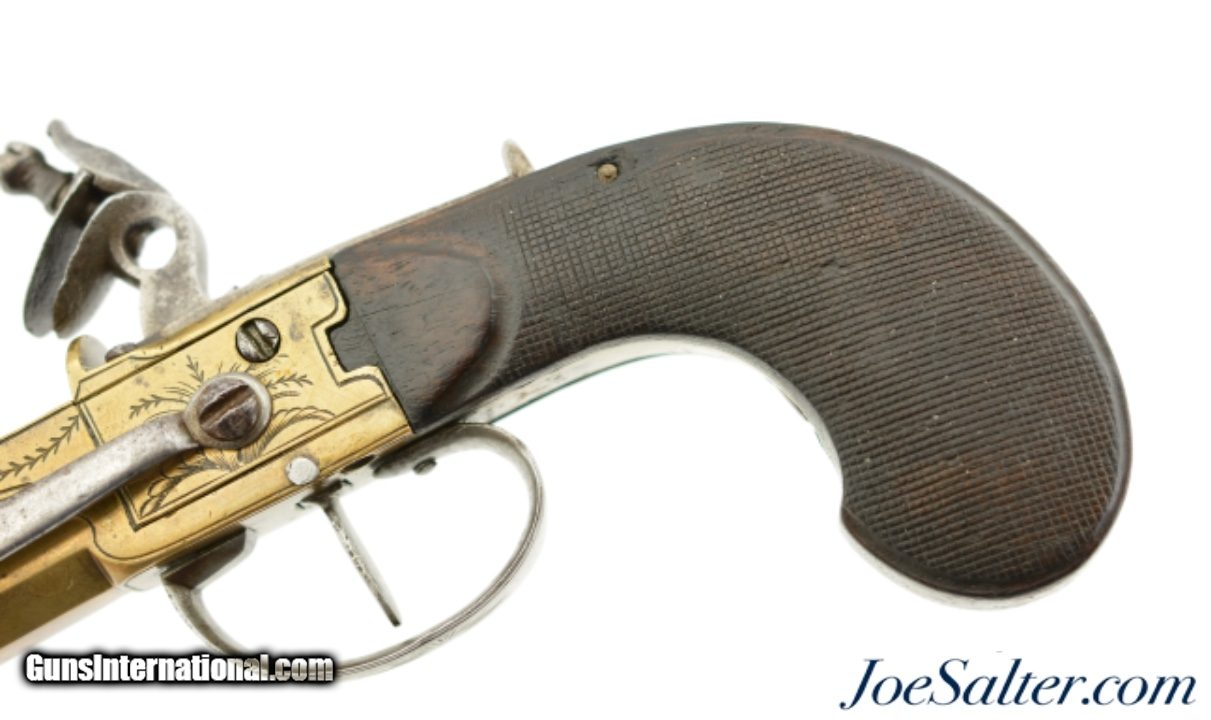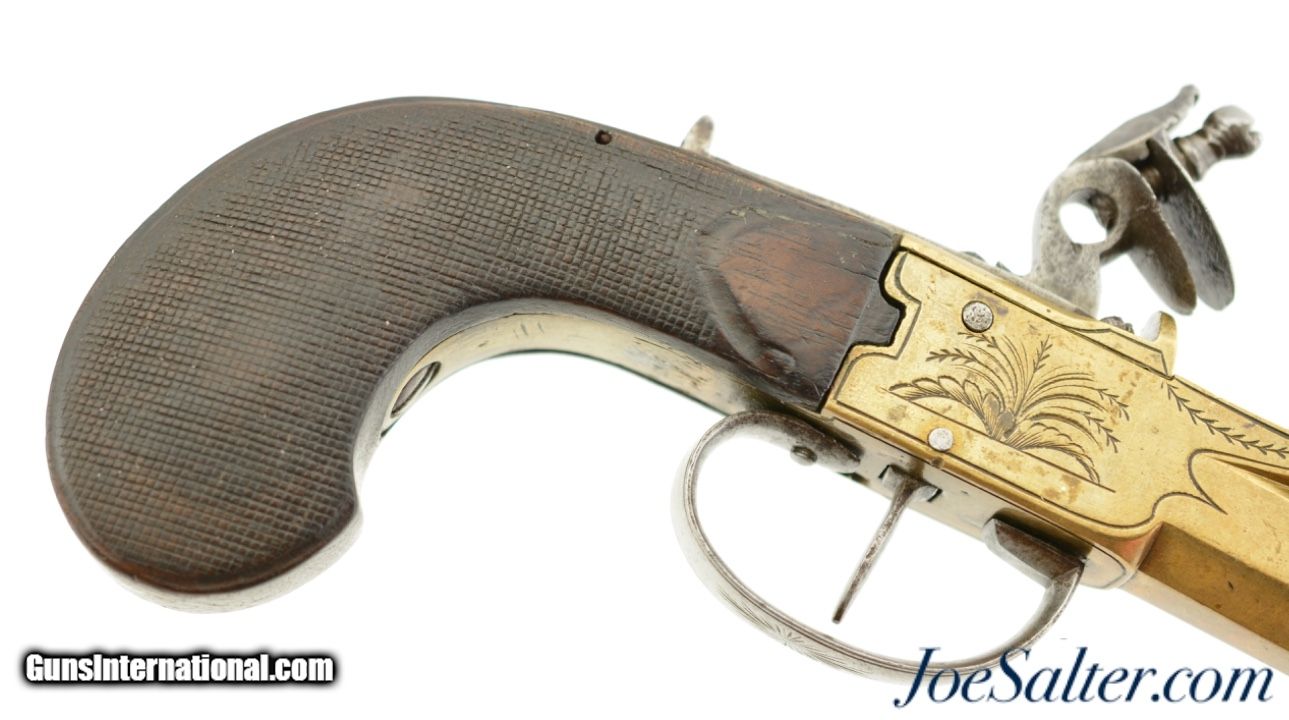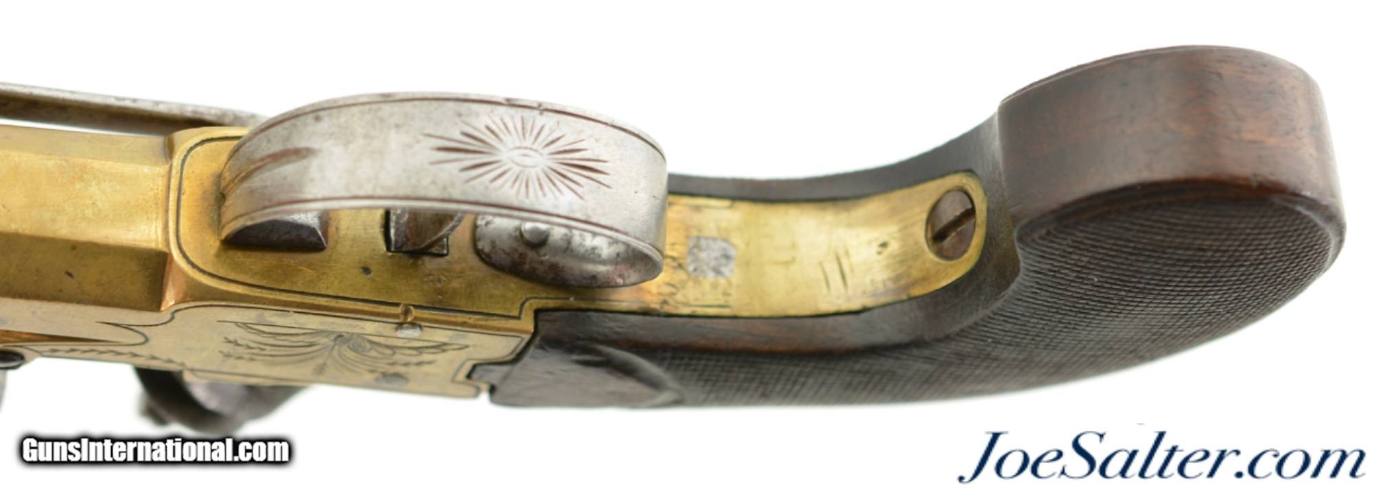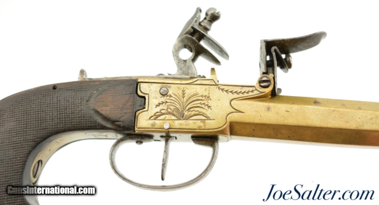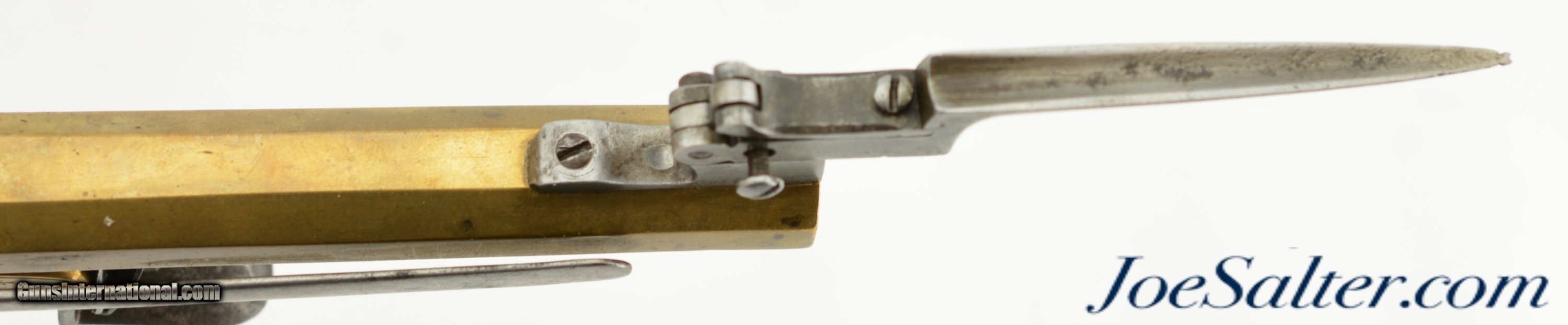 Description: NSN, .58 Caliber, 4 1/2" octagon barrel with a very good, lightly pitted bore. This is a handsome pistol, built along British lines, but devoid of proofmarks, that has an all brass frame and barrel. The brass has an overall dull yellow-ochre patina with some fairly well done foliate engraving along the sides of the box frame. The centrally hung hammer, frizzen, trigger, and trigger guard have a mottled plum-brown and gray patina with some mild pitting along a few of the surfaces. A folding angular bayonet with 2 7/8" blade is mounted on the underside of the muzzle. The bayonet still deploys swiftly and securely, with the catch at the muzzle functioning properly. The sliding safety catch, bayonet, and steel belt hook have a slightly more pewter gray patina than the other iron components. The checkered, bag-shaped walnut grip has light-moderate wear, with small handling marks present throughout. This is a very nice bayonet-equipped pistol, and would make a nice addition to any collection. Antique SOLD Antique: Yes |