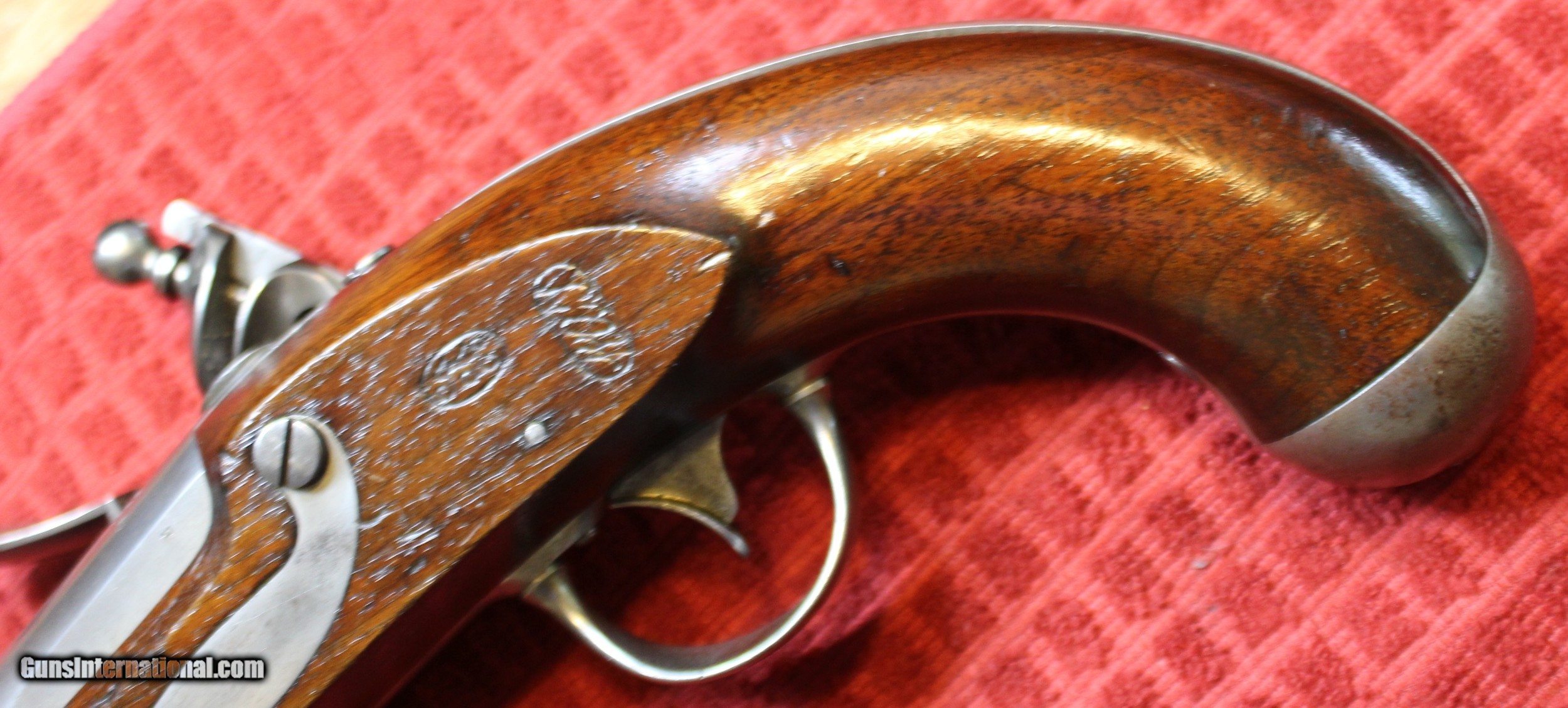 Description: Exceptional Model 1836 Johnson Flintlock Pistol dated 1842 .54 Caliber Manufactured in 1842 by Robert Johnson of Middletown, Connecticut, with the distinctive swivel ramrod with button-shaped head, barrel band with strap extension that joins the side plate and integral back strap and buttcap. The barrel has a brass half-moon front sight and an oval rear sight is located on the tang and the lock has a detachable fenced brass flash pan. "U.S./R. JOHNSON/MIDDN CONN/1842" is stamped on the lock plate and the left side of the barrel is marked with the proof and inspection marks ("US/JCB/P"). A small "H" sub-inspection mark is stamped on the left barrel flat, trigger guard and underside of the flash pan. The left stock flat is stamped with the script initials of the Ordnance sub-inspector "JCB" and the Ordnance final inspector "WAT" in oval cartouches. The pistol barrel and furniture are finished "National Armory Bright" and the lock has a dark casehardened finish and niter blue frizzen spring. The black walnut stock has is oil finished. The Model 1836 pistol was the last U.S. flintlock pistol and is considered by many experts to be the most attractive and best designed of all U.S. military flintlock handguns. The Model 1836 pistol was the primary handgun issued to the U.S. Dragoons and Mounted Rifles during the Mexican War. Most Model 1836 pistols were subsequently converted to percussion. Exceptional overall condition. The pistol is in the original flintlock configuration and appears to be as issued condition. It shows only very limited storage wear. The barrel, side plate/barrel band, ramrod, trigger guard and back strap/buttplate retain the "National Armory Bright" finish. There are traces of storage pitting on the barrel and the bright finished components. The lock plate, hammer and frizzen have 60% plus of the dark casehardened finish. The frizzen spring retains 60% plus of the fiery niter blue. The brass flash pan has a mellow patina. There is no flash pitting on the barrel or lock components and the pistol appears to have been fired. The markings on the barrel and lock plate are sharp. The stock is in exceptional condition with raised feathered grain and sharp edges. The Ordnance sub-inspector and final inspection stamps are extremely crisp. This is an exceptional example of an important U.S. flintlock pistol. It would be very difficult to improve upon this pistol. The pictures show condition as best we can. We tried to get pictures of every flaw, mark, ding, makers mark or whatever we could find. We can only post 25. If you want more, please email. Just be patient as our internet connection in the country is slow. The item you see in the pictures is the one you receive. Look closely at the pictures as what you see in what you get. This came from the estate of an FFL/SOT Gun Smith, Gun Store that is out of business. This is or was inventory. The estate also was an avid collector of all types. Please check the pictures to check condition. There will be countless other listings from this inventory over the next 4 to 5 years. We are selling for the store. This is NOT a liquidation. There are no lists and will be no lists. Just keep checking the other listings Please check our other listings for the items. As is means AS IS. There is no refund You are welcome to check out our webpage or facebook page at P&T Partners Shipping is included and full insurance to you. An adult will sign for this at the receiving end. Price is for Certified Funds meaning Certified Check or USPS Money Orders. For Credit Cards or Plastic of any kind, add 3%. WE DO ACCEPT PERSONAL OR BUSINESS CHECKS, BUT THERE IS A GRACE PERIOD OF 10 BUSINESSS DAYS ON CHECKS FROM THE DATE OF DEPOSIT. WE DO OFFER A LAYAWAY PLAN. YOU CAN LAYAWAY up to 90 DAYS . WE ALSO REQUIRE A 25% DOWN PAYMENT ON TOTAL OF LAYAWAY SALE in 7 Business days. LAYAWAYS ARE NON- REFUNDABLE. There are NO, repeat NO Credit Cards allowed on Lay-a-way. Personal or business check on any payment but the final payment. Last payment Certified funds ONLY. . I post on many of the firearms forums as PT-Partners. PT-Partners is a retail/FFL Dealer. For those that are local, there is no Face To Face. On Line means On Line PLEASE NOTE: This is an Antique Firearm NO FFL is required. SOLD Antique: Yes |