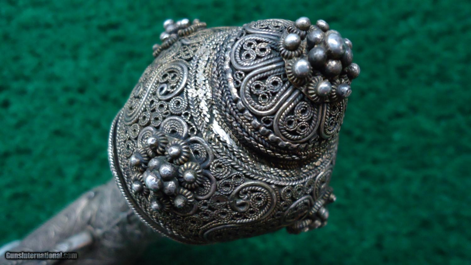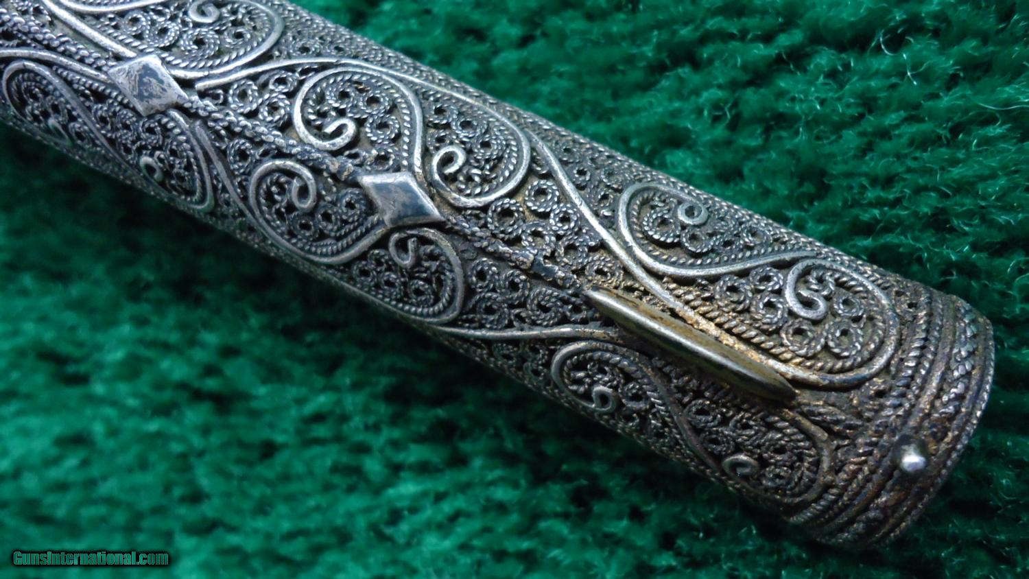 Description: Gold, silver and high quality workmanship describe this pistol. This is what looks like engraving but is instead very intricate metal work done on the whole gun. How this was accomplished? It certainly came from the hands of some Master Craftsman of the period. Cal is about 60. Overall condition is VG. Bbl is silvery and has likely been cleaned. It does show the Damascus pattern on the bbl. The hammer and flintlock springs are very heavy from years of not using them. I doubt that this gun was used very much at all if any. It looks like it may have been some sort of a presentation gun for someone very important. Please take a close look at the photos. The intricate metal work is simply amazing! Leroy Merz Antique Firearms specializes in antique and vintage Winchesters and other fine American firearms. Since 1965 Mr. Merz has taken part in the world of firearms and has been a contributor to many well known reference books. Just recently we mailed the 126th edition of our privately-published catalog. We have hundreds of additional guns in every price range at our home online. Search for Merz Antiques in google. SOLD Antique: Yes |