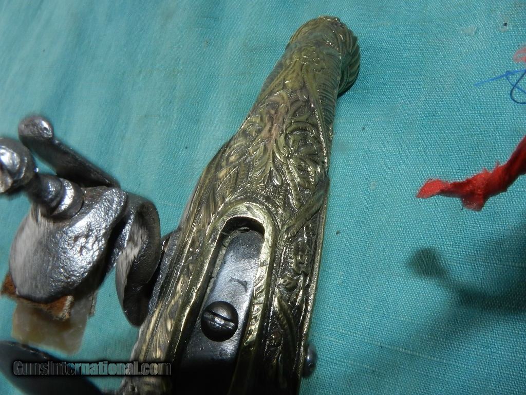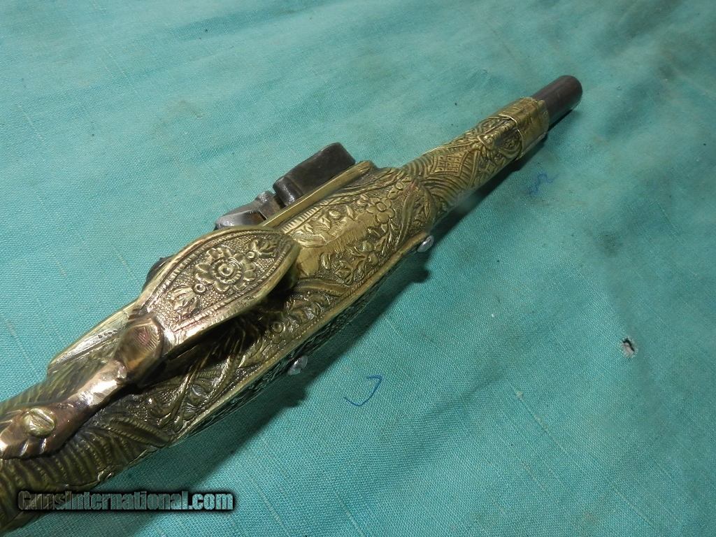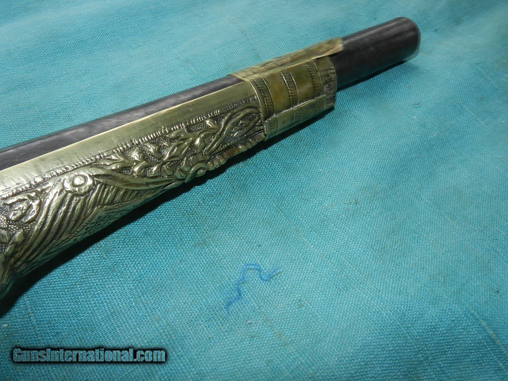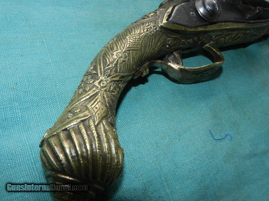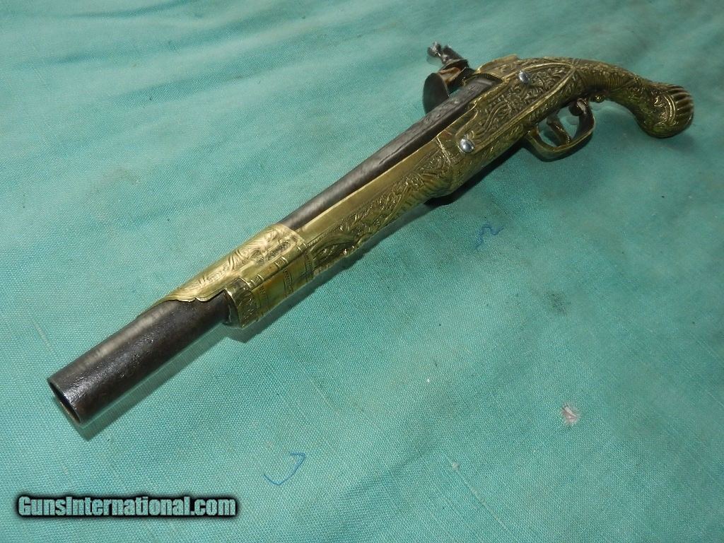 Description: SOLD An unusual , not seen an early soid brass pirate ship's captain belt ;pistol measures about 16" overall, with a figuraly deep engraved barrel of 9 3/4" long and about .62 caliber. The cast brass stock has an eary bannana shaped lock that doesn't work, I can see a leather washer under the hammer to stabilize the hammer, Cocoking it will break free the hammer as the mainspring is spent. Overall a colorful eary flintlock that displays well, and sorry it doesn;t work as these were used for 100 plus years and often rebuilt several times. Back of the trigger guard had been repaired but is very soild . Rare to even see one of these.When buying a gun always have it examined by a competent gunsmith before shooting. To buy a gun from me you must get a direct email for me, with details, and shipping cost. We don’t have a web site .I prefer money orders or a check. Item ships when funds come in. I try to keep guns affordable, which means I make less money than most dealers. You won’t get altitude sickness, or nose bleed, with my prices! I consistently have the best selection of older guns If you attempt to buy, you must still contact us for details . Best to email to buy. Sometimes a local person can stop buy and purchase before the gun is removed. Sometimes not home to get calls. Some guns are required shipment to a gun dealer near you for a transfer to you when it arrives. Otherwise many older or black powder guns ship to your door. With the widest selection of older guns at great prices, We don’t have a store, and sell on the internet only. I’m easy to get along with. Thank You SOLD Antique: Yes |