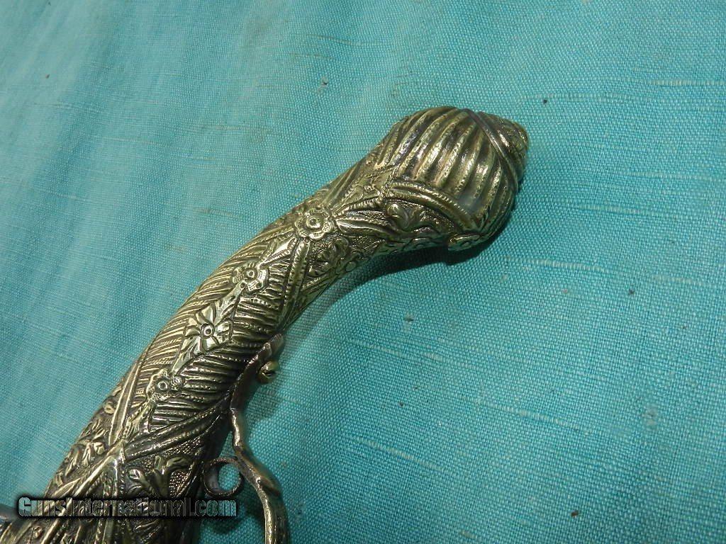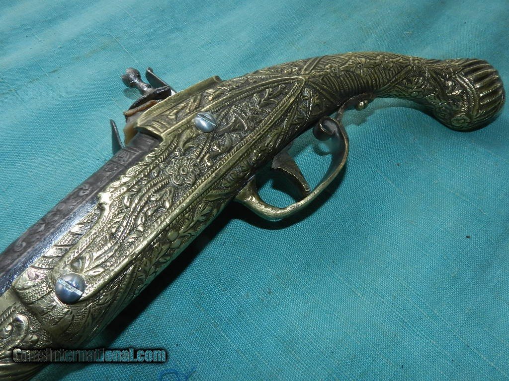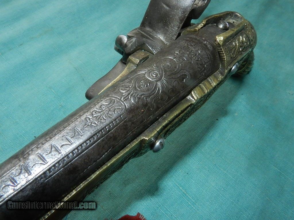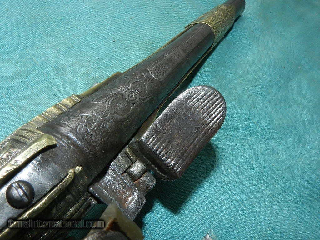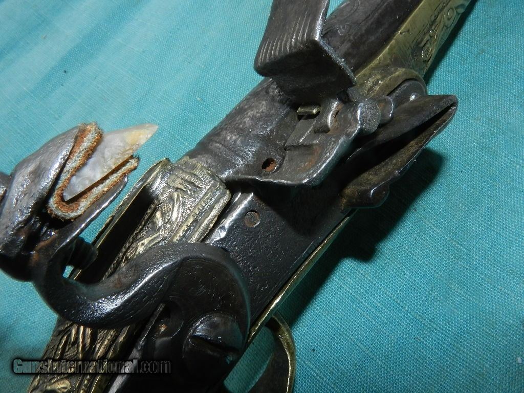 Description: SOLD An unusual , not seen an early soid brass pirate ship's captain belt ;pistol measures about 16" overall, with a figuraly deep engraved barrel of 9 3/4" long and about .62 caliber. The cast brass stock has an eary bannana shaped lock that doesn't work, I can see a leather washer under the hammer to stabilize the hammer, Cocoking it will break free the hammer as the mainspring is spent. Overall a colorful eary flintlock that displays well, and sorry it doesn;t work as these were used for 100 plus years and often rebuilt several times. Back of the trigger guard had been repaired but is very soild . Rare to even see one of these.When buying a gun always have it examined by a competent gunsmith before shooting. To buy a gun from me you must get a direct email for me, with details, and shipping cost. We don’t have a web site .I prefer money orders or a check. Item ships when funds come in. I try to keep guns affordable, which means I make less money than most dealers. You won’t get altitude sickness, or nose bleed, with my prices! I consistently have the best selection of older guns If you attempt to buy, you must still contact us for details . Best to email to buy. Sometimes a local person can stop buy and purchase before the gun is removed. Sometimes not home to get calls. Some guns are required shipment to a gun dealer near you for a transfer to you when it arrives. Otherwise many older or black powder guns ship to your door. With the widest selection of older guns at great prices, We don’t have a store, and sell on the internet only. I’m easy to get along with. Thank You SOLD Antique: Yes |