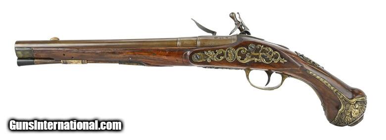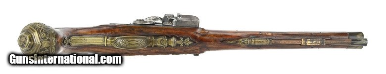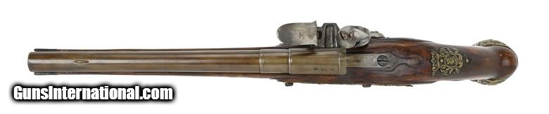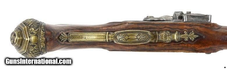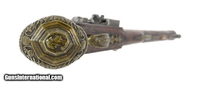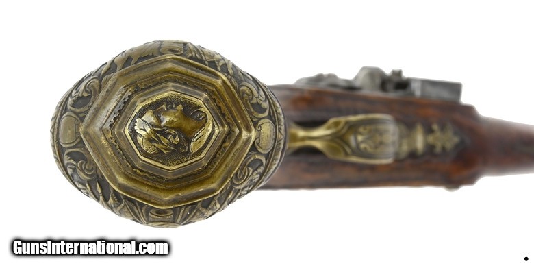 Description: Fine Pair of English Flintlock Pistols. Made approximately 1700-1720. Bore is .65 caliber. Barrel length 12” and overall length 19 ¾”. Barrel proof is for London with Crown CP and Crown V for final inspection proof. Barrels are three stage. Tail of lock is engraved with a panoply of arms. The name Pasual is also on the tail of the lock. No other makers marks are present. This is a robust pair of pistols. The engraved and chiseled brass mounts with a panoply of arms in high relief consisting of drums, canons, lances, banners and armor. The butt cap is that of a man with oak leaf wreath about his head much like a Roman emperor. The stock is inlaid with royal device with crown and cameo of a figure with plumed helmet. The trigger guard is in chiseled in relief. The side plate is very well done with figures of fanciful figures in Rococo scrolls and a cameo of the same helmeted figure as mentioned before. The overall condition of both pistols is excellent. We can only guess that the lack of a maker’s name might be at the request of the owner. Very impressive pair of fine flintlock pistols. SOLD Antique: Yes |