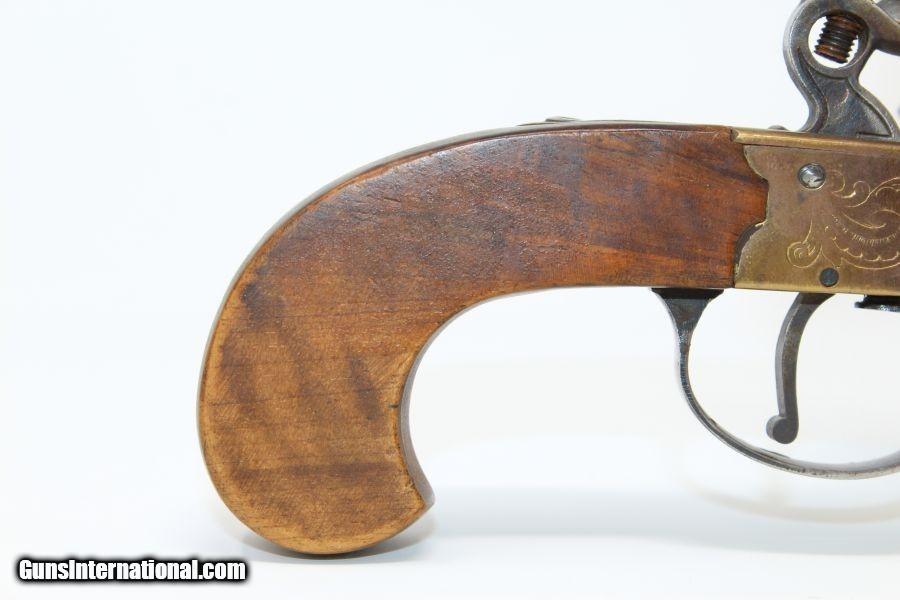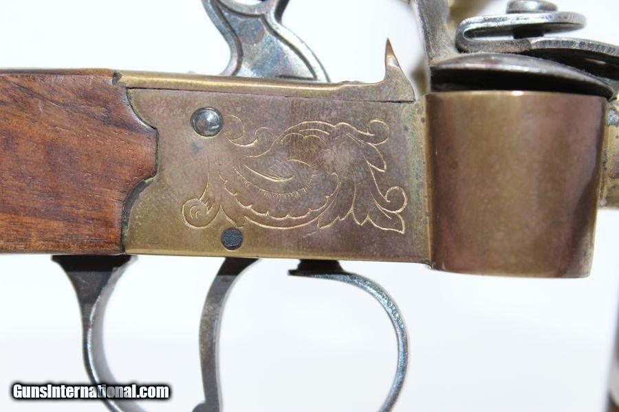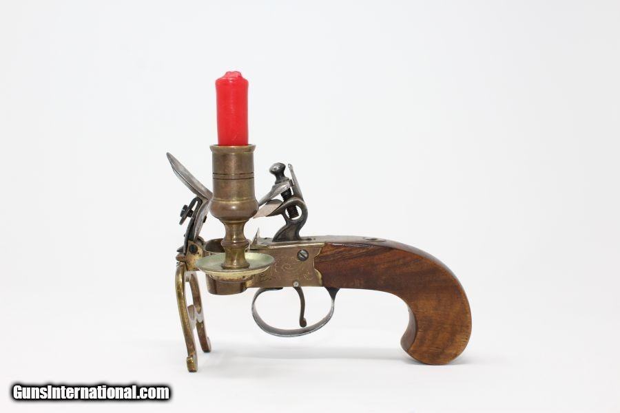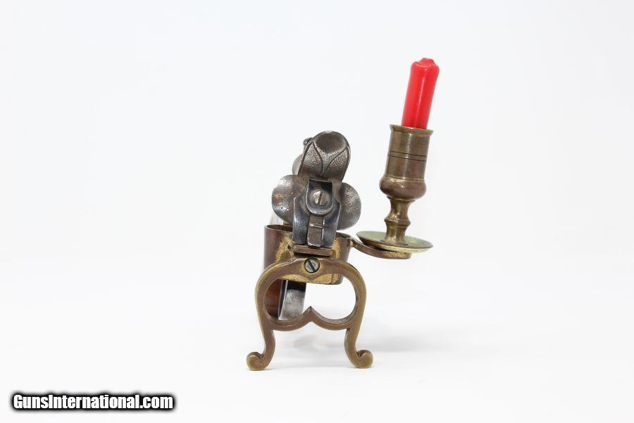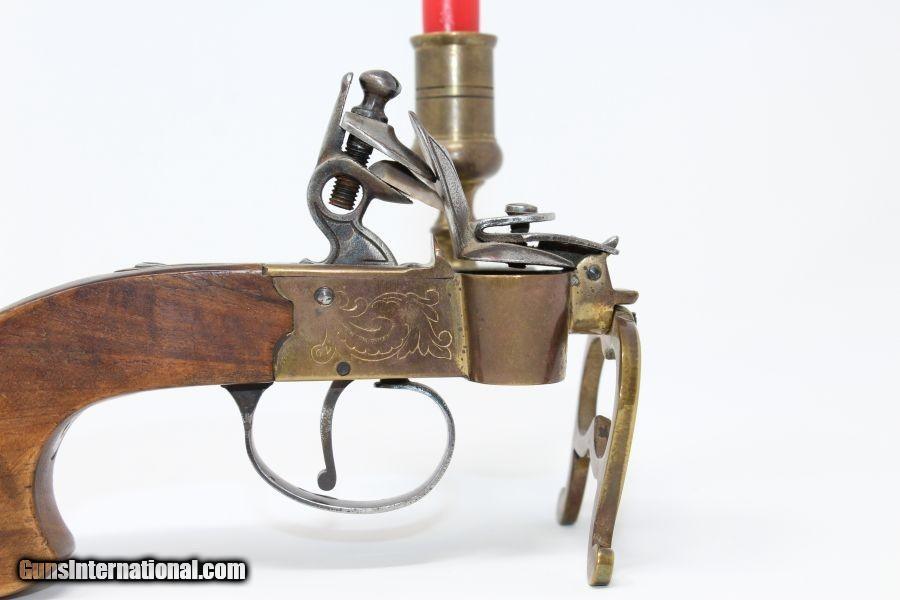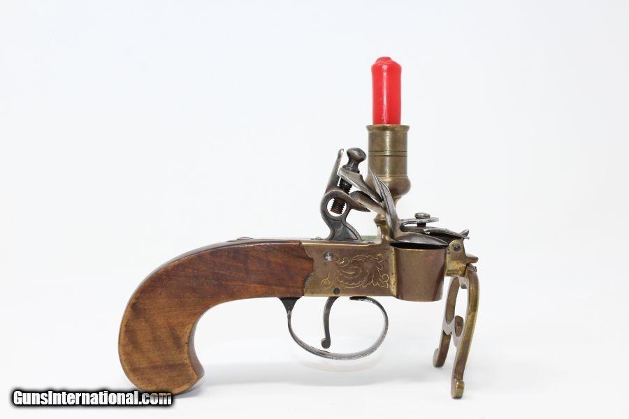 Description: FLINTLOCK Pistol-Form FIRE TINDER Lighter A Neat 18th & 19th Century Gadget to Start a Fire Here we present a Flintlock Tinder Lighter, made in the 20th Century, based off of 18th and 19th Century design. Flint and steel have long been used to start fires. This little gadget made the task a little easier by putting the tinder in the basket under the frizzen so that, when the trigger was pulled, the flint would create sparks against the frizzen and down into the tinder. This one has a small candelabra so that one could apply a candle to the burning tinder for light or to light other things like a fire or lamp. These would have been found in many a household. The overall condition is very good. The metal surfaces are taking on a patina. The mechanism is strong. Overall condition as seen in photos. Very Fast. Very Safe. FREE SHIPPING WORLDWIDE. Delivered directly to your door by express mail! ancestryguns $365 #8086 SOLD Antique: Yes |